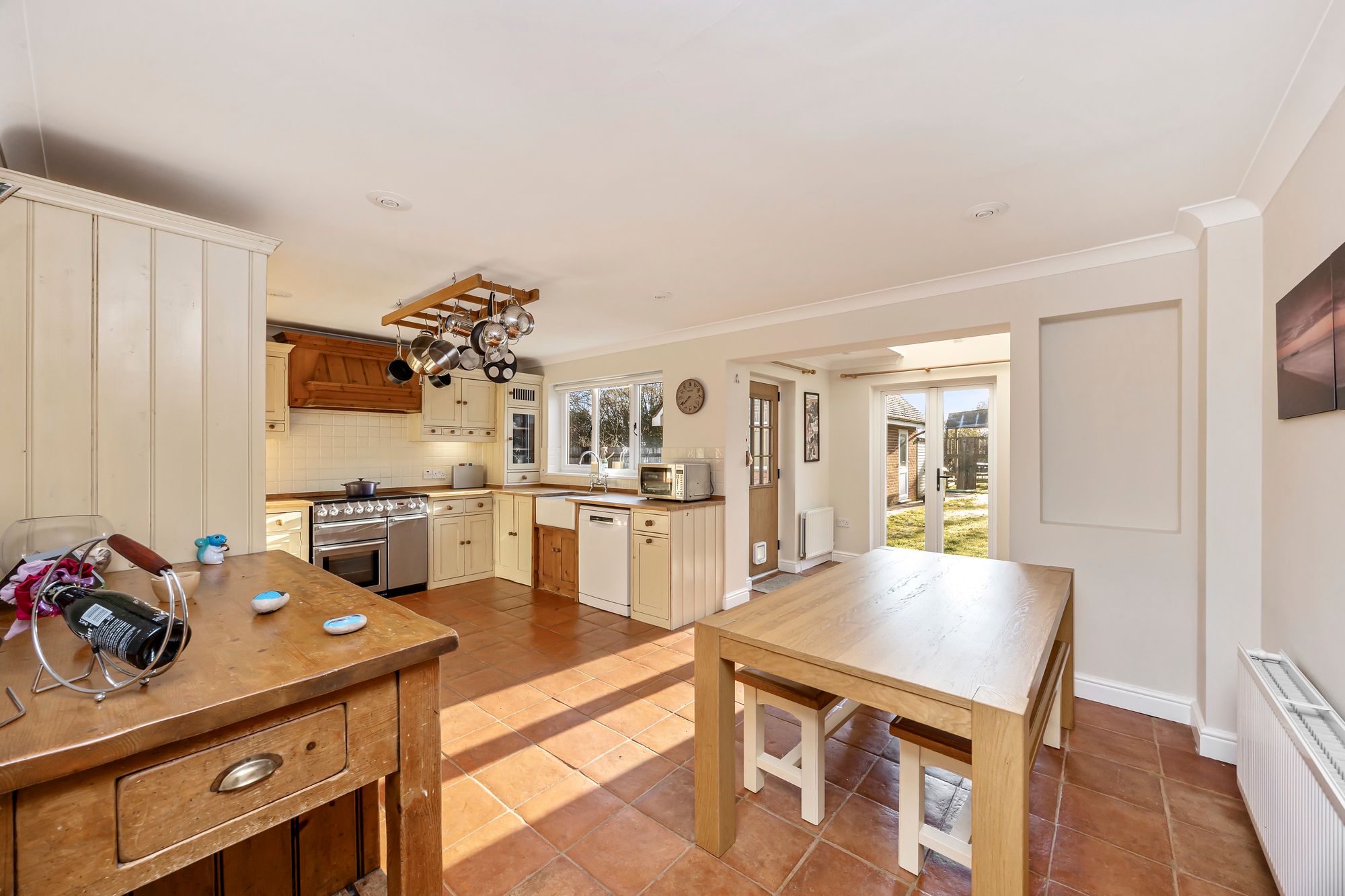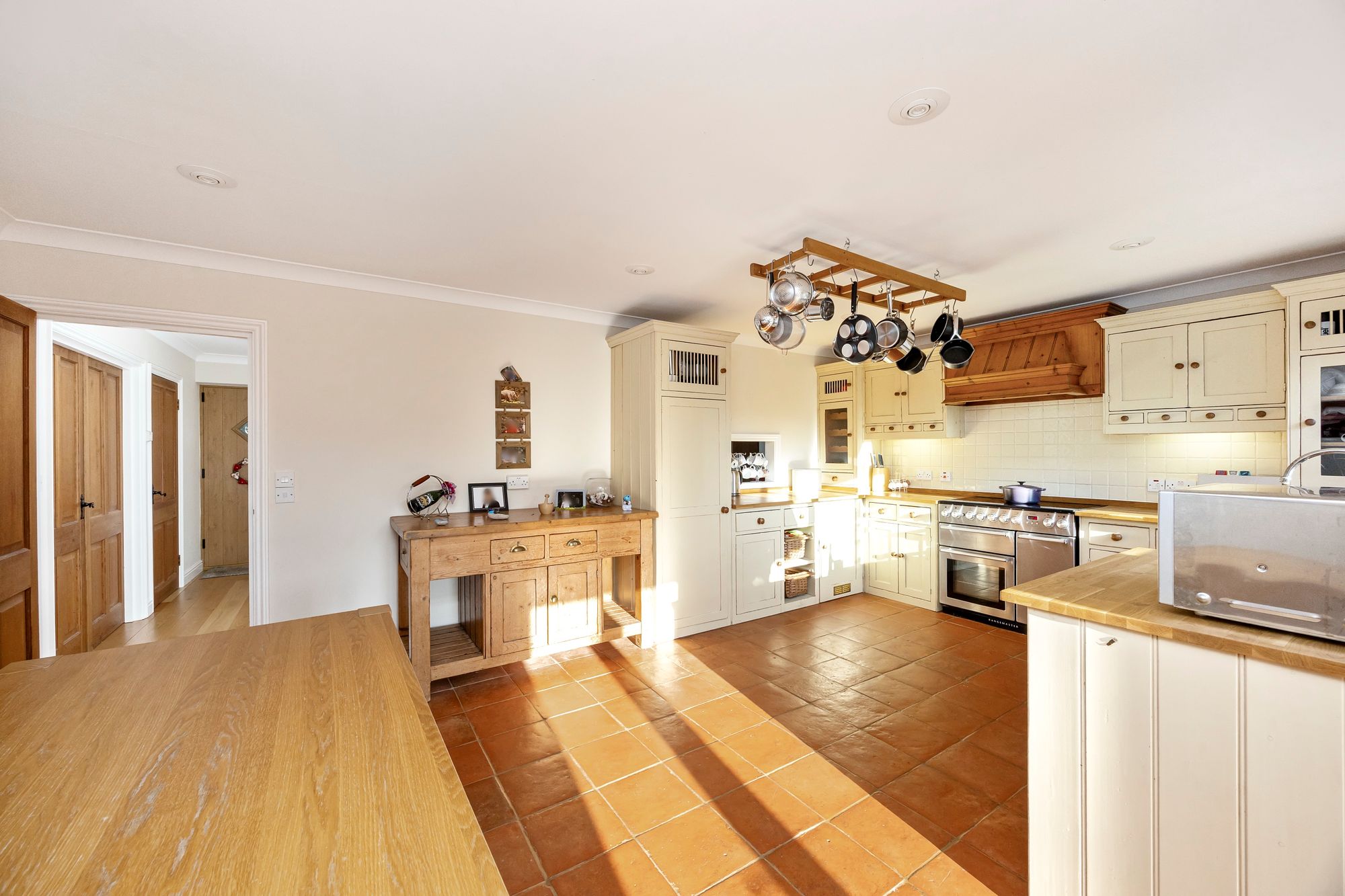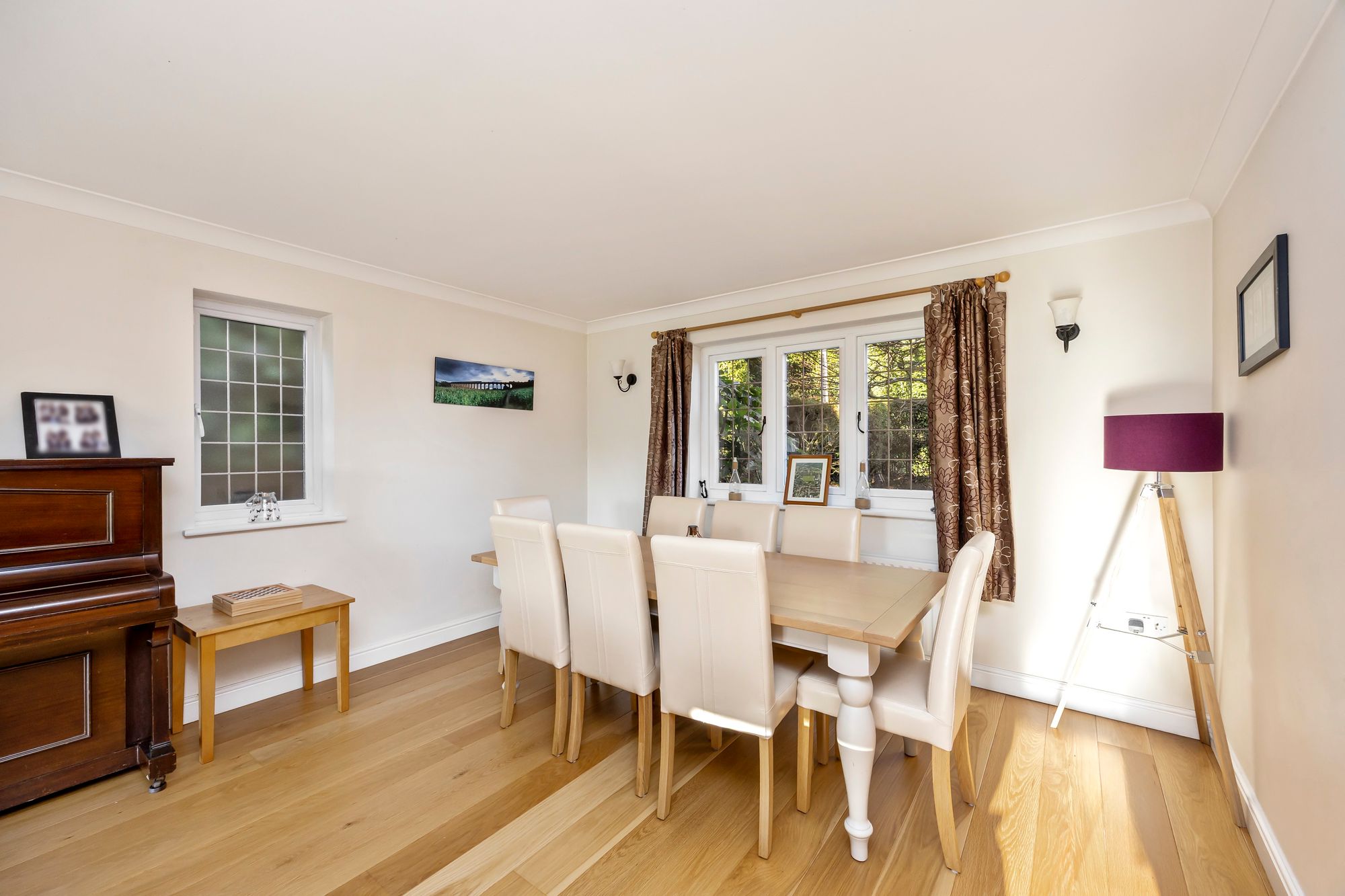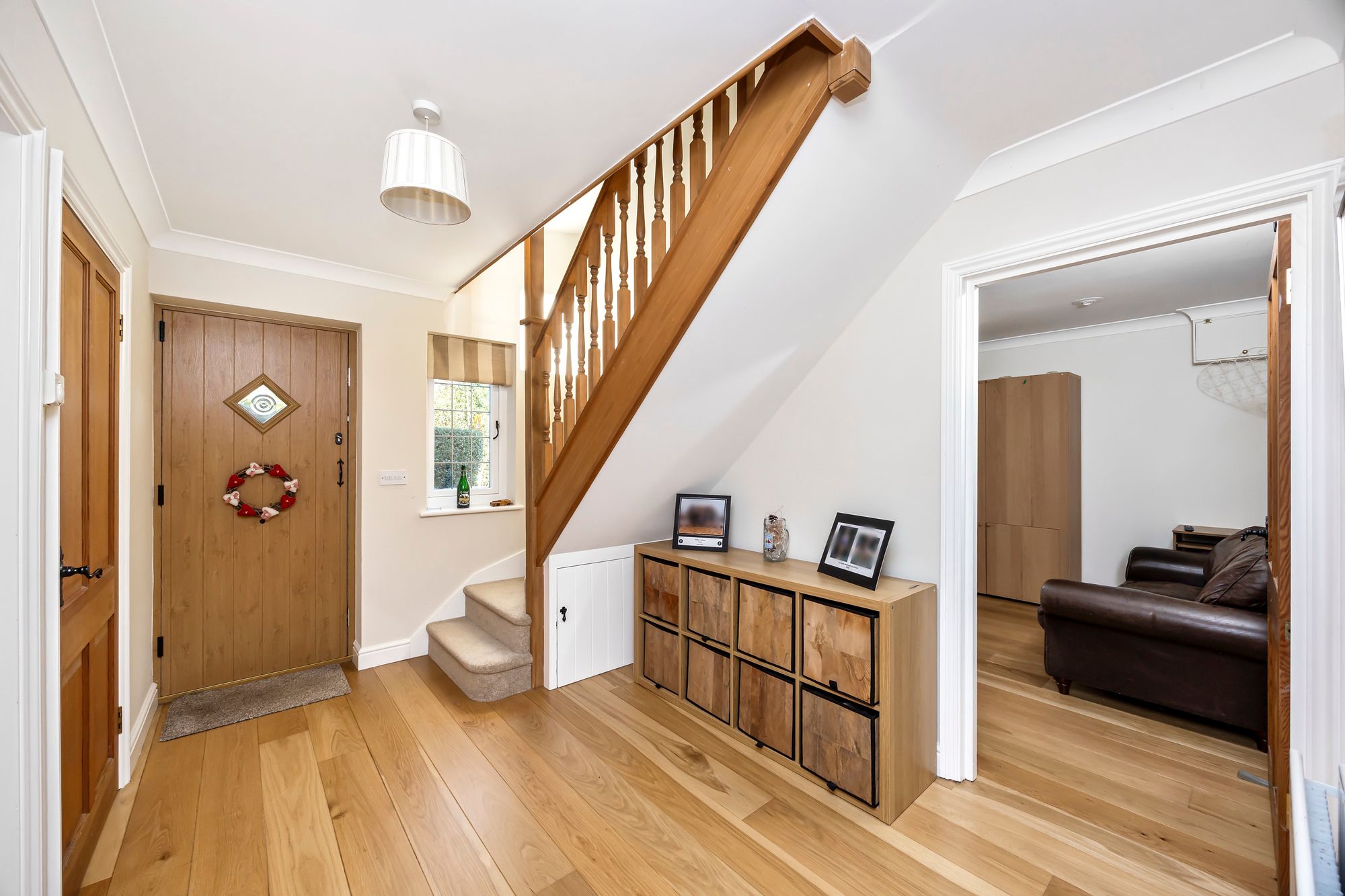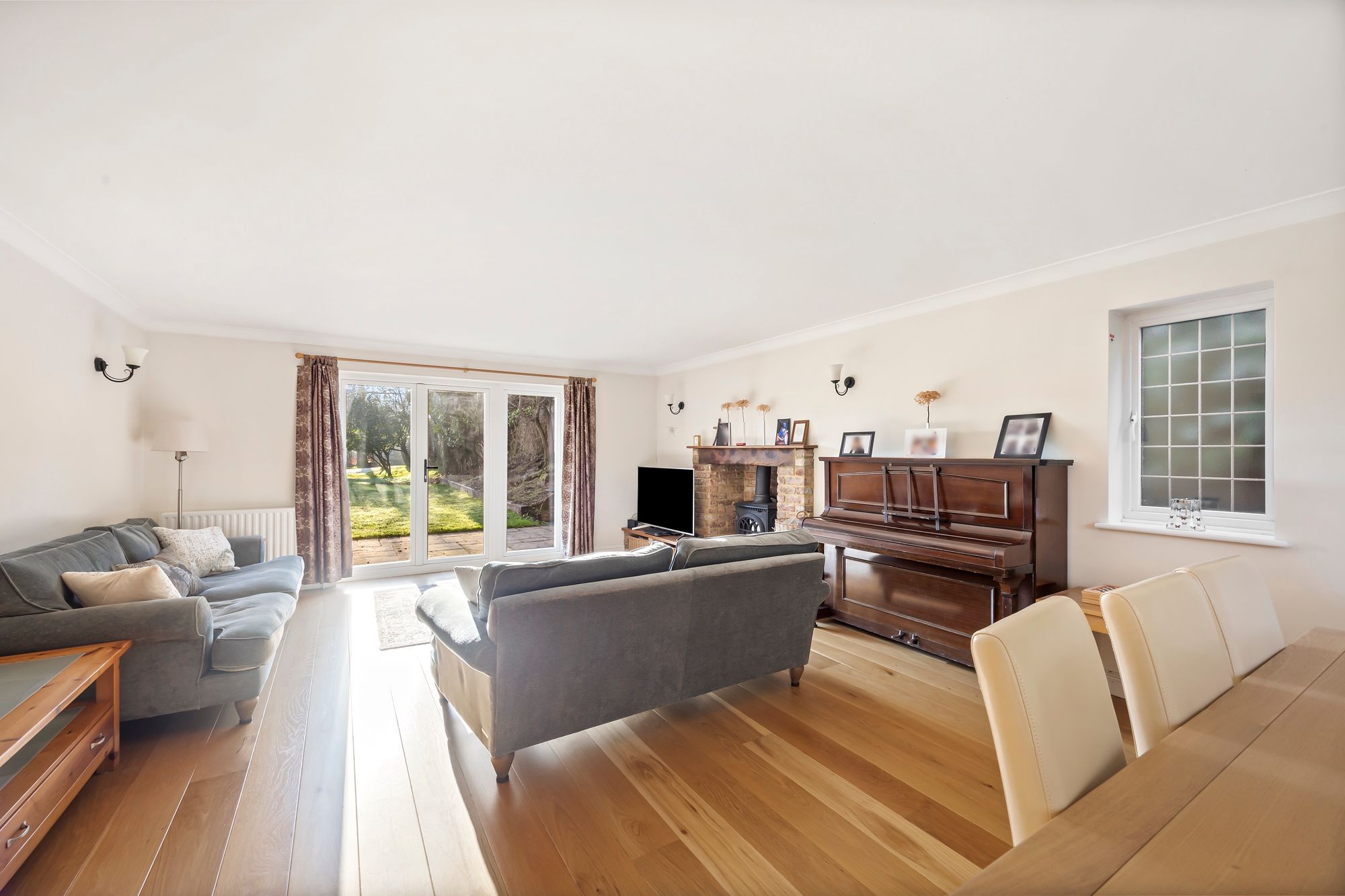 To the ground floor; a generous reception hallway welcomes you and immediately impresses with the quality stripped wood floor which leads through into the sitting and dining/snug room areas. The sitting room is of an impressive size (24’) and has a triple aspect providing a light and airy space. It also features a brick built fireplace incorporating a log burner -ideal for crisp winter evenings. Further space the ground floor includes a separate dining/snug room and a well proportioned kitchen/breakfast/family room - this features a range of quality bespoke kitchen cabinetry with complimenting work surfaces running through, there is space for a range style cooker and ample space for a dining table. A farmhouse style tiled floor runs through. Adjacent to the kitchen is a useful utility/boot room and a direct access out to the rear garden and driveway parking spaces.
