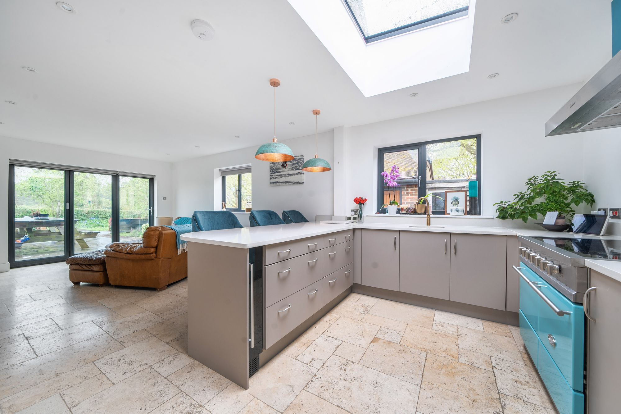 To the rear, the house opens into a more sociable arrangement, with an open-plan kitchen with underfloor heating, dining and family area forming the heart of the home. This space has been designed with both day-to-day living and entertaining in mind, offering ample cabinetry, generous work surfaces and a central breakfast bar. Full-width bi-fold doors open directly onto the garden, allowing for a natural flow between inside and out.