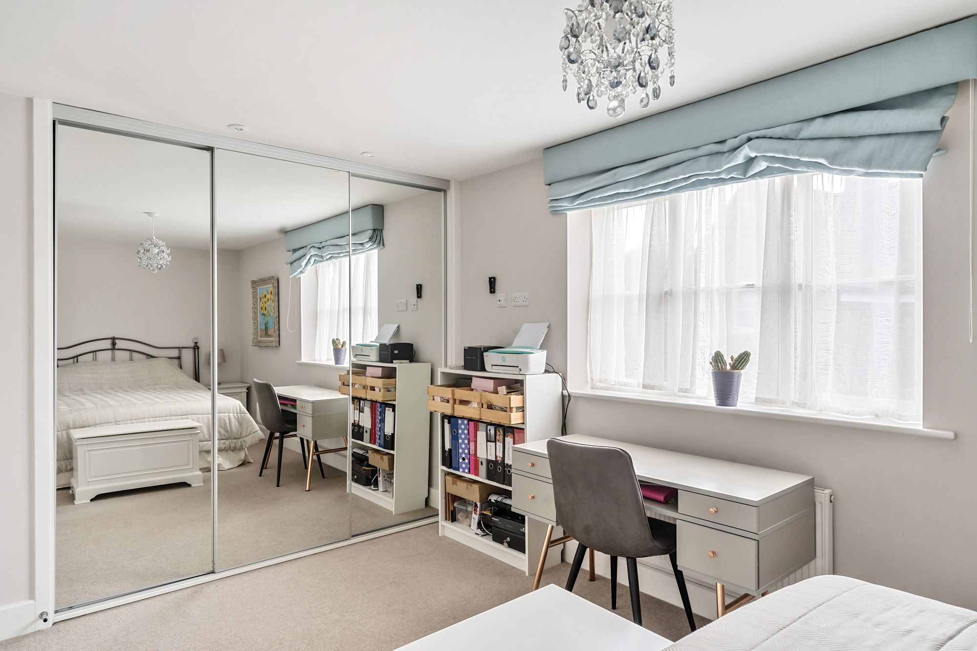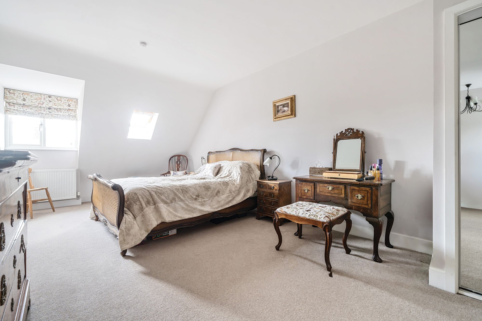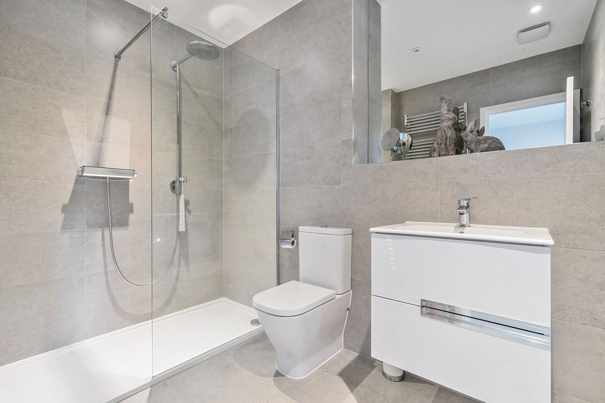 Occupying the second floor is the luxurious master suite, boasting built-in wardrobes with mirrored sliding doors and a tranquil outlook over Midhurst’s rooftops. The ensuite bathroom includes a Hansgrohe thermostatic shower, a separate bath, and sleek Roca vanity units.