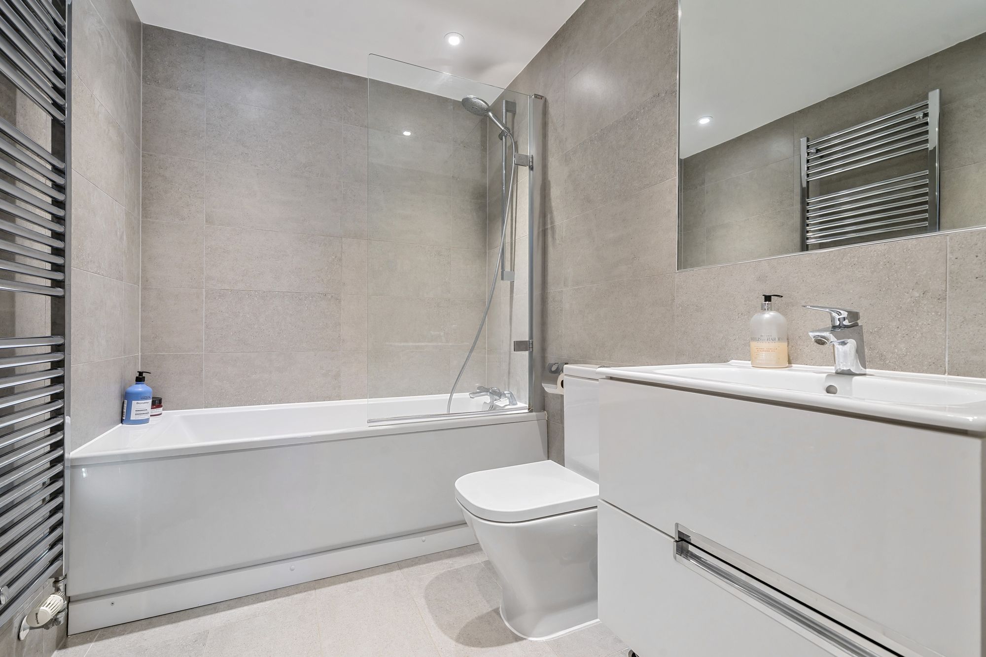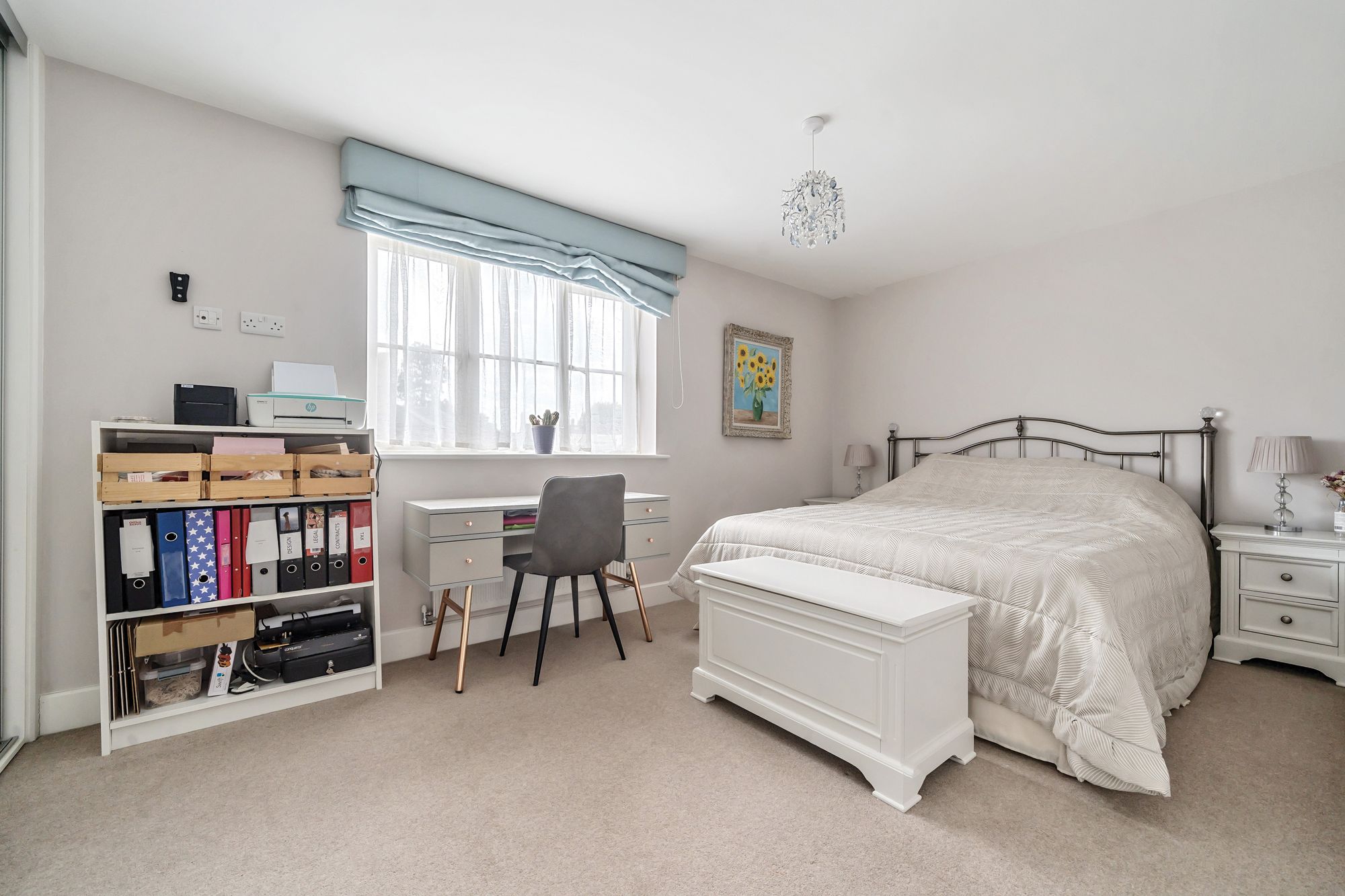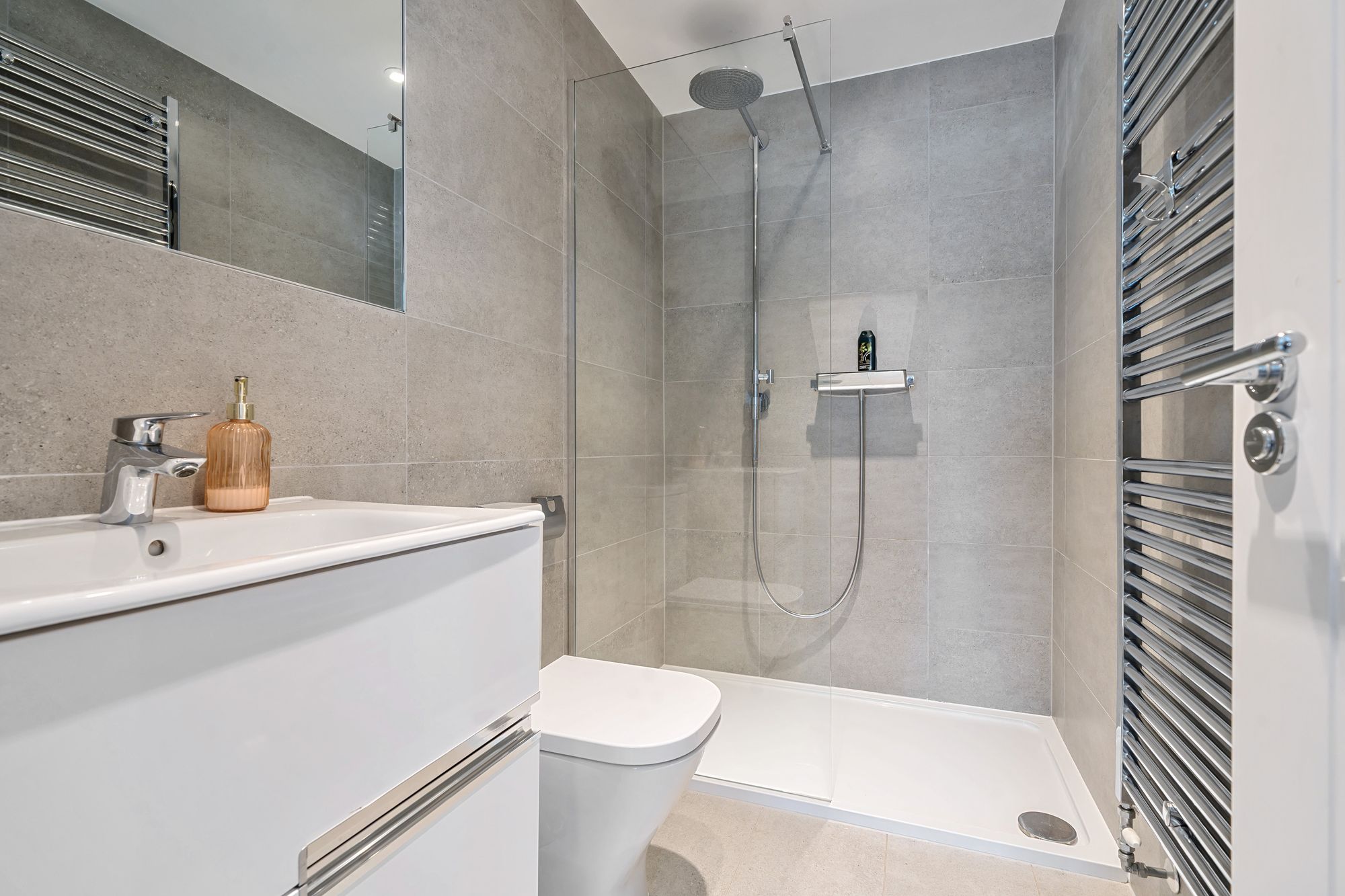 Occupying the second floor is the luxurious master suite, boasting built-in wardrobes with mirrored sliding doors and a tranquil outlook over Midhurst’s rooftops. The ensuite bathroom includes a Hansgrohe thermostatic shower, a separate bath, and sleek Roca vanity units.