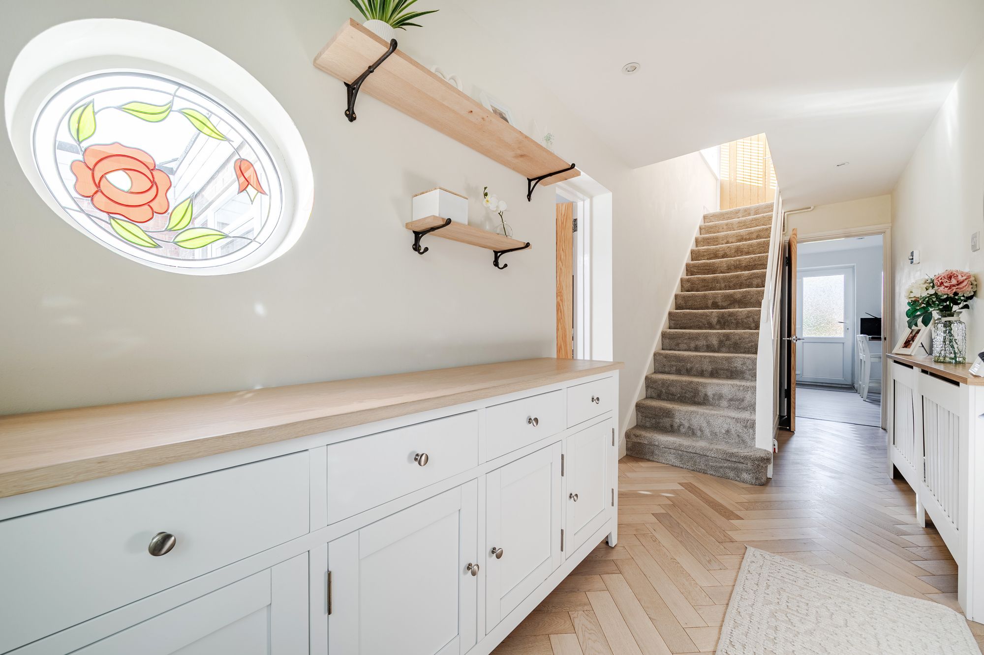 Inside, a light-filled, contemporary interior with premium finishes and attention to detail creates a warm and inviting atmosphere. The entrance hall leads seamlessly into the open-plan sitting and dining area, flowing effortlessly from the kitchen. A log-burning stove forms a cosy focal point for family life, while the dining space accommodates gatherings with friends or family meals. Bespoke shutters frame the front window, and elegant herringbone flooring runs throughout the ground floor.