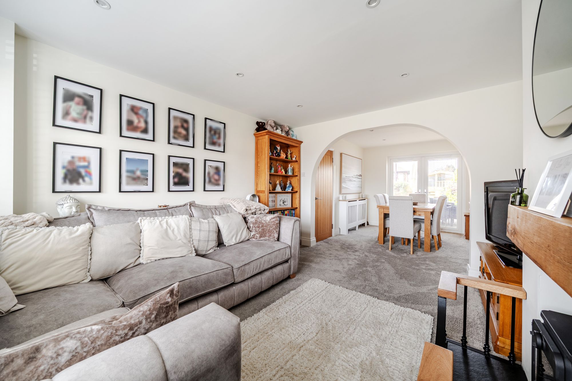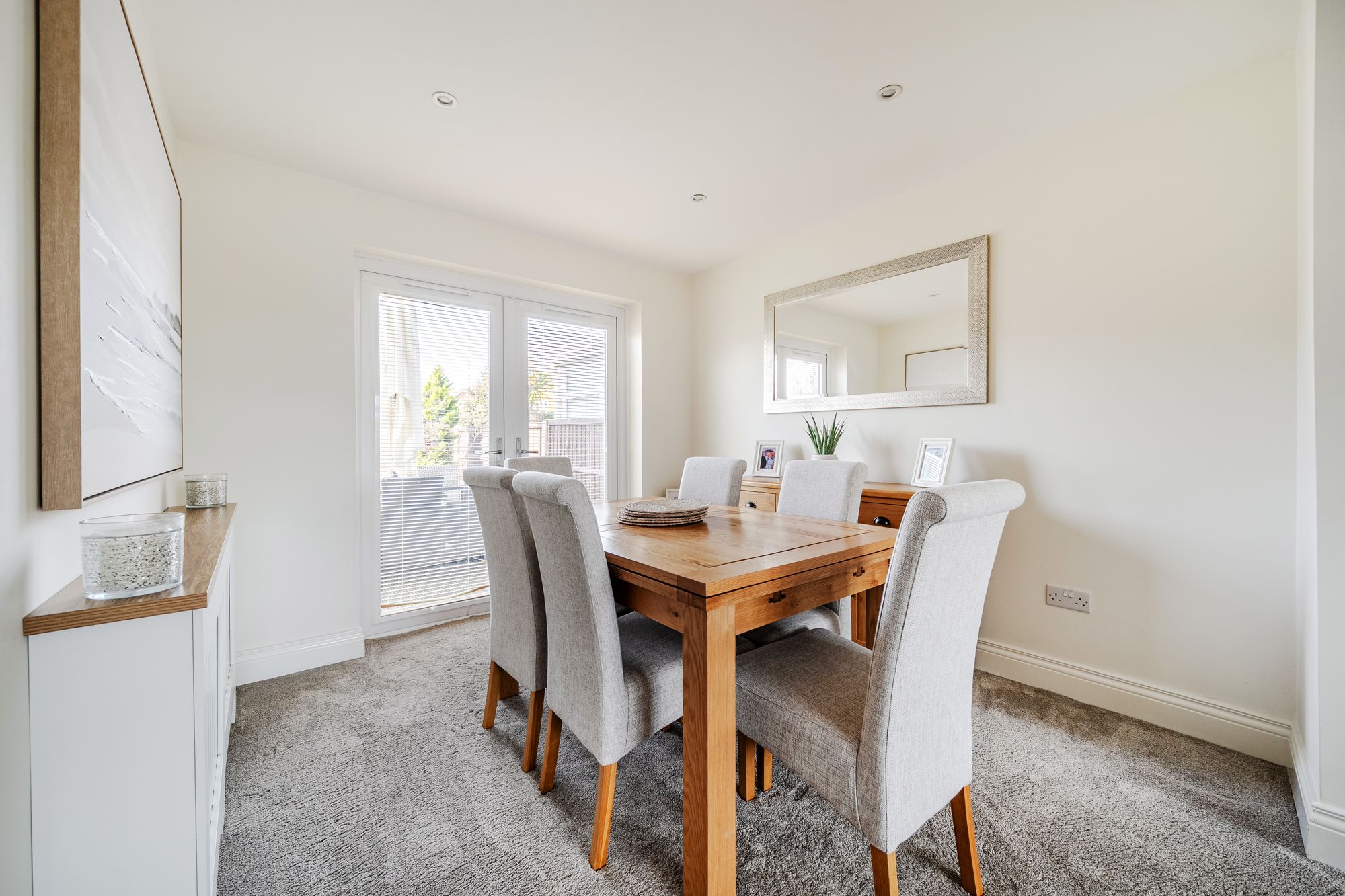 The heart of the home is the kitchen and breakfast area, a bright, sociable space with modern cabinetry, a breakfast bar, and room for casual dining. French doors lead directly to the west-facing garden, ideal for entertaining or relaxing on summer evenings.