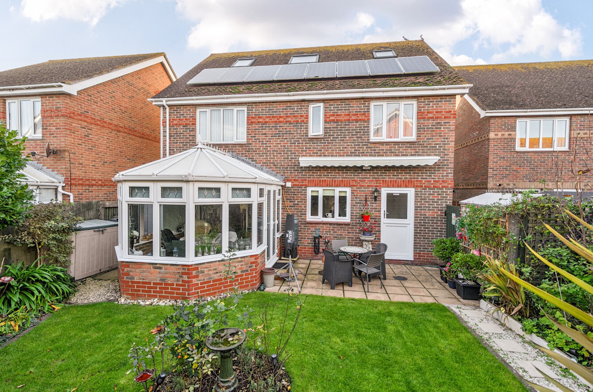 Nestled within close proximity to the beach, this well presented detached house offers a harmonious blend of comfort and style. Spanning across three floors, this property boasts five bedrooms, 3 with built in wardrobes - including a main bedroom with an en-suite shower room, a versatile top floor bedroom/studio/cinema room, and a range of living spaces such as two reception rooms, a conservatory and a well-equipped kitchen with integrated appliances. The property further features a family bathroom and two cloakrooms (one on the ground floor and one on the top floor), an 8-panel, 2kw solar system, a driveway for two cars and a garage.
