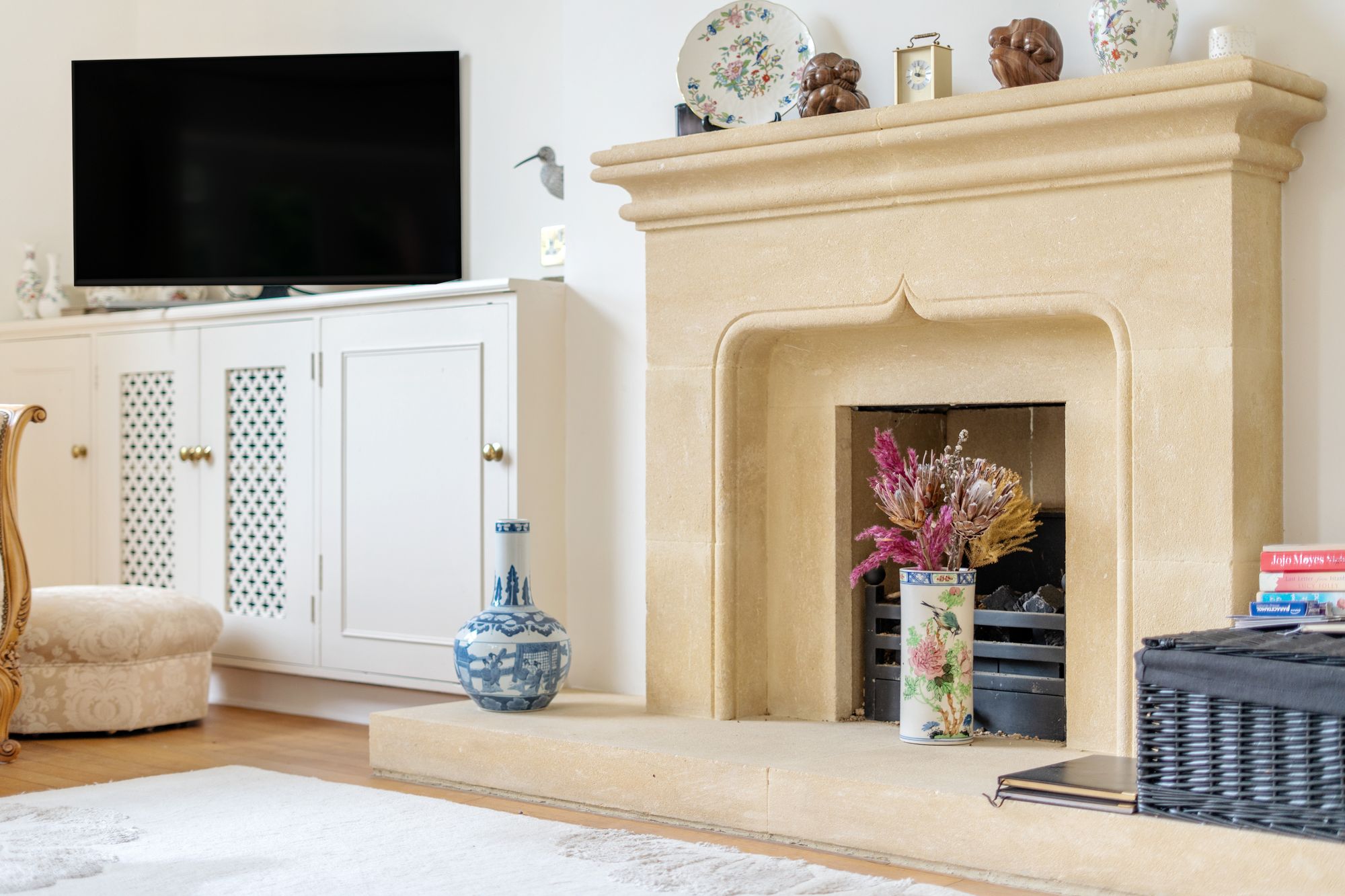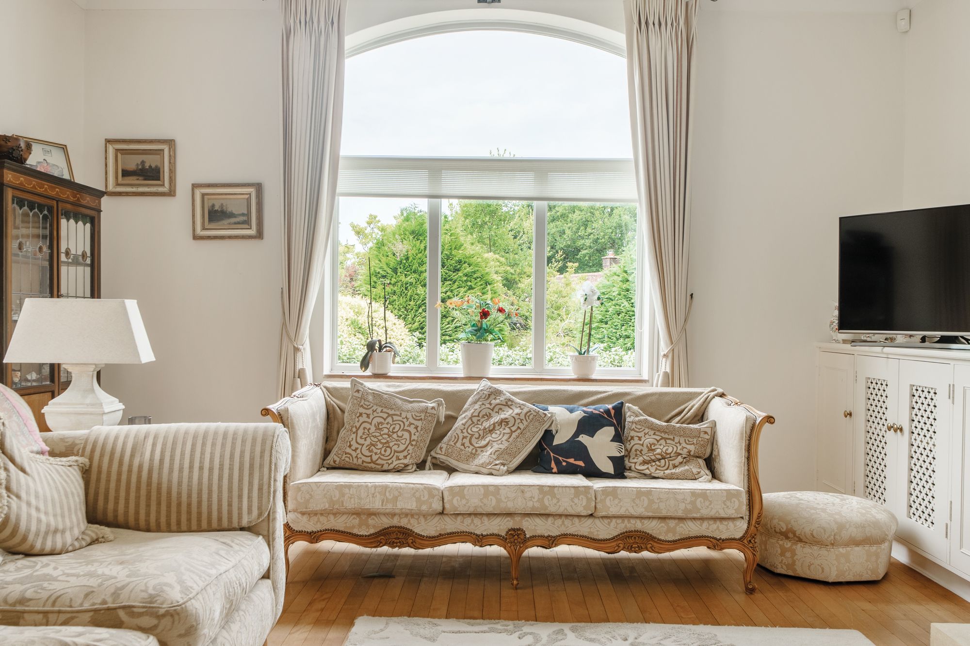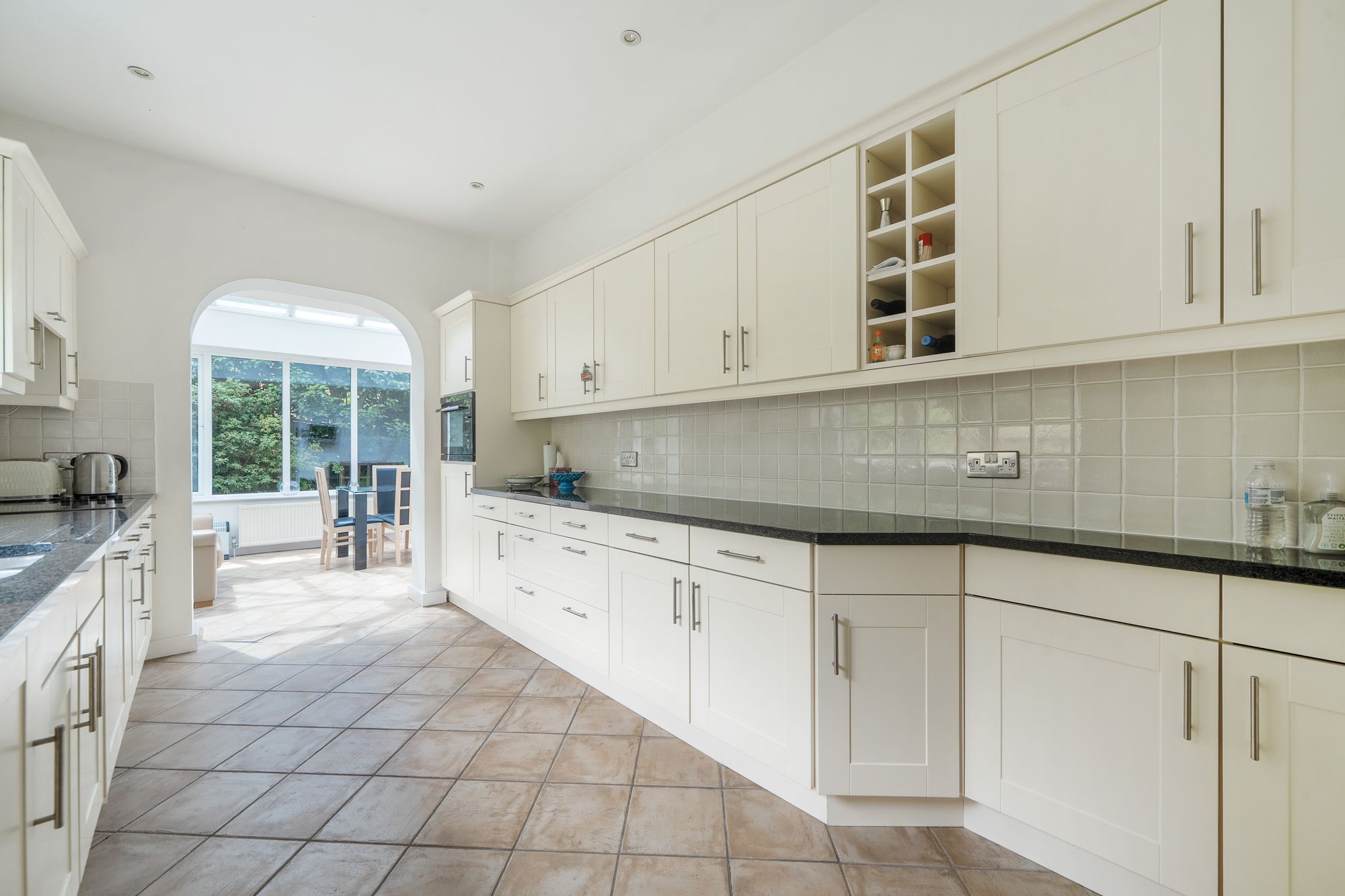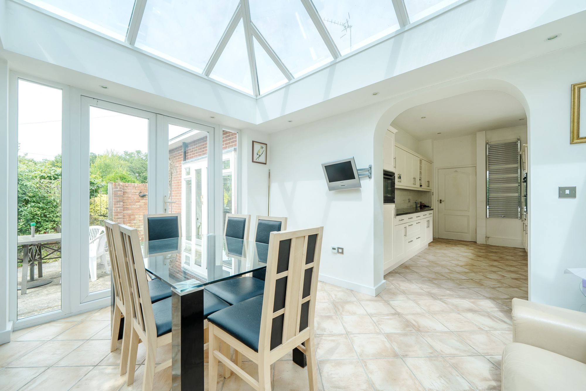The accommodation comprises a spacious entrance hall with cloaks cupboard and separate utility cupboard, leading through to a stunning double-aspect sitting room featuring high ceilings, a striking stone fireplace with gas coal-effect fire, and patio doors opening onto a private outdoor dining area. The kitchen is beautifully appointed with a range of integrated appliances including a double oven, dishwasher, and fridge/freezer, and enjoys a pleasant outlook over the rear garden. An arched opening leads through to the orangery – a light-filled space that makes the most of the garden views and offers a tranquil spot to relax or entertain.