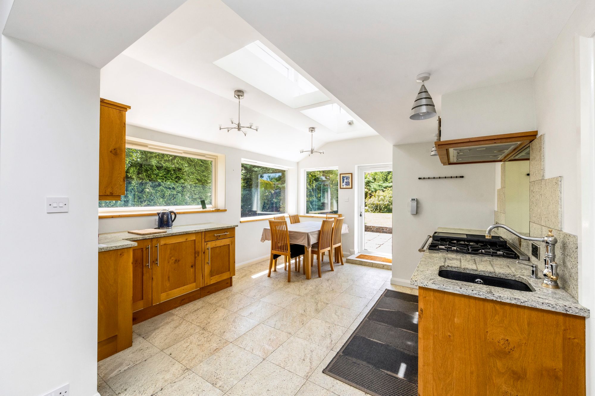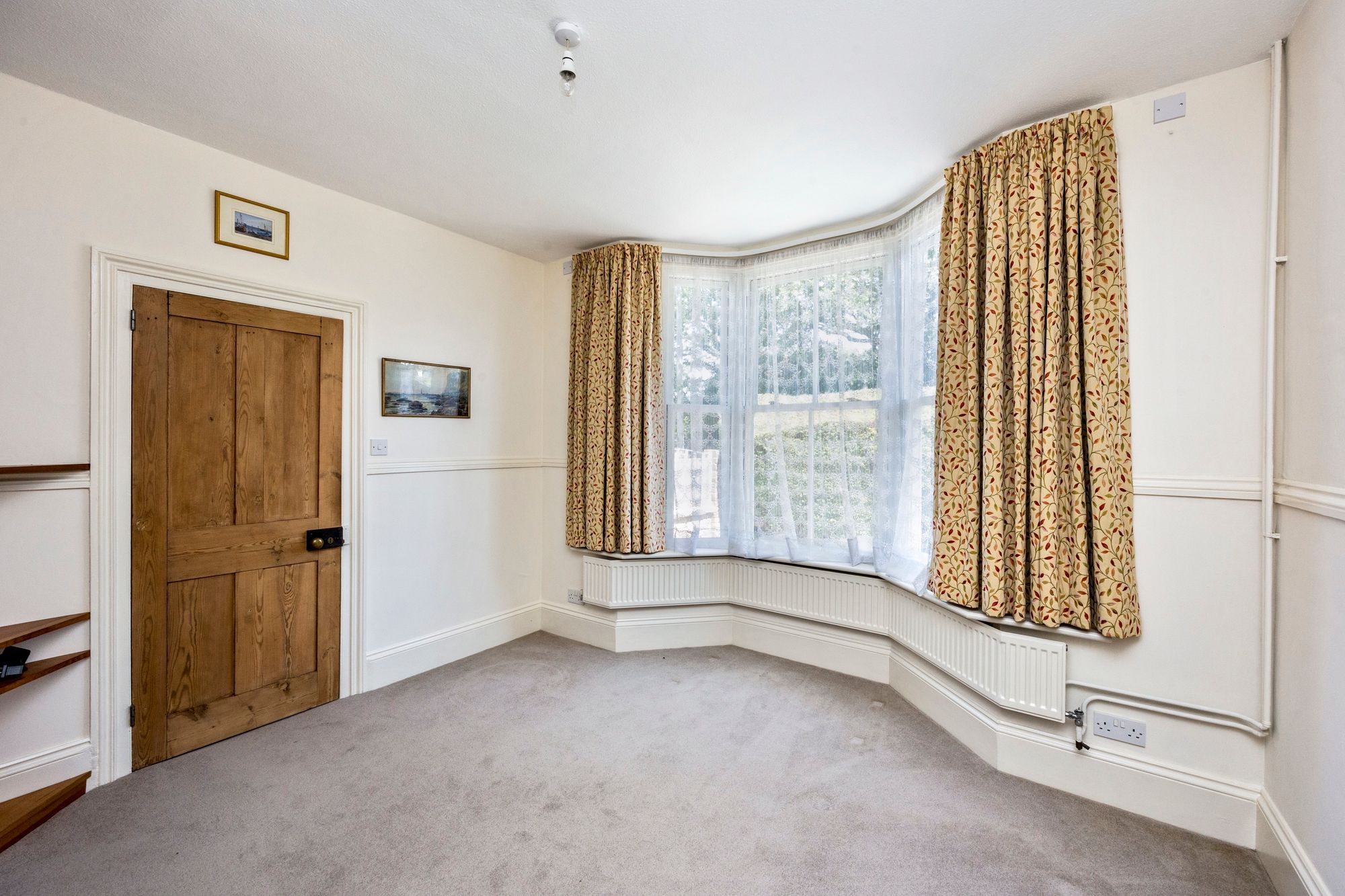 Inside the property, the front porch offers access into the entrance hall and to the left you will find a cosy living room, perfect for unwinding in the evenings, complete with a fireplace adding a touch of warmth and elegance and large bay window. A second formal living room, with triple aspect, is also present, providing a separate space for entertaining guests or relaxing with family. This room has bespoke fitted cabinetry and sliding doors to the rear garden.