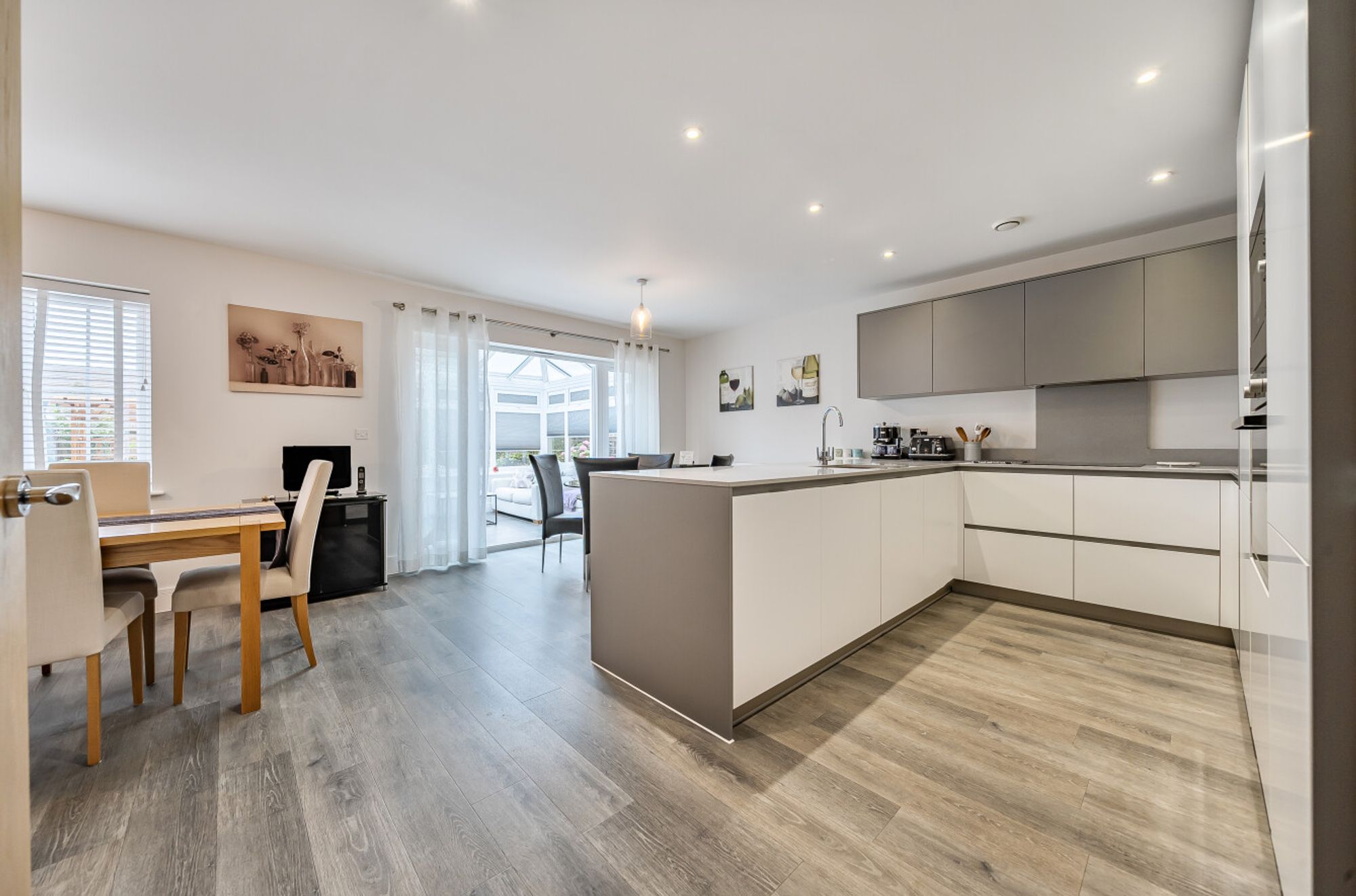 The accommodation comprises a welcoming entrance hall with WC/utility area, spacious sitting room with bay window, quality fitted kitchen with stylish units and integral appliances, and open plan dining space for table and chairs leading through to the conservatory overlooking the mature garden.