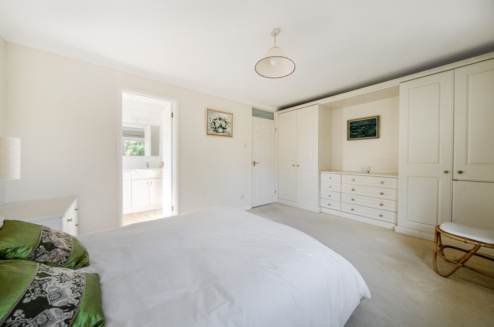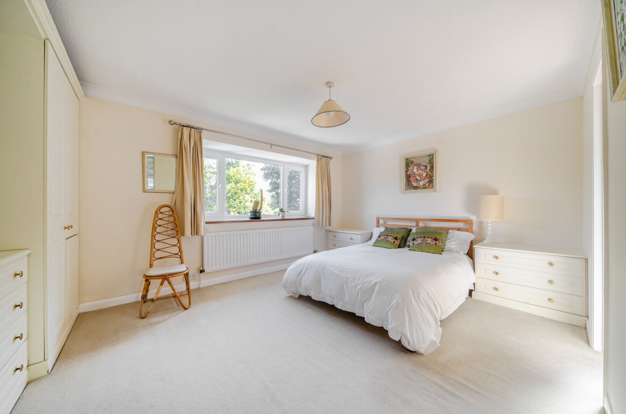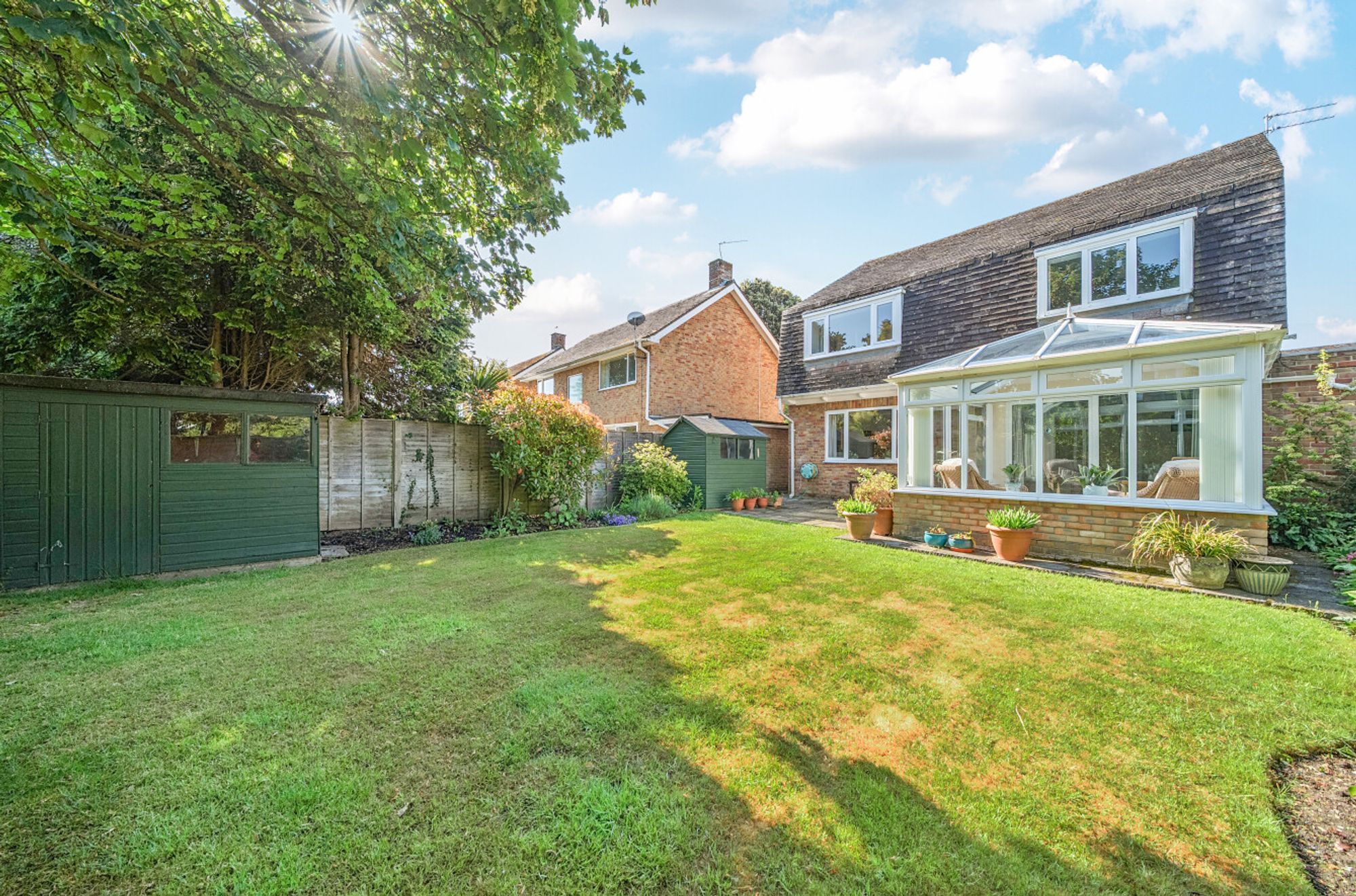 Outside, a driveway offers private parking and access to a double garage. The rear garden is beautifully kept with a variety of charming plants and shrubs, ensuring a high level of privacy and tranquillity.