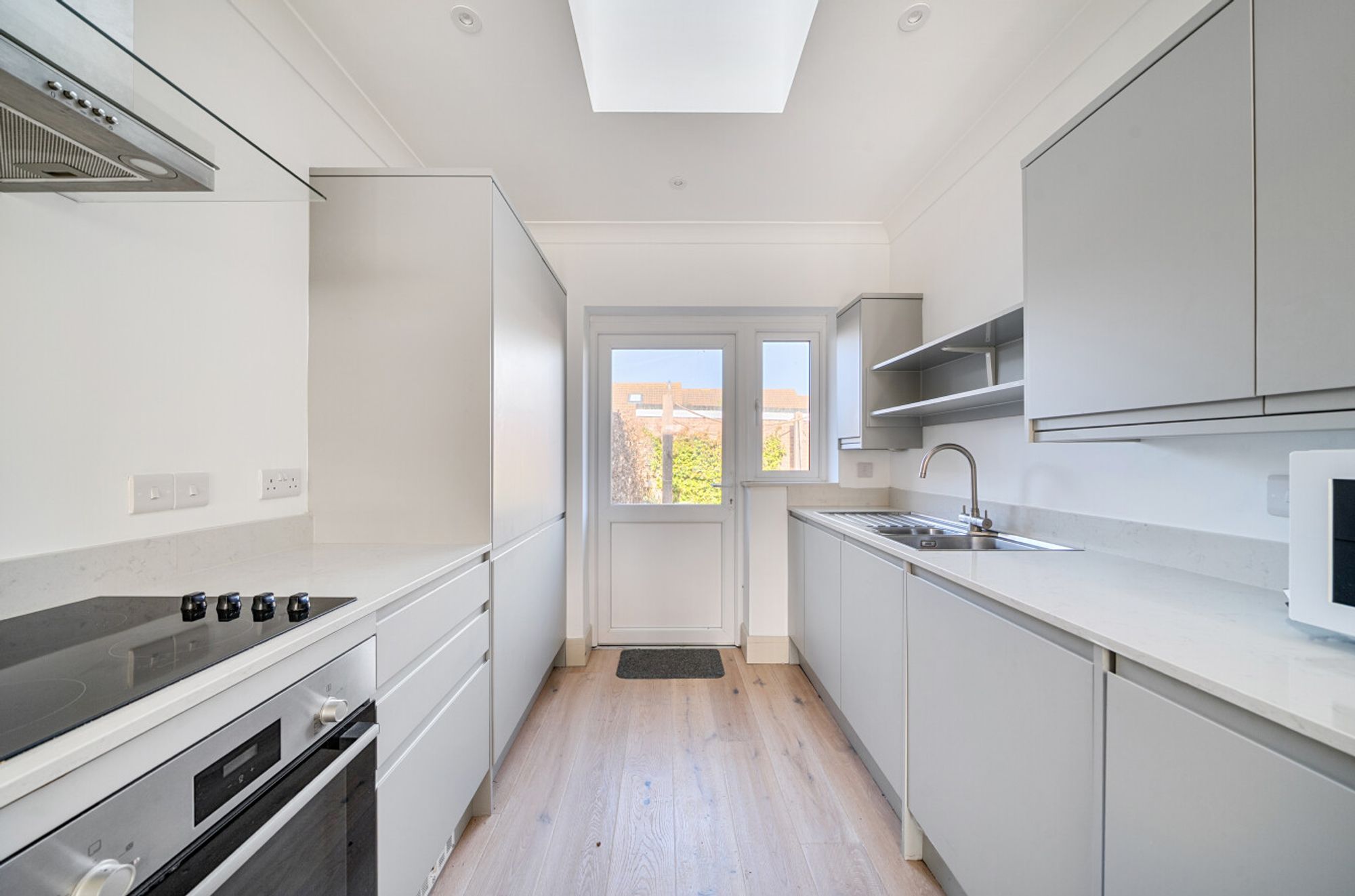 A central hallway provides access to all principal rooms, creating a practical and thoughtfully designed layout. To the front of the property, the open-plan kitchen and sitting room forms the heart of the home. Extending to over 28 feet in length, this bright and versatile space comfortably accommodates both living and dining areas. The fitted kitchen offers ample worktop and storage space, while a bay window to the front enhances the natural light.