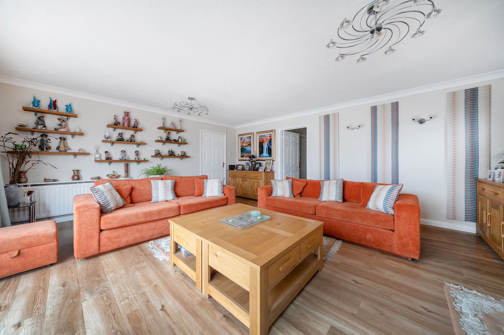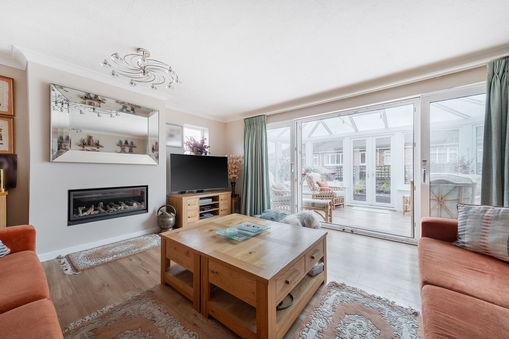 Internally, the bright and spacious accommodation is arranged entirely on one level. The redesigned kitchen offers an excellent range of storage, a new Worcester boiler and a stylish Karndean floor, which continues seamlessly throughout the property. From here, there is access to a south-facing conservatory fitted with solar-powered, self-cleaning glass and an electric opening window, creating a light-filled space to enjoy year-round.