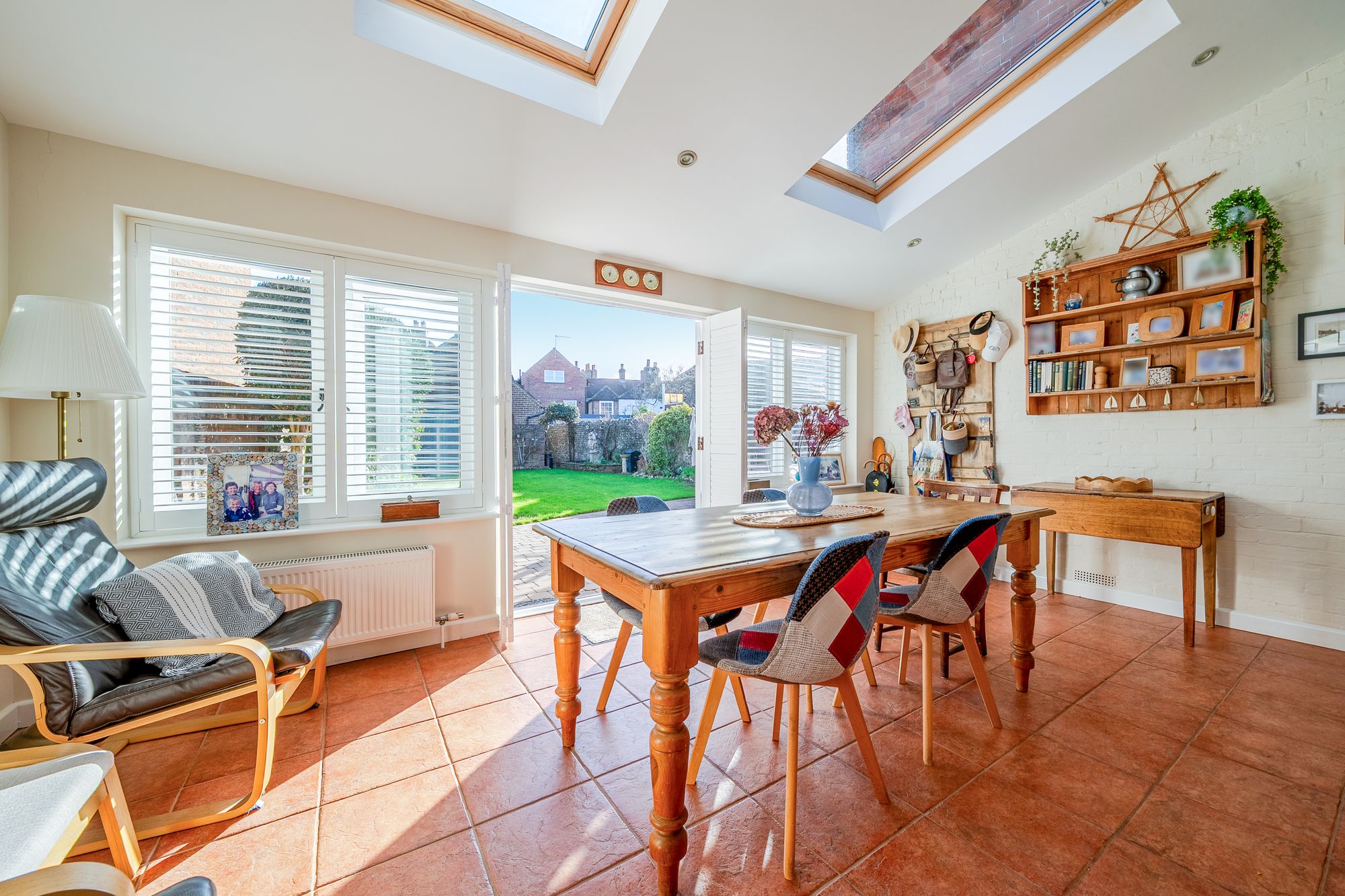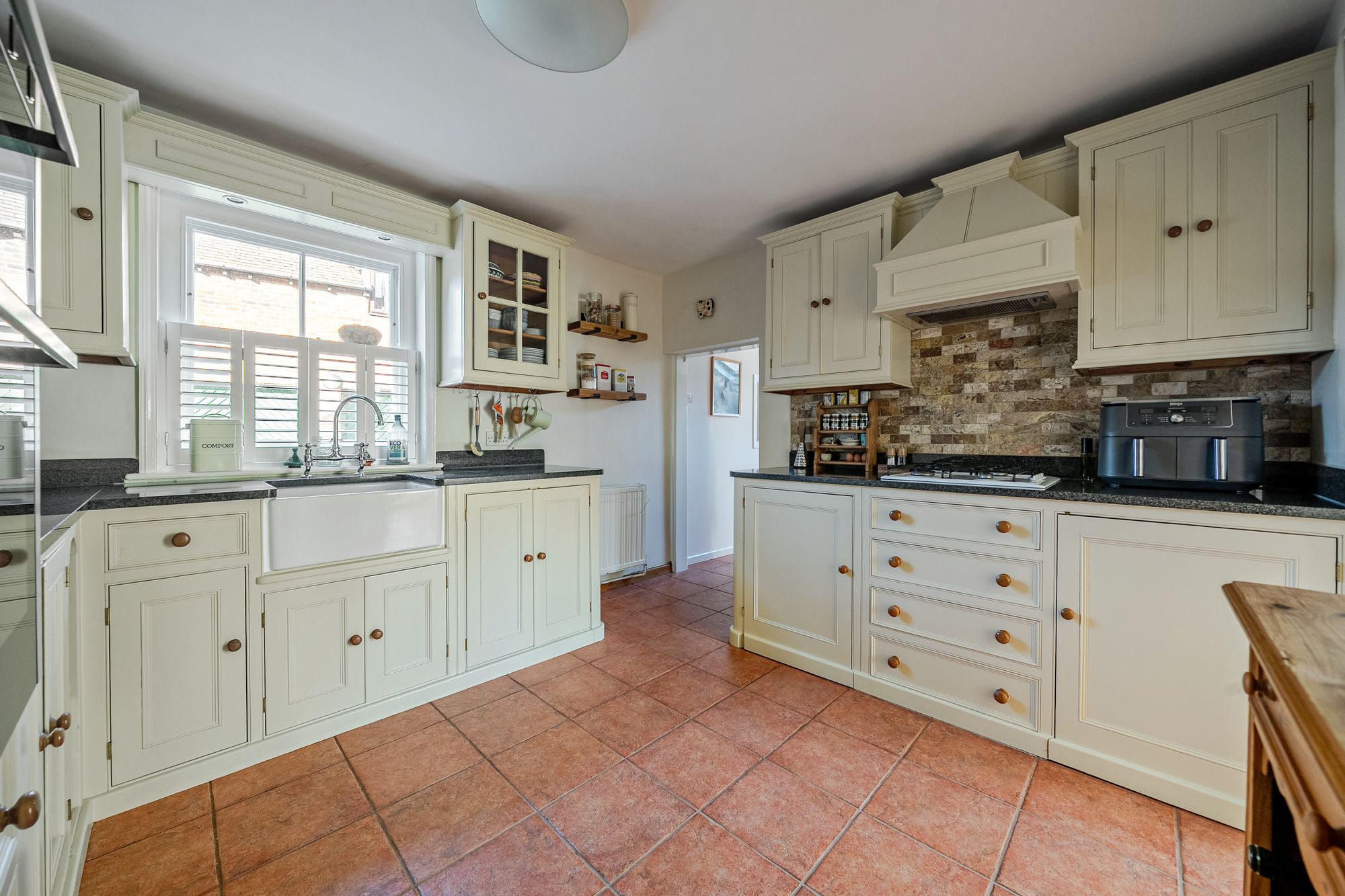 At the heart of the home, the bespoke kitchen has been carefully designed in keeping with the cottage style, featuring solid pine cabinetry, granite work surfaces, a Belfast sink and integrated appliances. The kitchen opens into a bright dining area, flooded with natural light from vaulted ceilings and skylights, with French doors extending the living space into the mature, southerly-facing garden. Completing the ground floor is a fourth bedroom with an en-suite shower room.