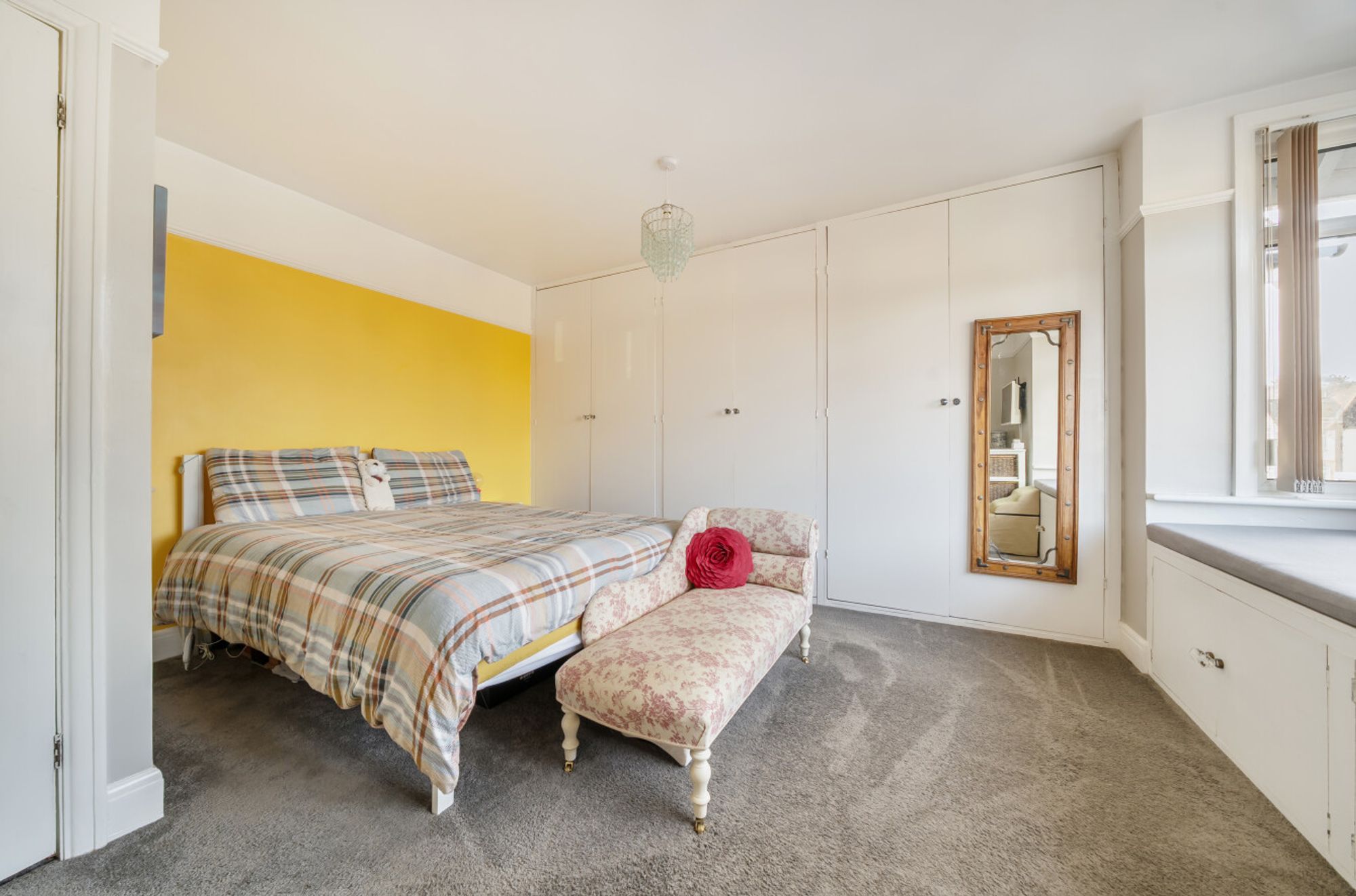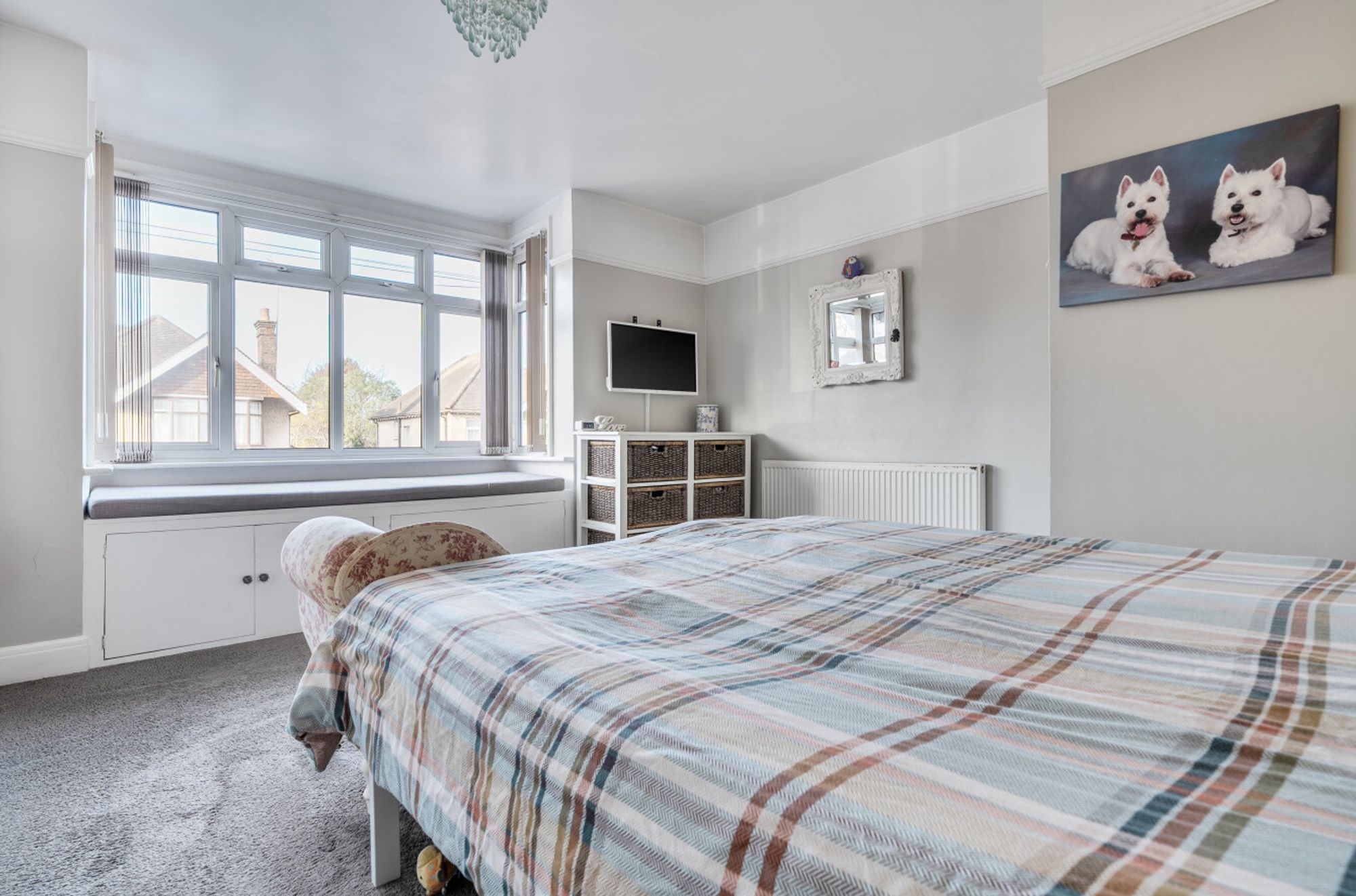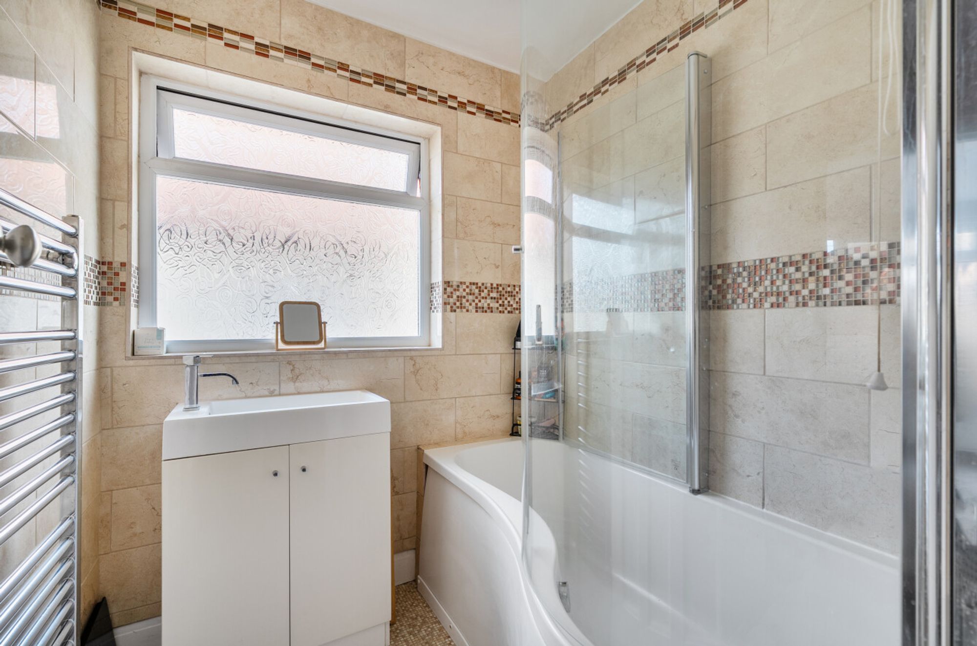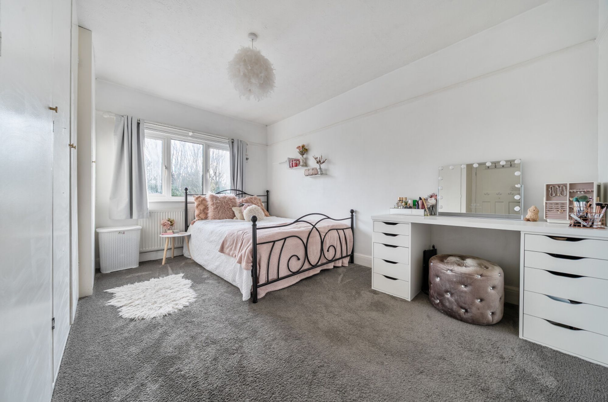 Upstairs, the property offers two large double bedrooms, both benefiting from wall-to-wall fitted wardrobes, and a larger-than-most single bedroom. The primary bedroom enjoys an attractive bay window with a cosy seating area, creating a peaceful retreat. A family bathroom serves the bedrooms, complemented by the convenience of two separate WC’s.