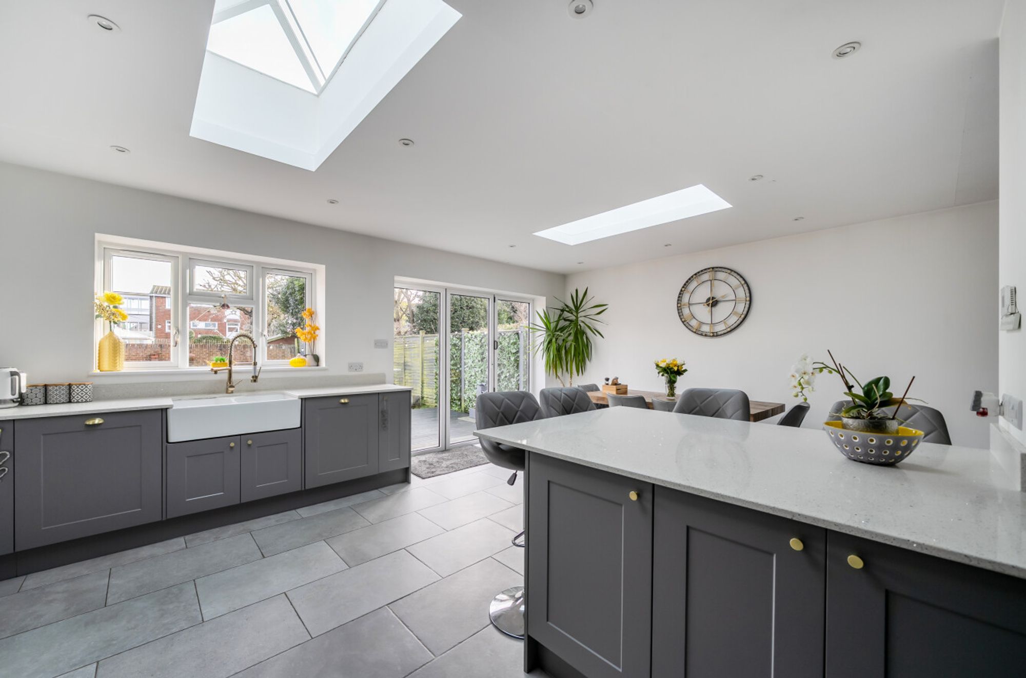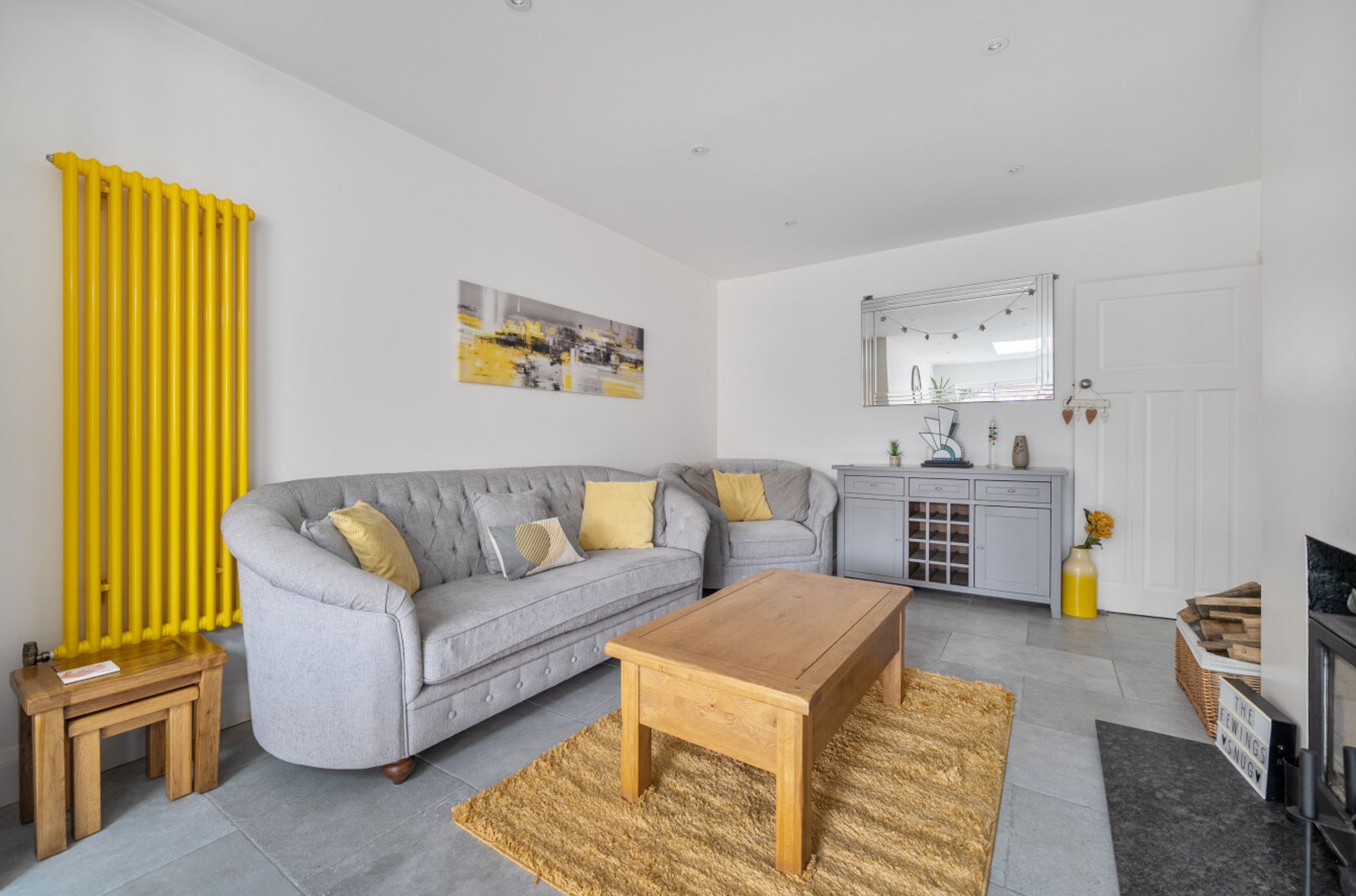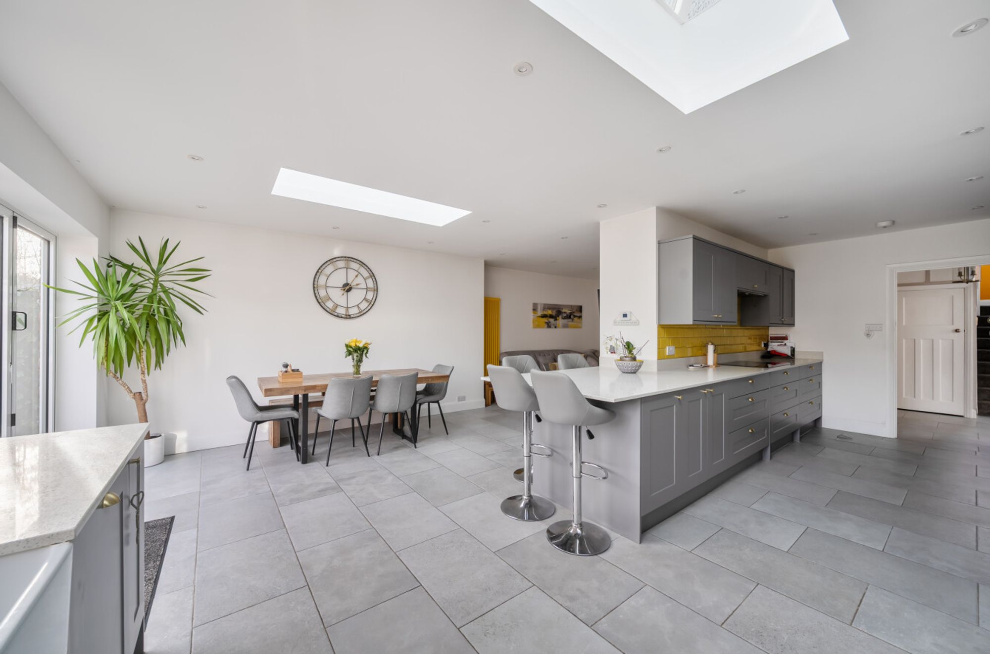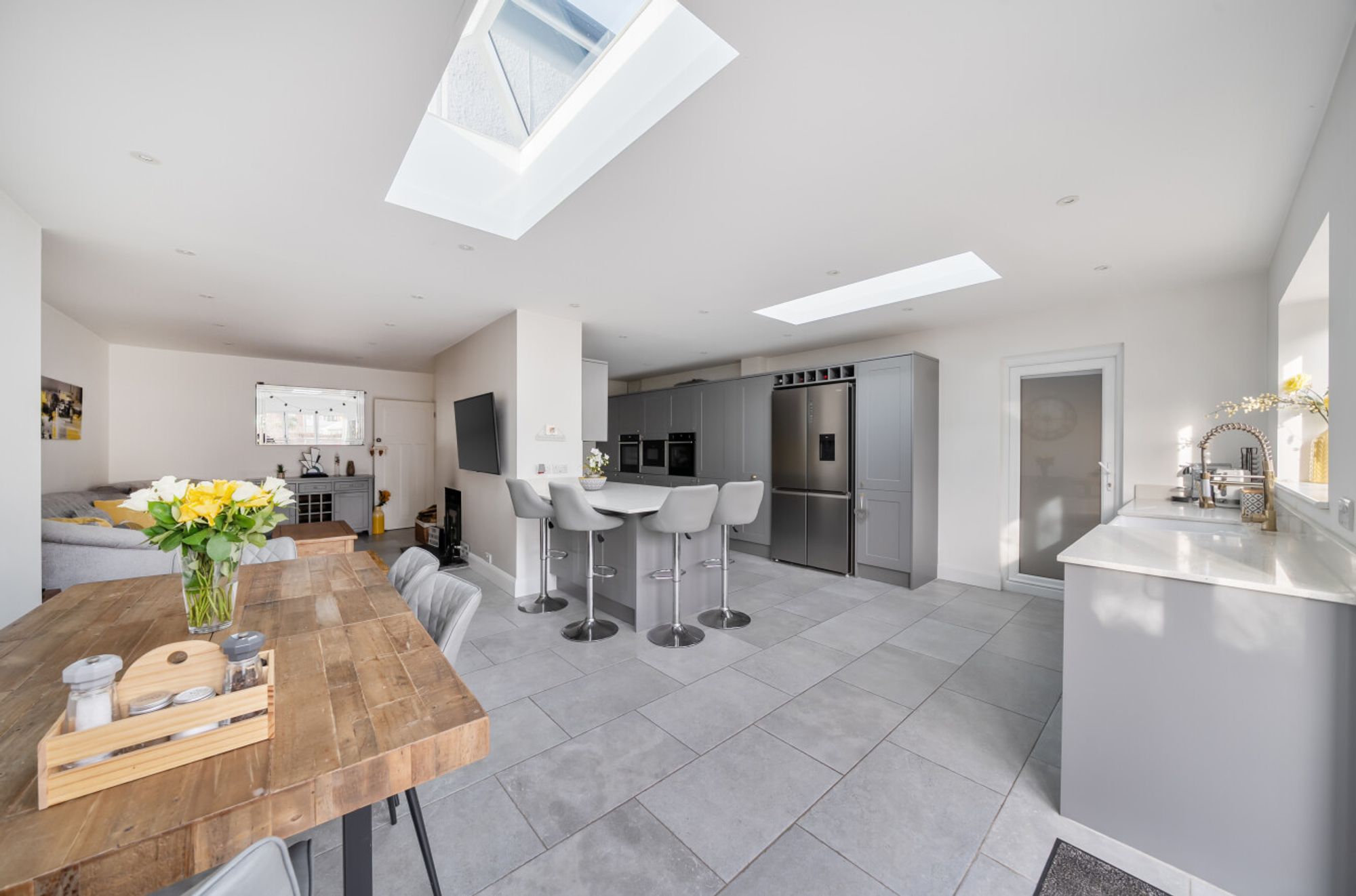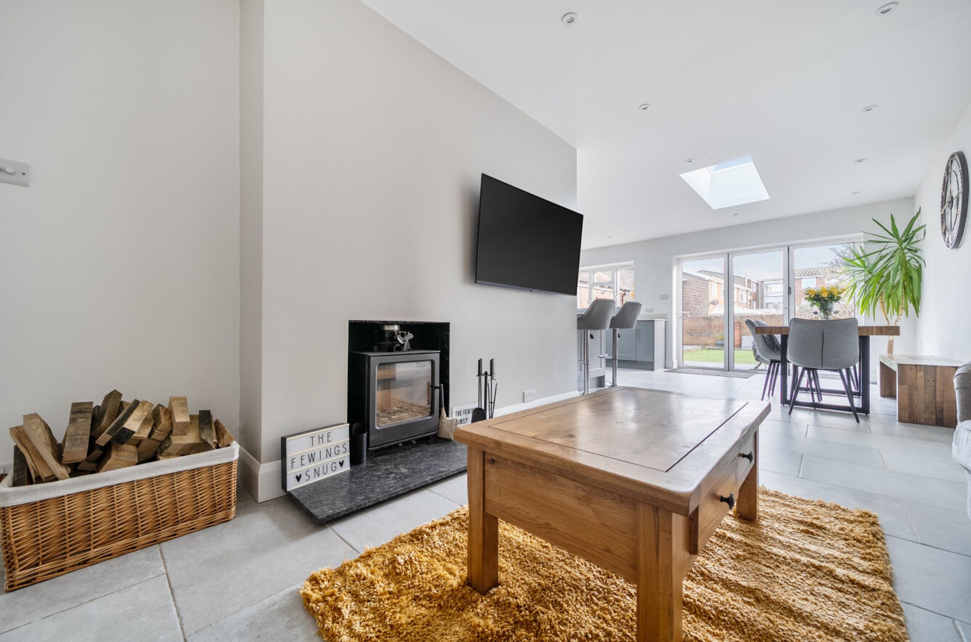The heart of the home is the impressive rear extension, creating a stunning open-plan kitchen and dining area with under-floor heating. The kitchen is finished to a high standard and features two integrated ovens, ample storage and workspace, making it perfect for both everyday living and entertaining. The dining area flows seamlessly into a cosy snug, complete with a charming working log burner, providing a warm and inviting space to relax.
