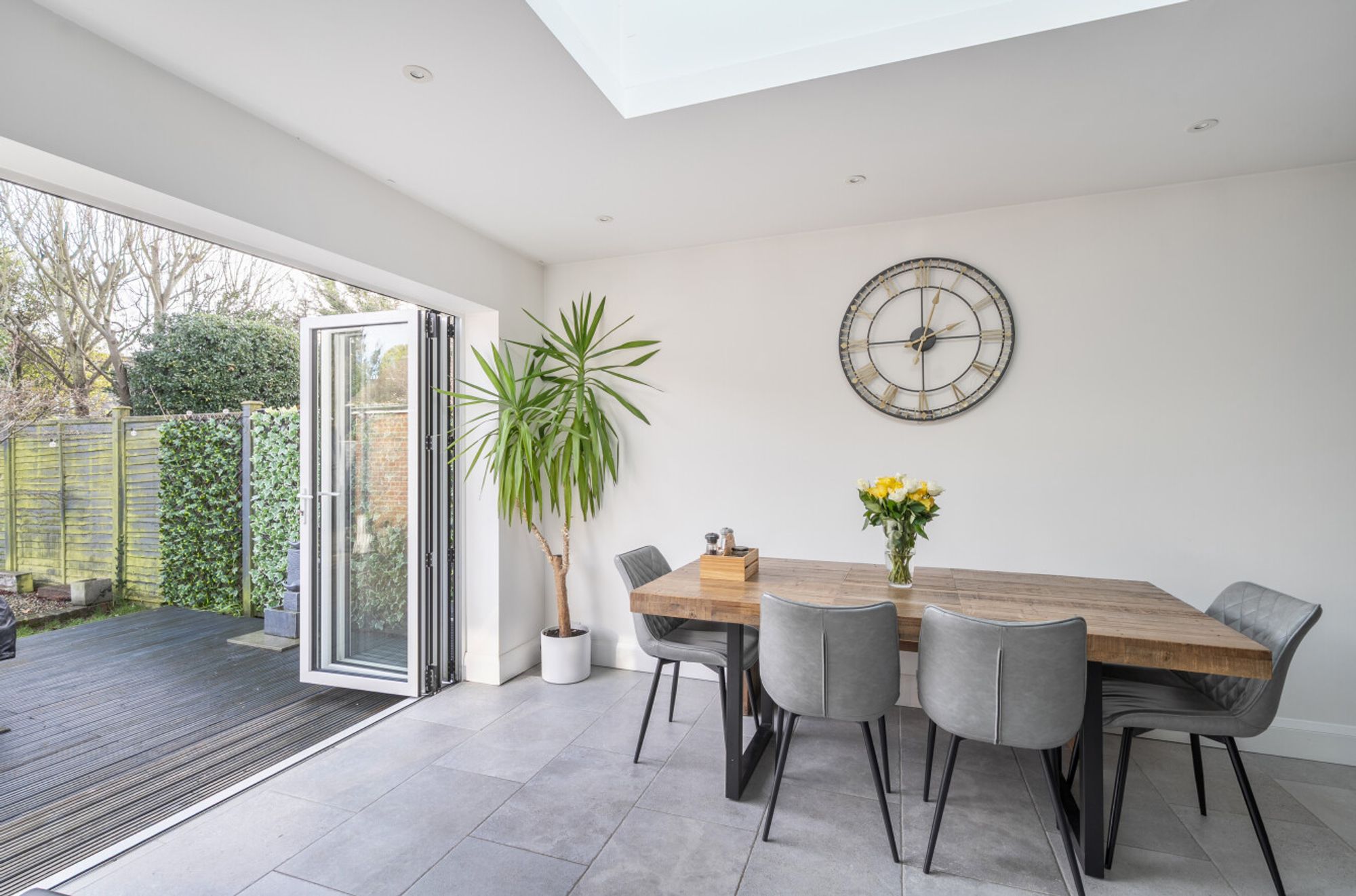 Bi-fold doors open directly onto the rear garden, effortlessly blending indoor and outdoor living. The garden itself is beautifully arranged with decked areas and integrated lighting, ideal for entertaining, alongside a well-maintained lawn.