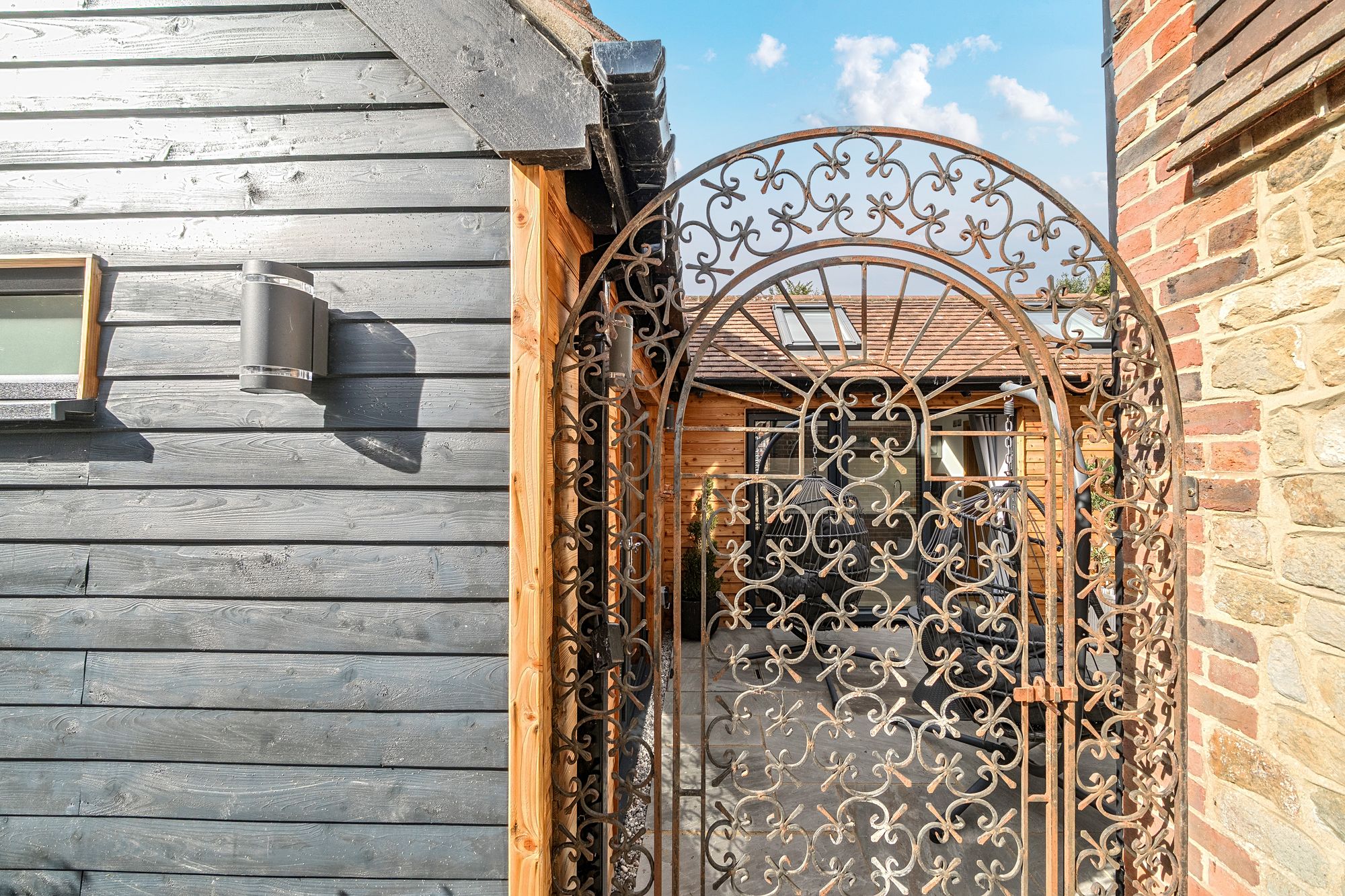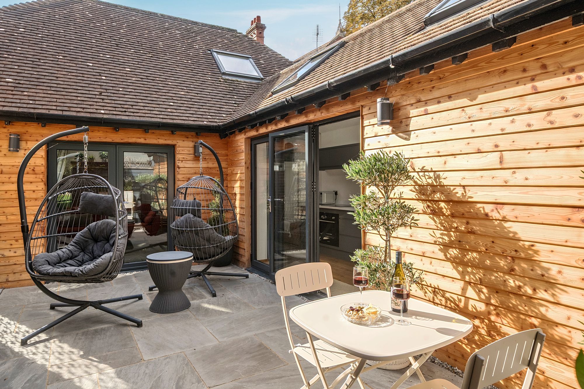 Converted and extended in 2023, the studio provides a flexible living space ideal for guests or extended family. It includes a spacious kitchen/living room with vaulted ceilings and ample natural light, complemented by sliding glass doors that open onto a private courtyard. Features include a well-equipped kitchen and a modern shower room.