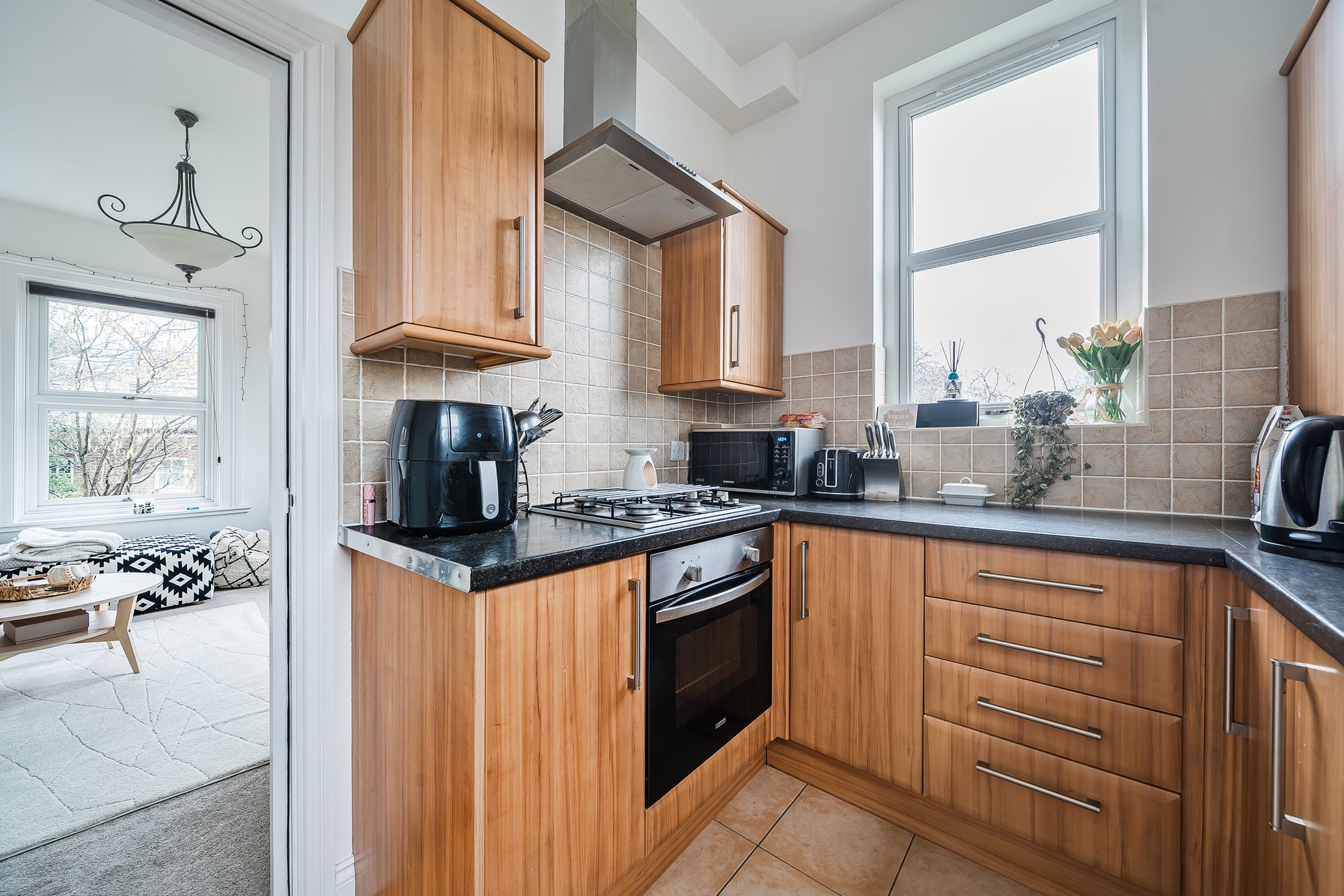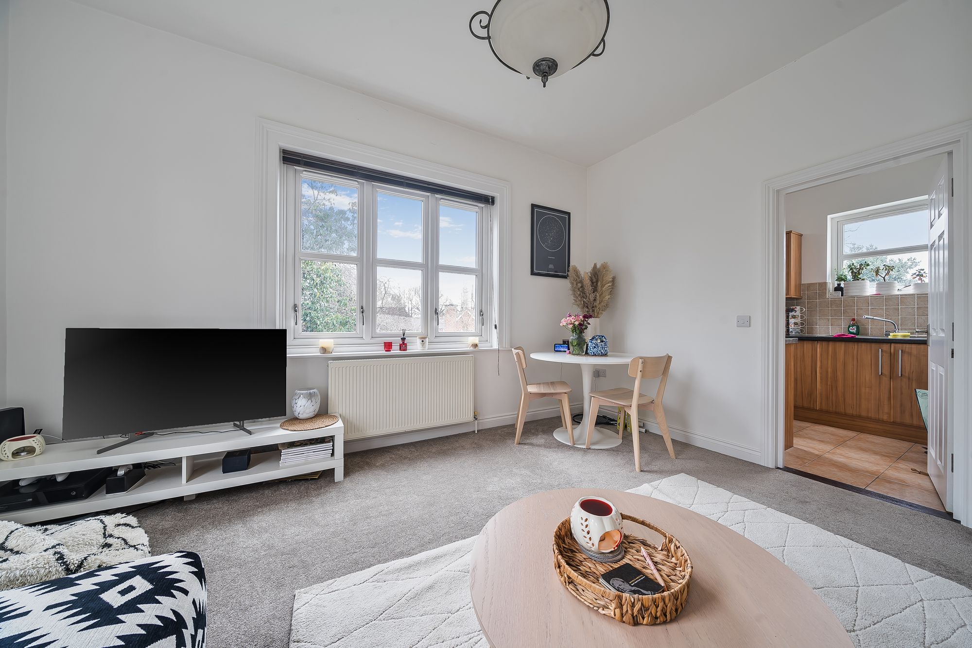 The accommodation is arranged around a generous dual-aspect sitting room, enjoying side and rear views through quality double-glazed windows fitted with blinds and overlooking the well-maintained communal grounds. The fitted kitchen includes a built-in oven, hob and extractor hood, together with an integrated washer/dryer.