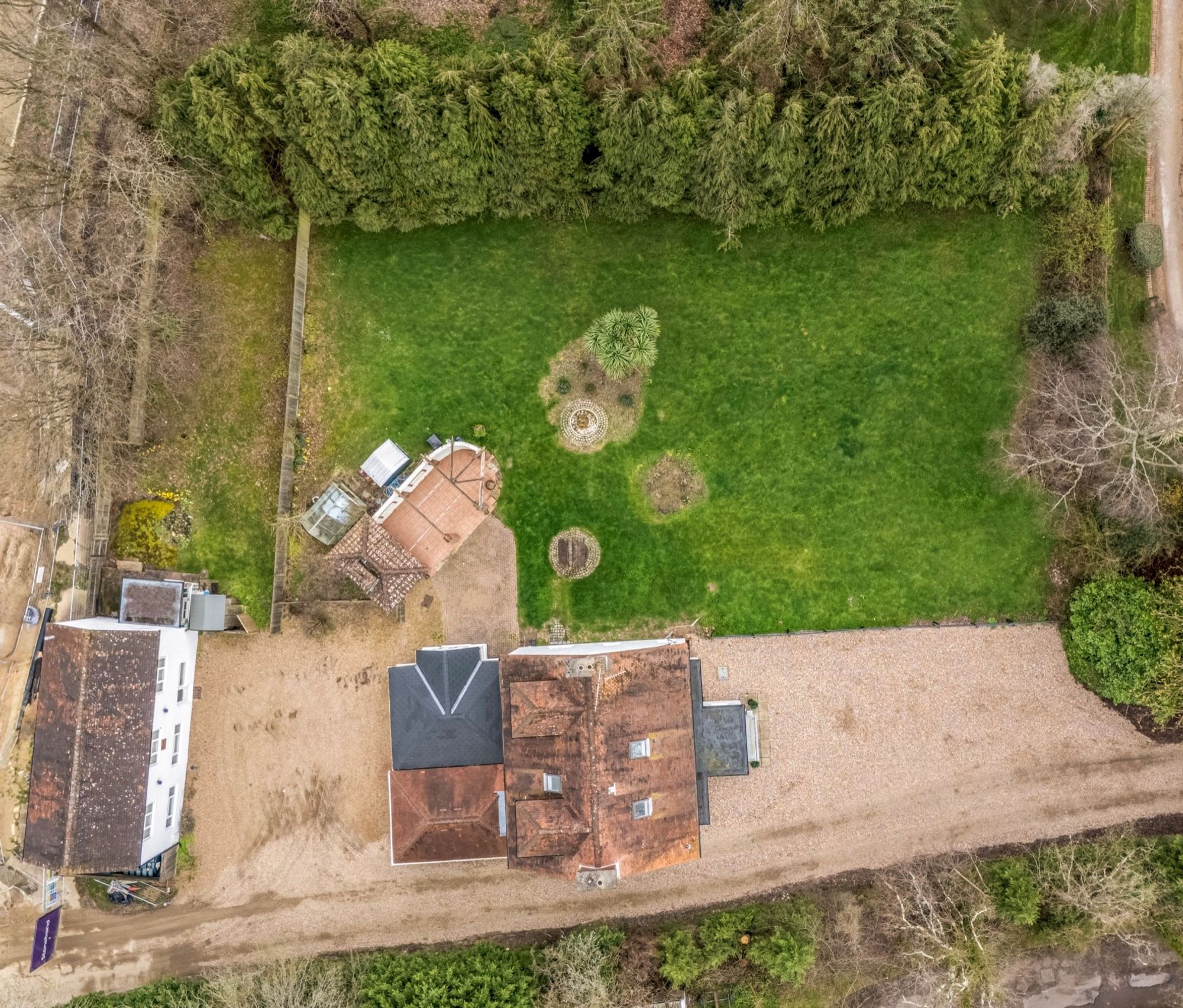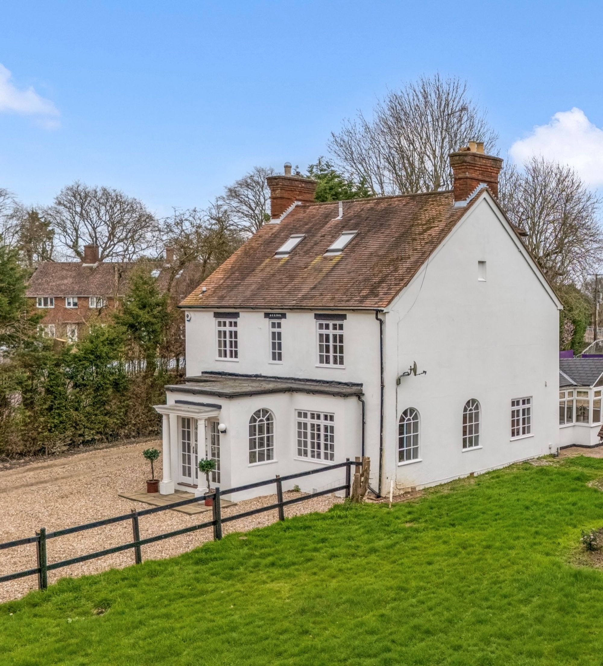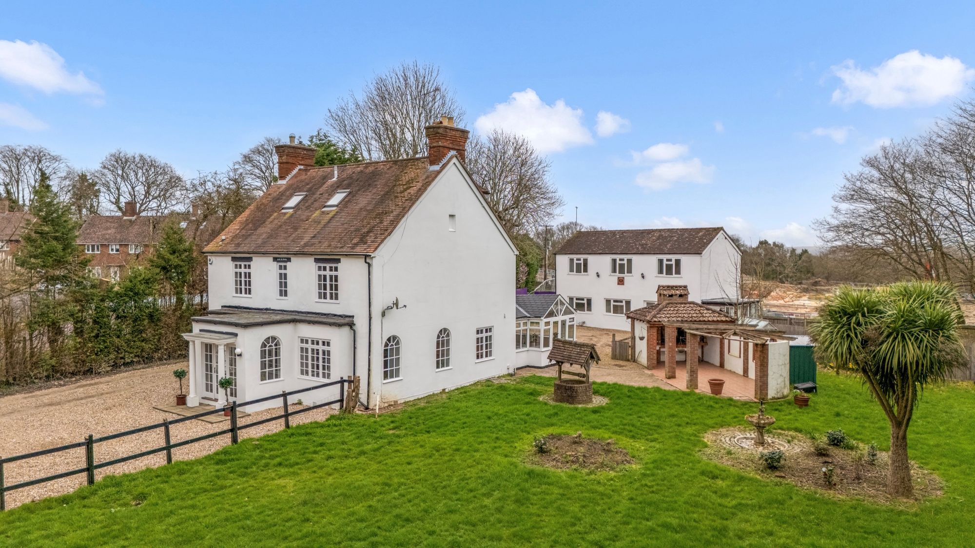Externally, the property is approached via a gated gravel driveway, offering ample parking for several vehicles to both the front and rear. The gardens are predominantly laid to lawn and bordered by mature trees and shrubs, providing privacy and a peaceful setting. A brick-built Mediterranean-style outdoor dining area offers an ideal space for summer entertaining, complete with a built-in barbecue and preparation area.