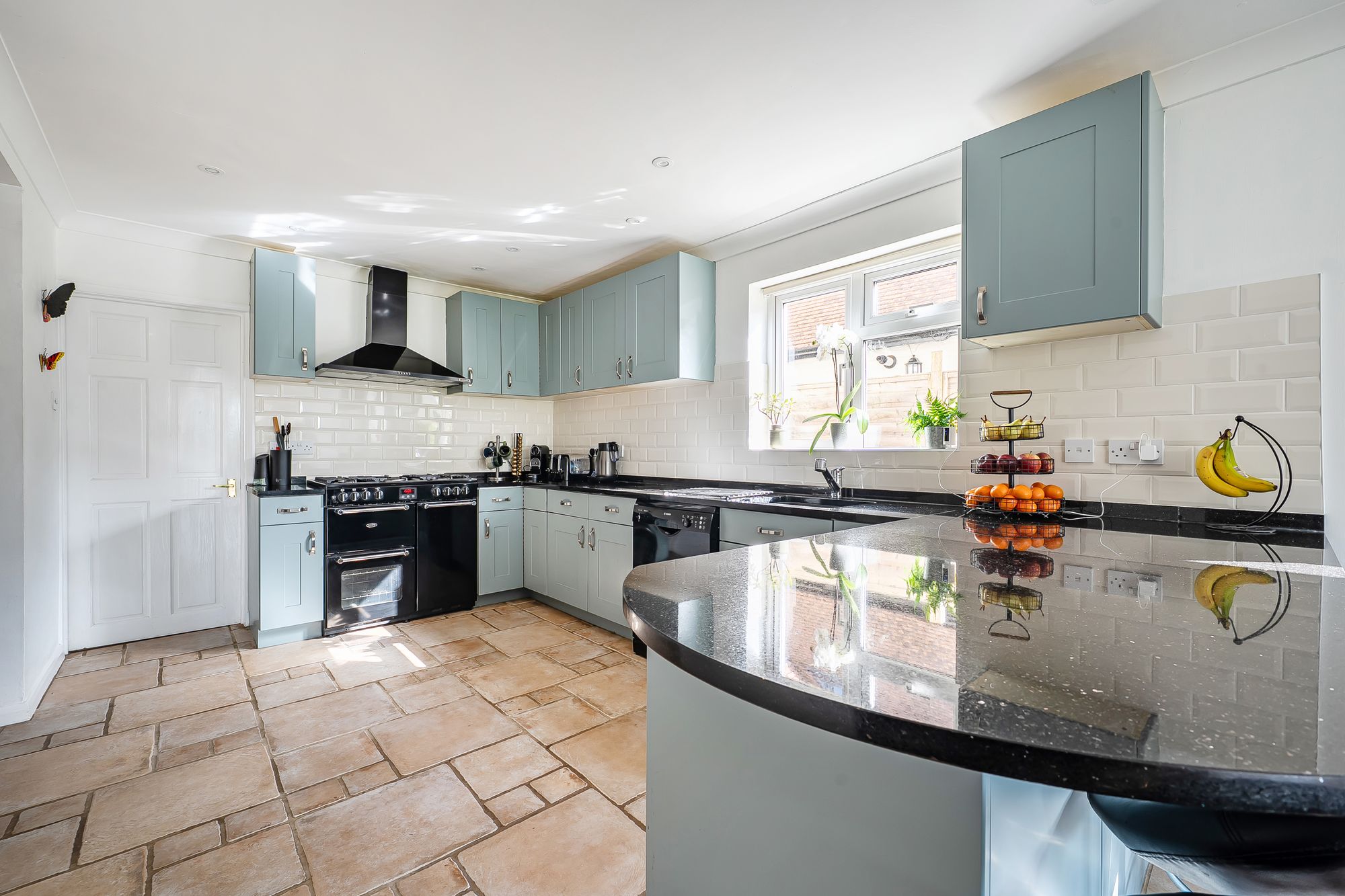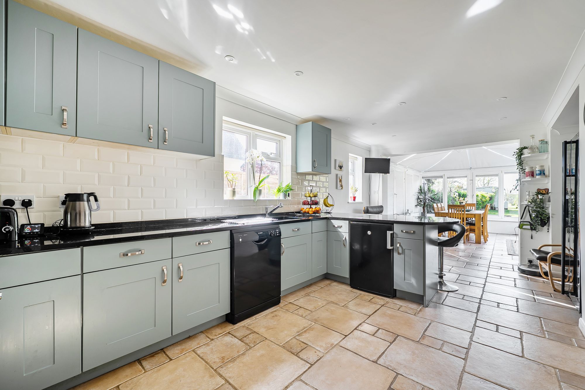 The accommodation is thoughtfully arranged to provide generous living space, beginning with a porch leading to a welcoming entrance hall. At the front of the property is a second sitting room with an open fire offering space for entertaining or quiet retreat, while a separate study (which could also serve as a playroom) provides flexibility for home working or family needs. The main sitting room, at the rear of the property overlooking the garden, features a charming gas log burner, creating a cosy focal point for relaxing evenings. The heart of the home is the impressive kitchen, equipped with a range cooker, ample space for appliances, breakfast bar and a large dining area that enjoys direct access to the garden, making it ideal for both every-day living and entertaining. A large cloakroom and a separate utility room add further practicality, ensuring ample storage and convenience.