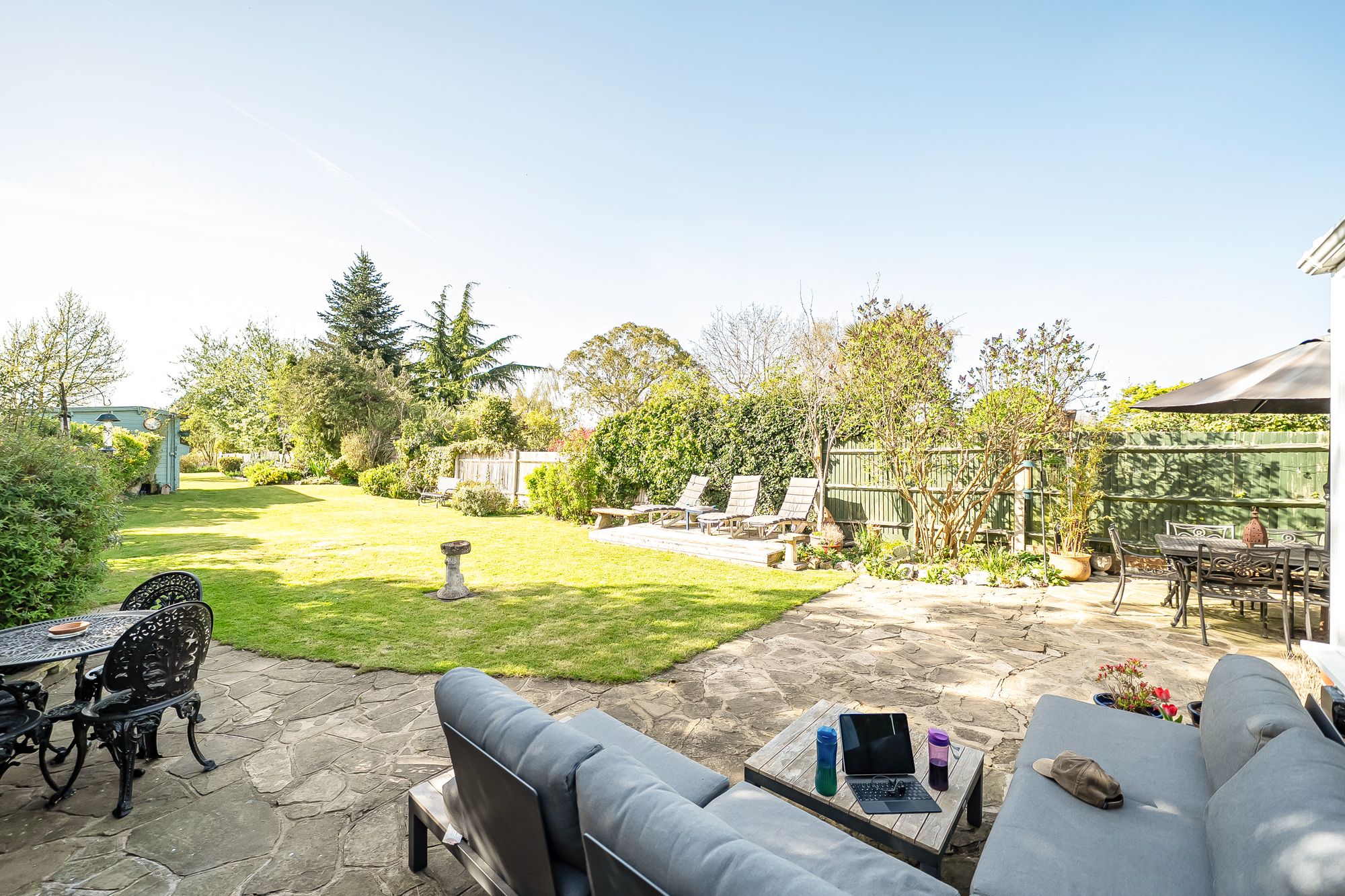 The 245ft west facing rear garden is a true feature of the property, thoughtfully landscaped with a variety of plants and shrubs, a large patio, a decking area and also a summer house and garden shed for additional storage or leisure use. There is a further area of grassland accessed via the wooden gate. Driveway parking is available for several vehicles, ensuring convenience for residents and visitors alike.
