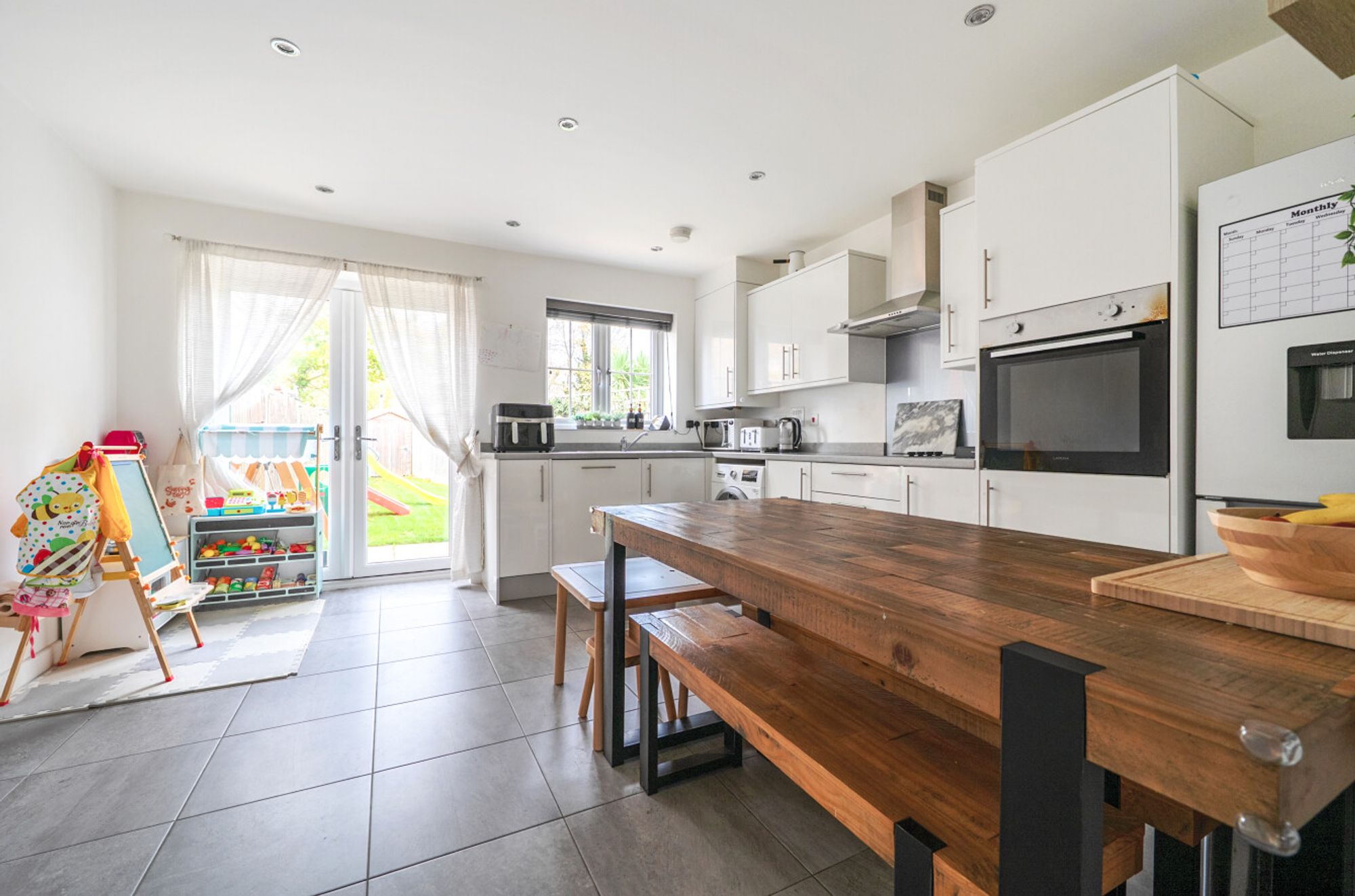 Internally, the home boasts a modern fitted kitchen/dining area with integrated appliances and ample worktop space with French doors opening onto the rear patio and garden, downstairs WC, bright and airy sitting room, two generous double bedrooms, both beautifully presented, and contemporary family bathroom with white suite and shower over bath.