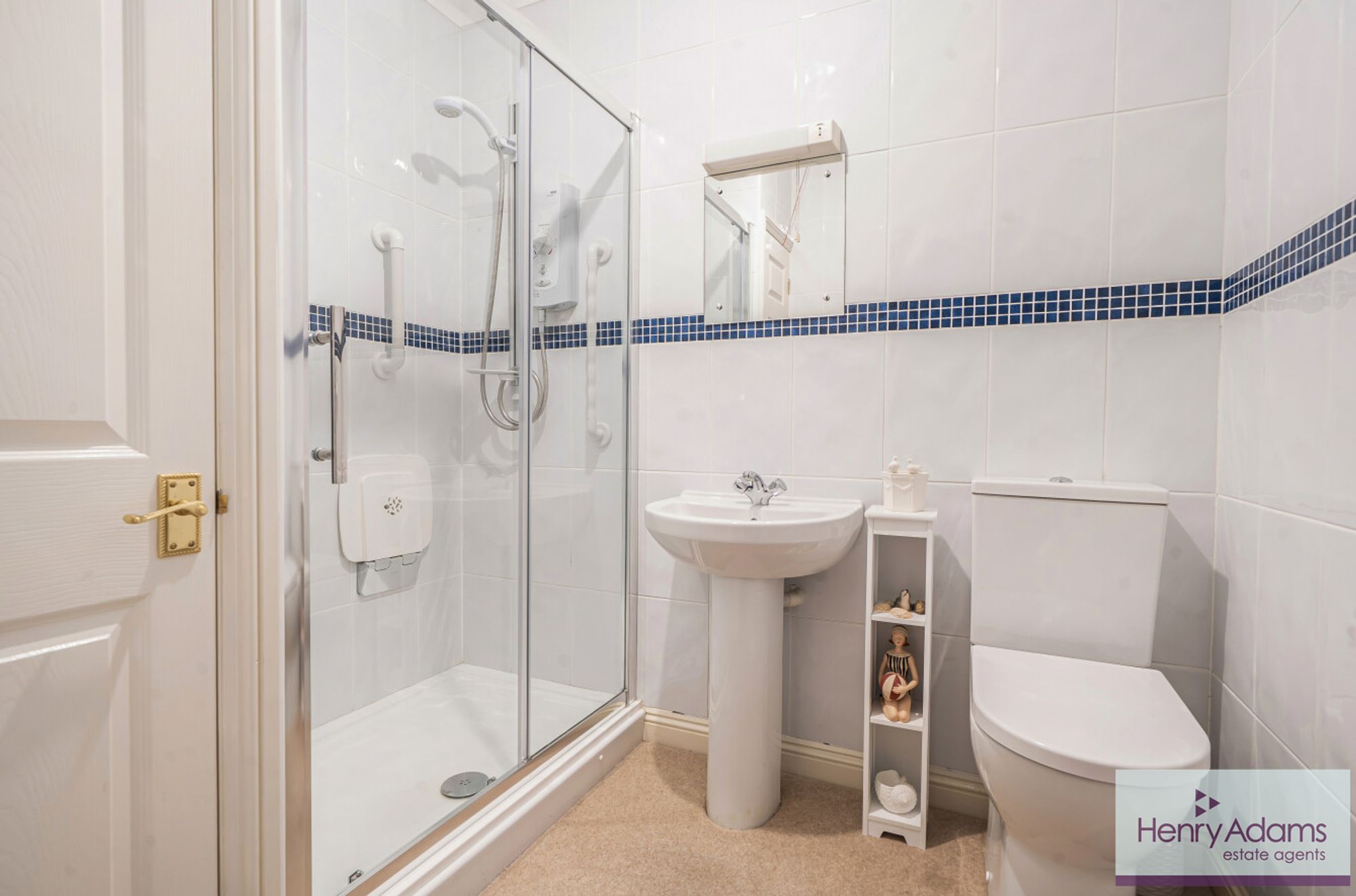 The shower room is fitted with a white suite and features a large, easy-access shower enclosure with a fold-down seat, providing added comfort and practicality.
