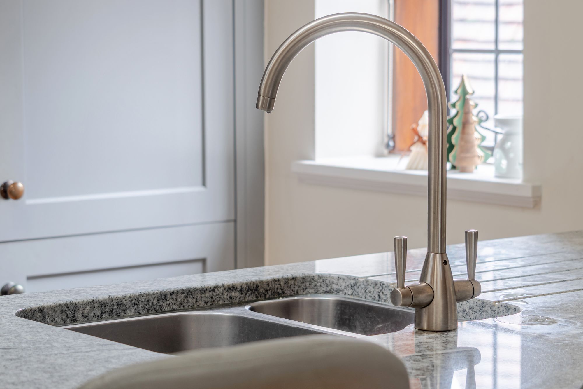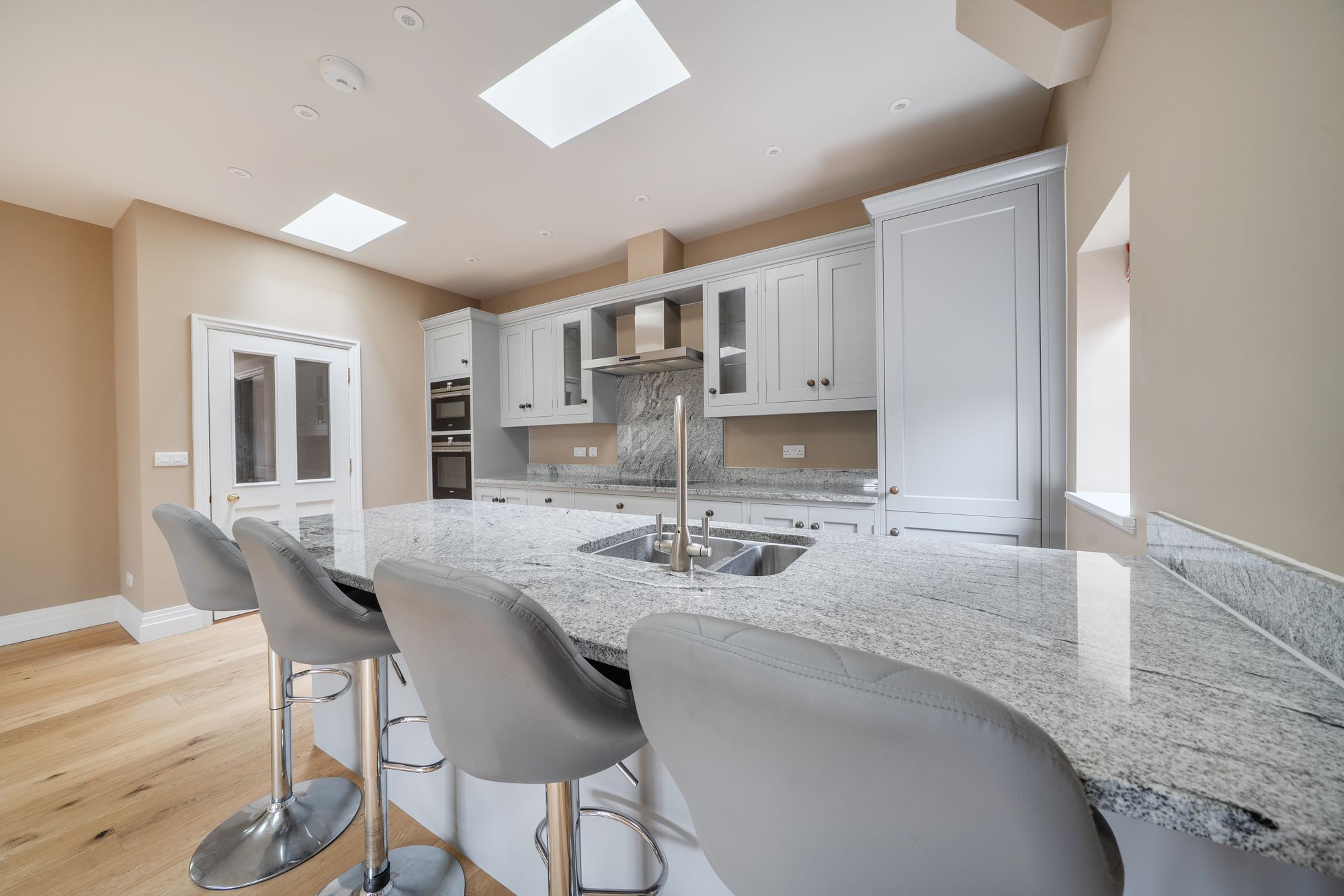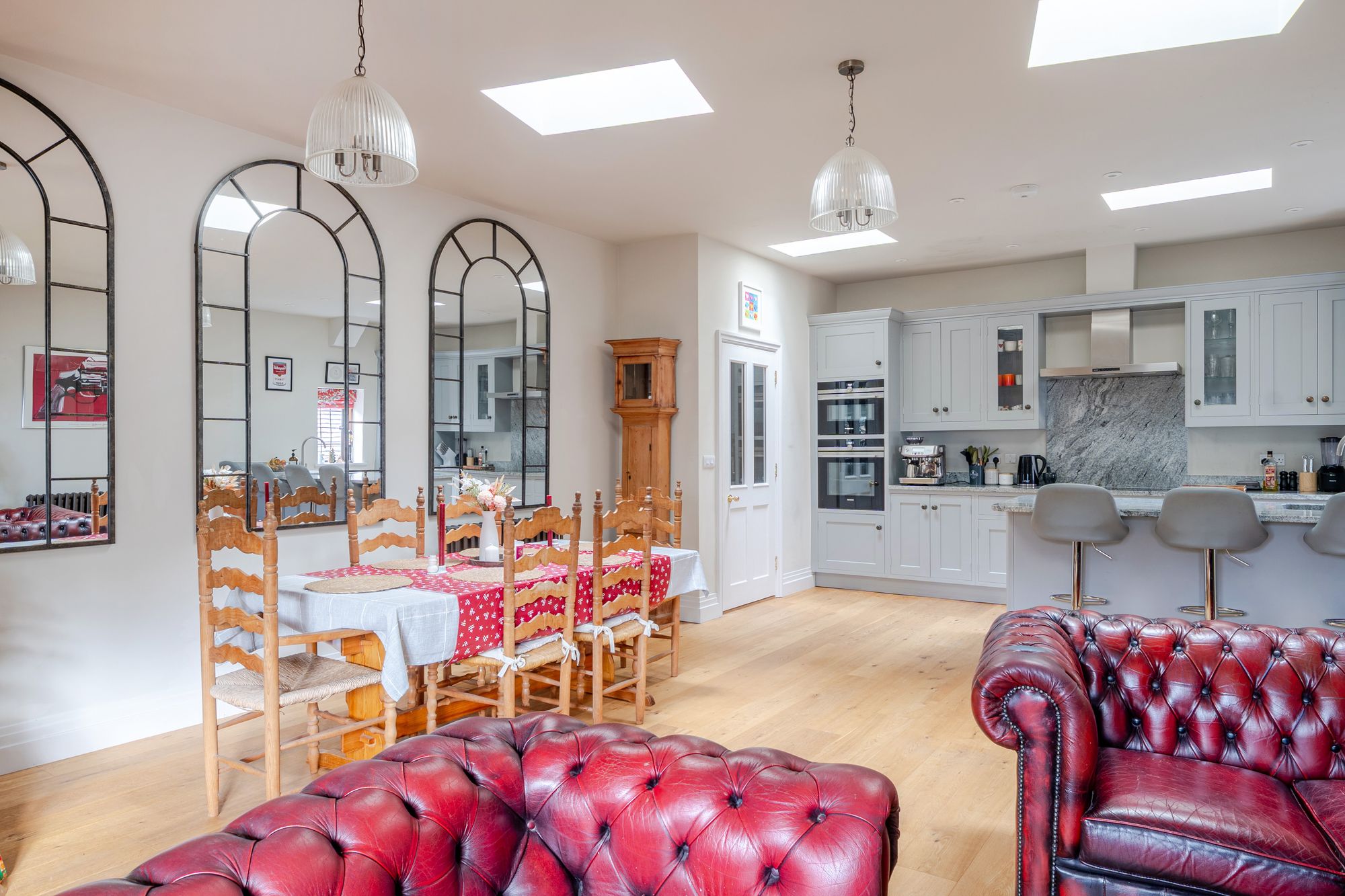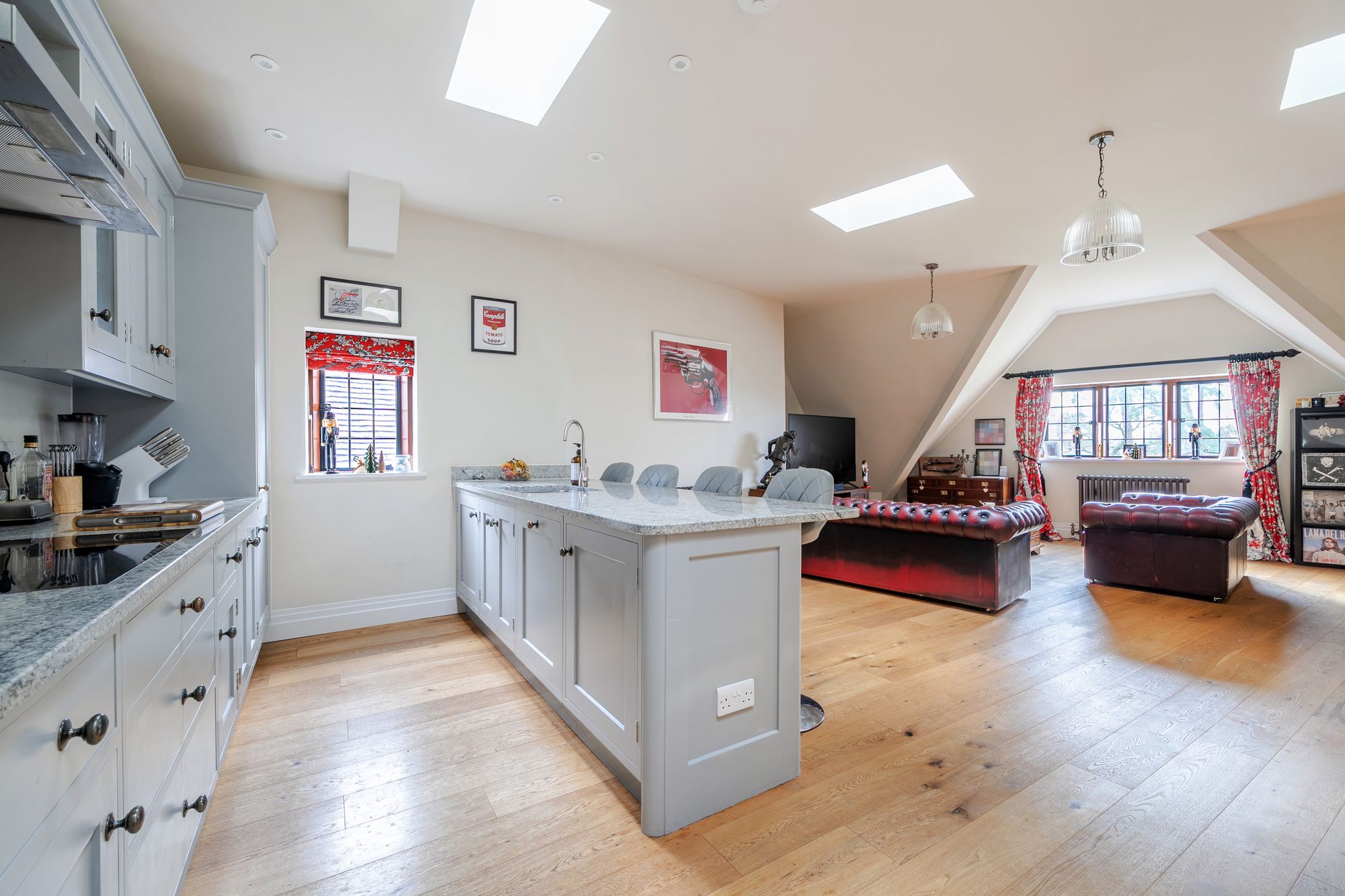 Upon entering, a welcoming entrance hall provides extensive built-in storage and leads through to a stunning double-aspect open-plan kitchen, sitting and dining room. Finished to a high standard with a superior specification, this impressive space is both stylish and practical. The kitchen features bespoke cabinetry, granite worktops and a central island incorporating additional storage and a breakfast bar, all beautifully complemented by oak flooring. The room comfortably accommodates a dining table and chairs, alongside a generous seating area positioned to enjoy the views through restored character windows, creating a light-filled and inviting environment.