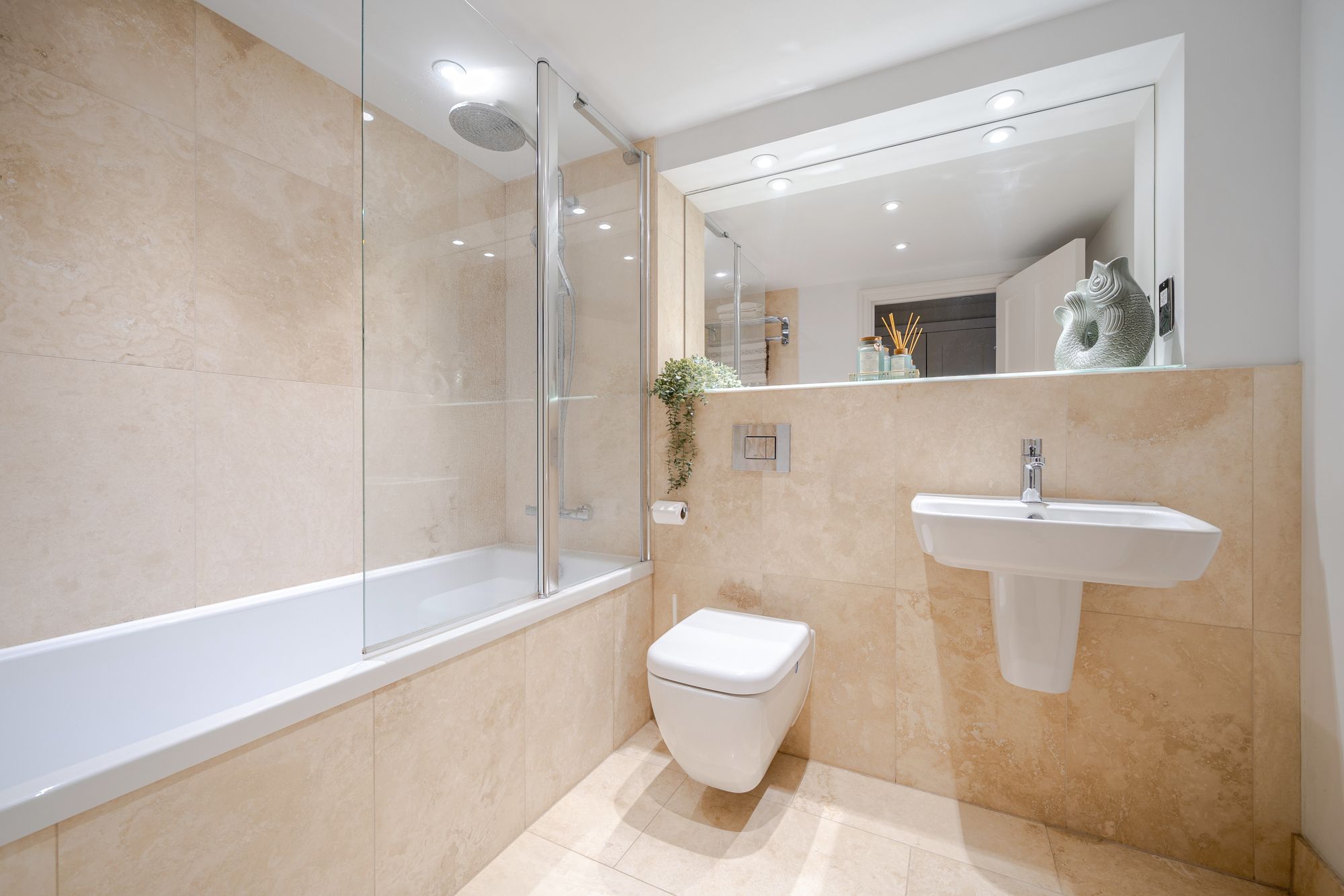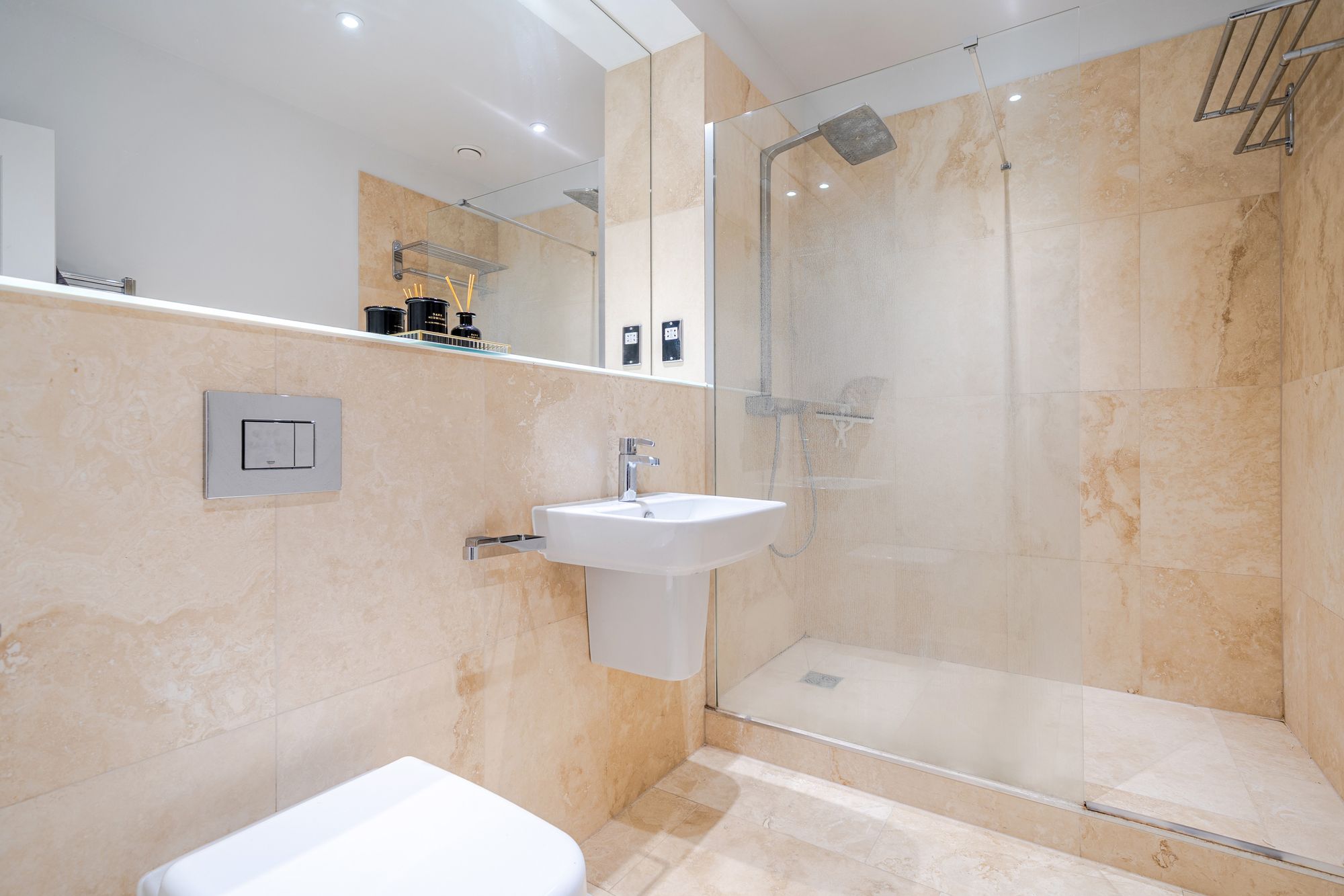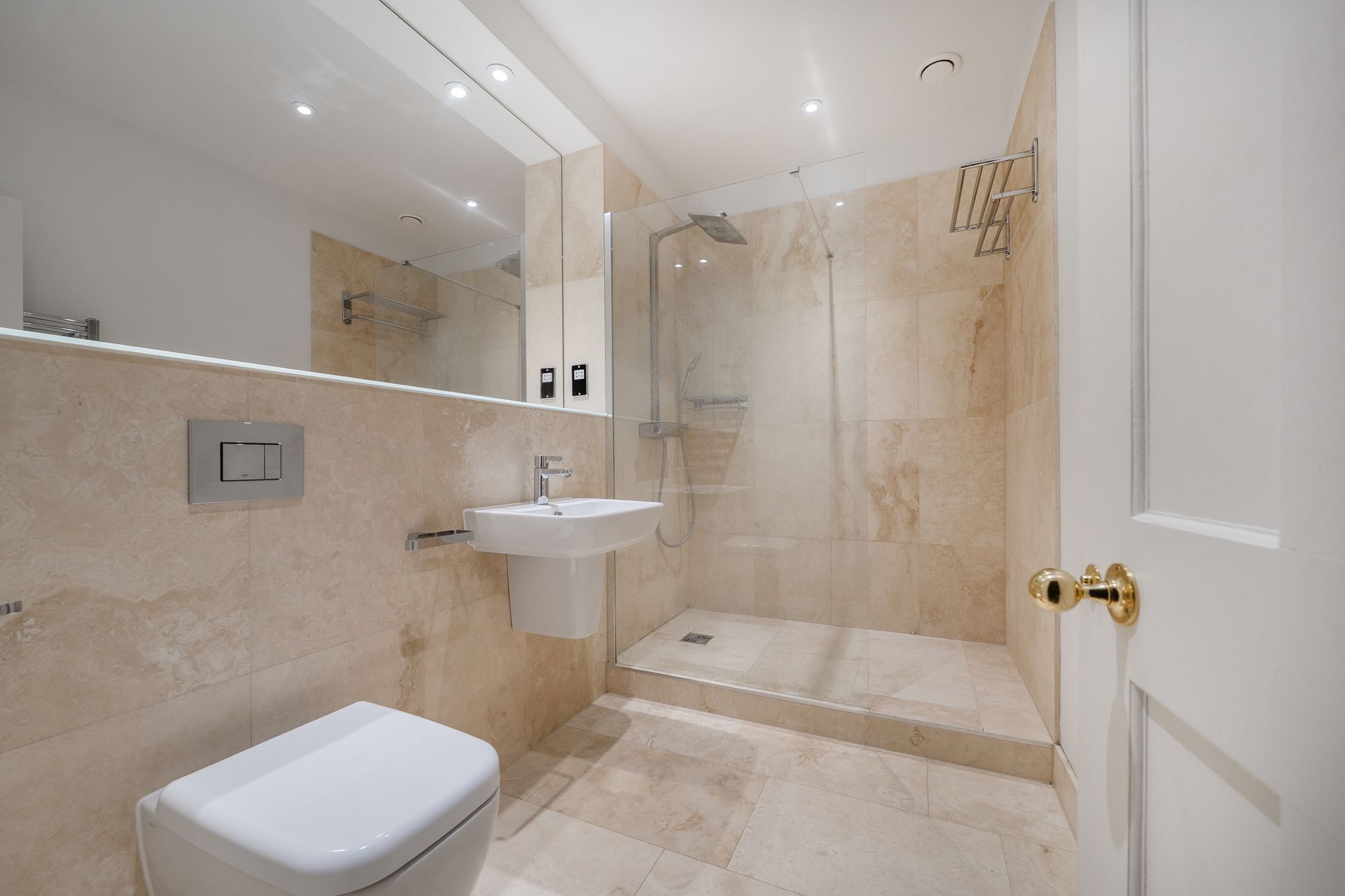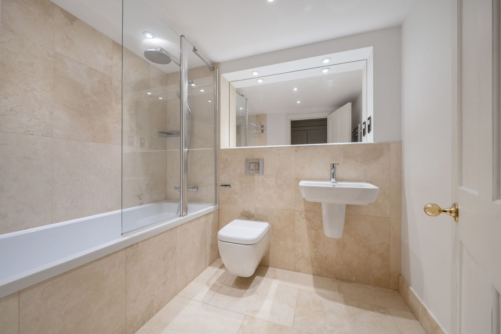 The apartment offers two well-proportioned double bedrooms. The principal bedroom benefits from built-in wardrobes, a dressing area and a contemporary ensuite shower room. The second bedroom is served by a luxurious family bathroom fitted with a bath and an overhead raincloud shower.