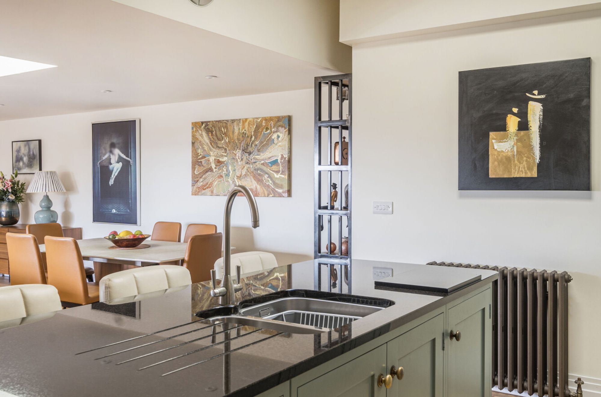 Upon entry, you are greeted by a generously proportioned open-plan living area, meticulously crafted to the highest standards. Adorned with a large original window, it offers picturesque views of the surrounding beautiful gardens. Entertain guests in style with ample space for a grand dining ensemble, complemented by a chic seating area. The fully fitted kitchen, complete with an island and integrated appliances, caters to culinary enthusiasts.
