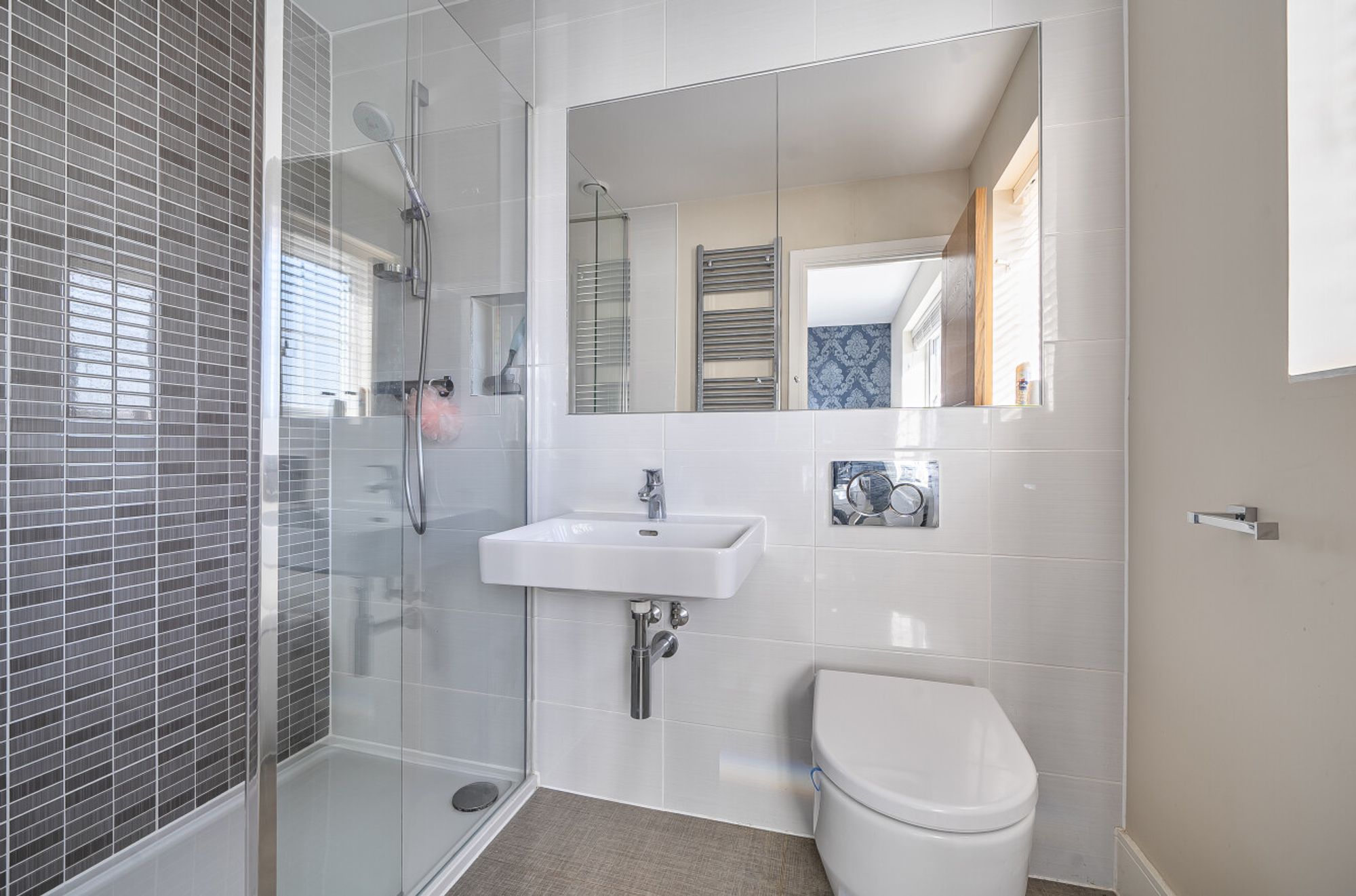 To the first floor, there are four bedrooms, the principal bedroom offers built-in wardrobes and an en-suite shower room with large walk-in shower. There are three further bedrooms and an additional family bathroom, with a shower over the bath, WC and basin.