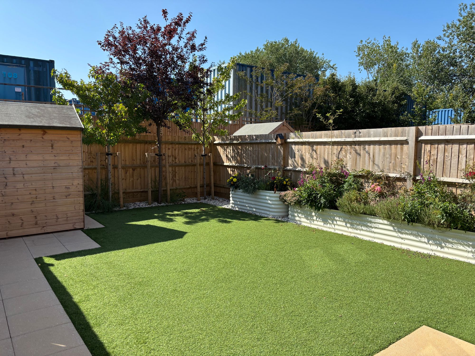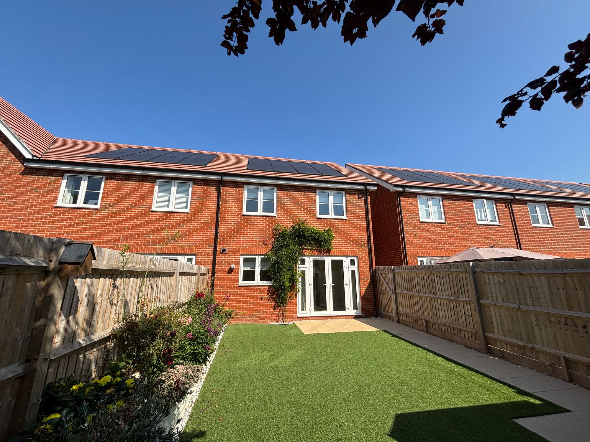 Outside, the property features an open-plan front garden, private driveway with electric vehicle charger (parking for two cars), and a sunny south-facing rear garden with patio, raised beds and low-maintenance imitation lawn.