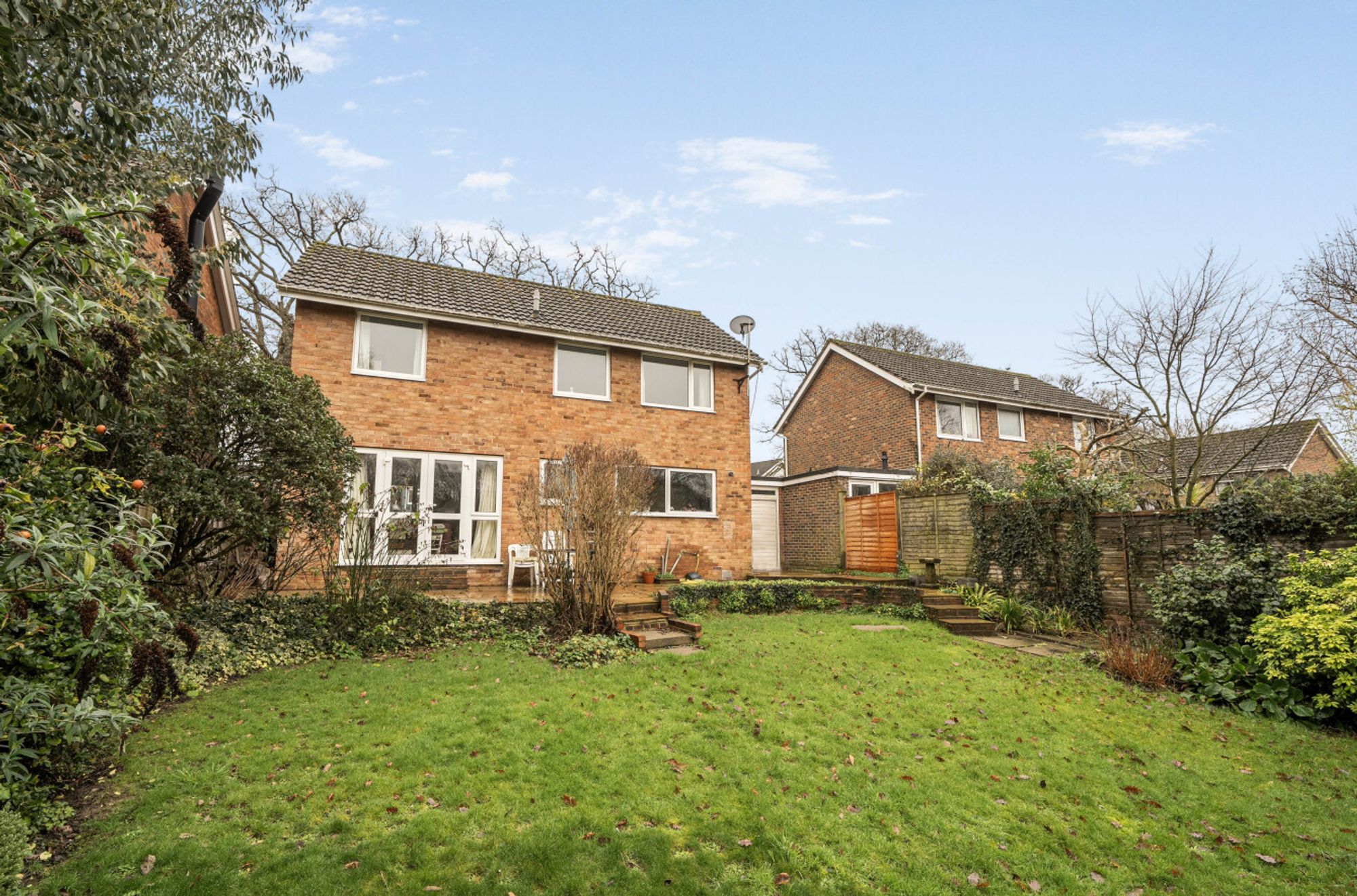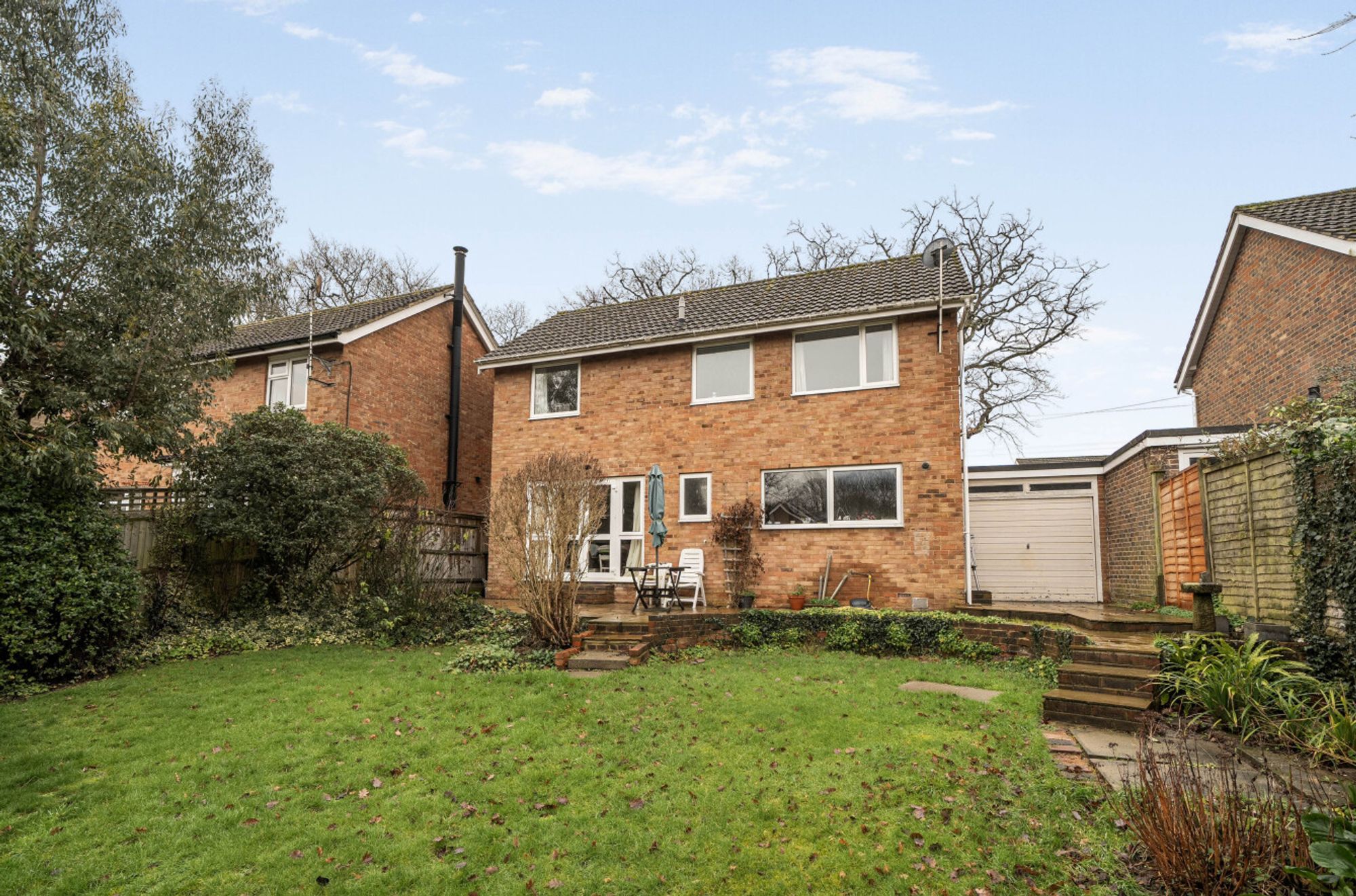 Externally, the property benefits from an open-plan front garden and driveway providing off-road parking, leading to an attached single garage with up-and-over doors to both the front and rear. The attractive westerly-facing rear garden features a paved patio with steps leading up to a lawn with well-stocked borders, as well as an additional seating area at the far end of the garden.