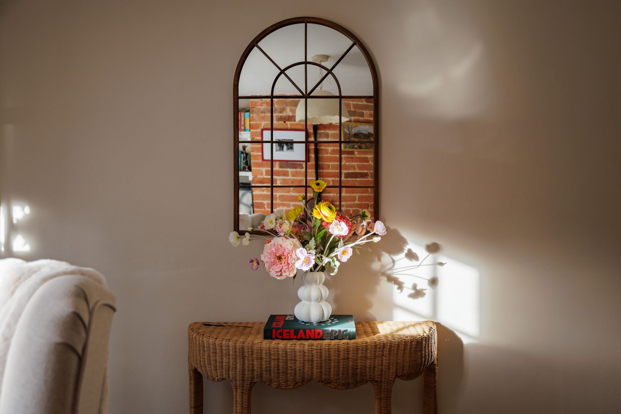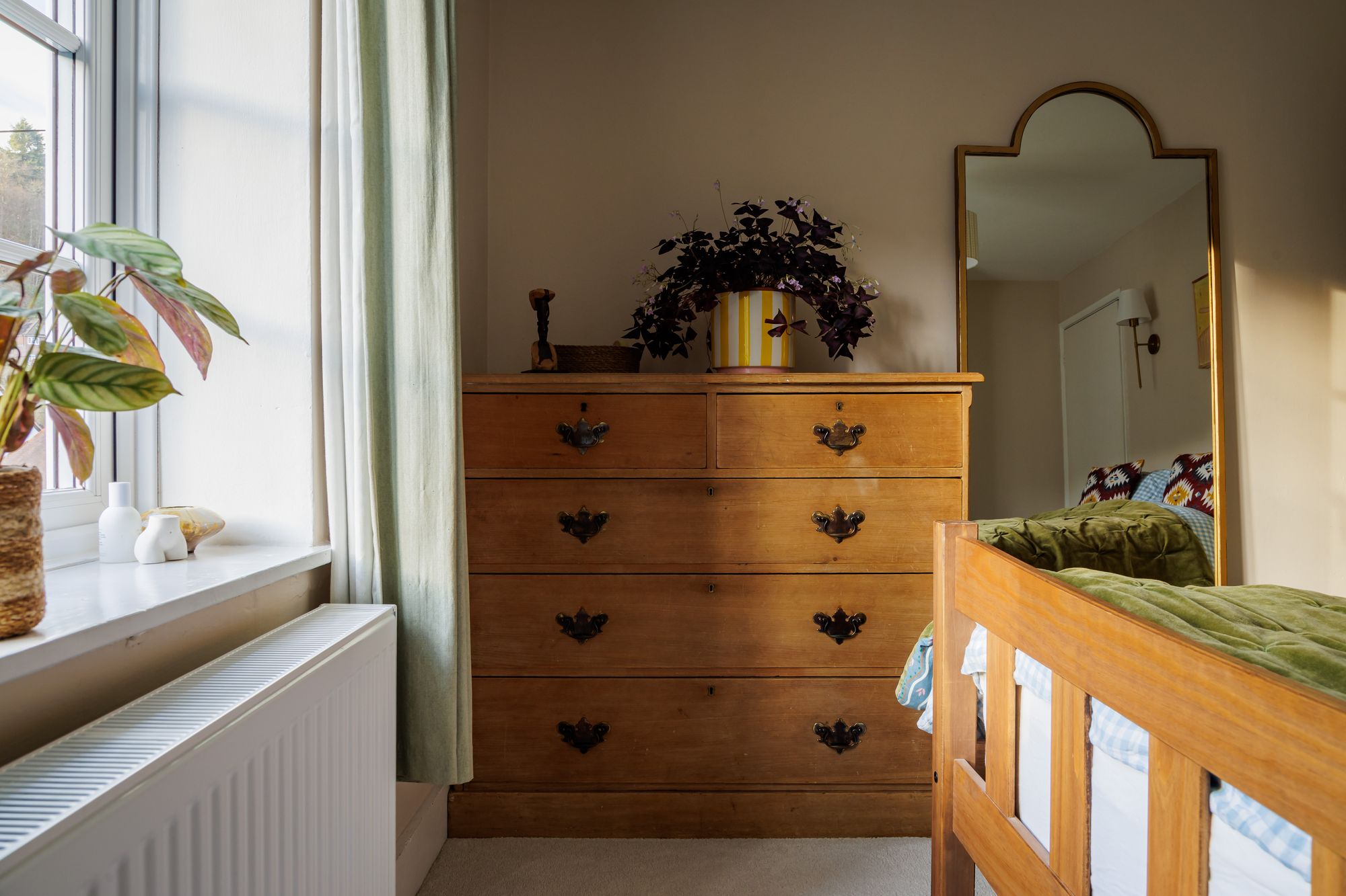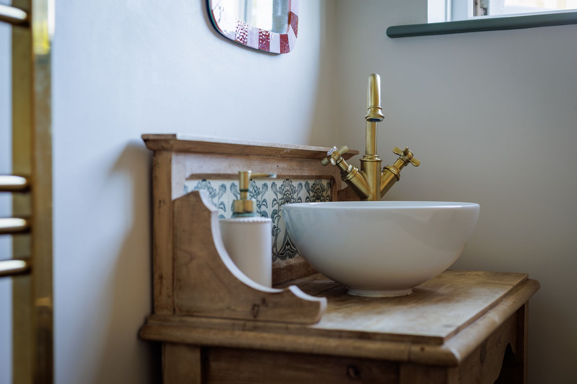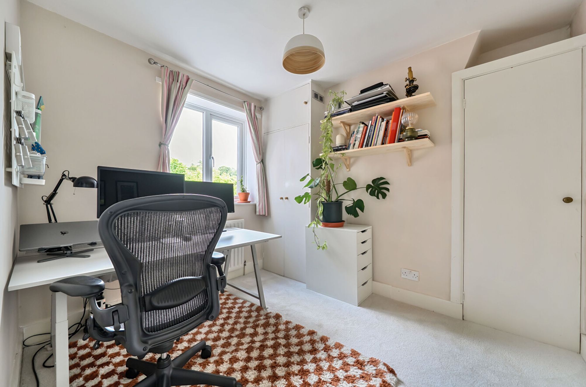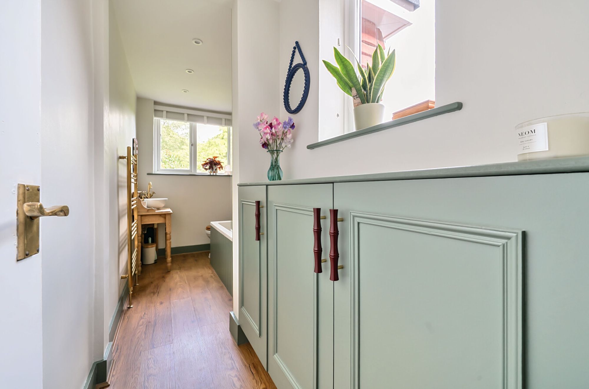 Upstairs, two well-proportioned double bedrooms both benefit from built-in storage. The recently upgraded family bathroom is beautifully finished in calming neutral tones with elegant brass fittings and further storage cupboards.