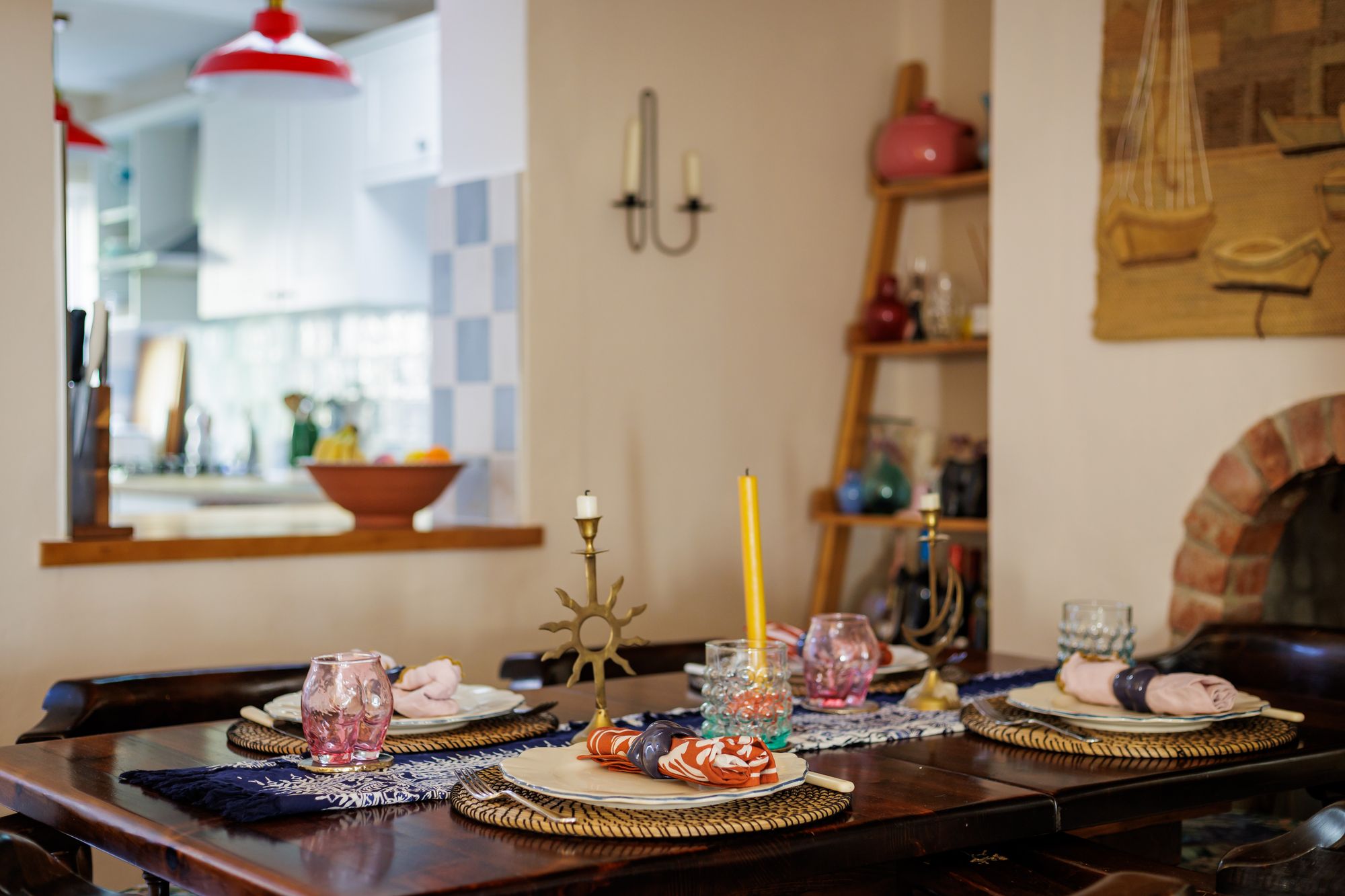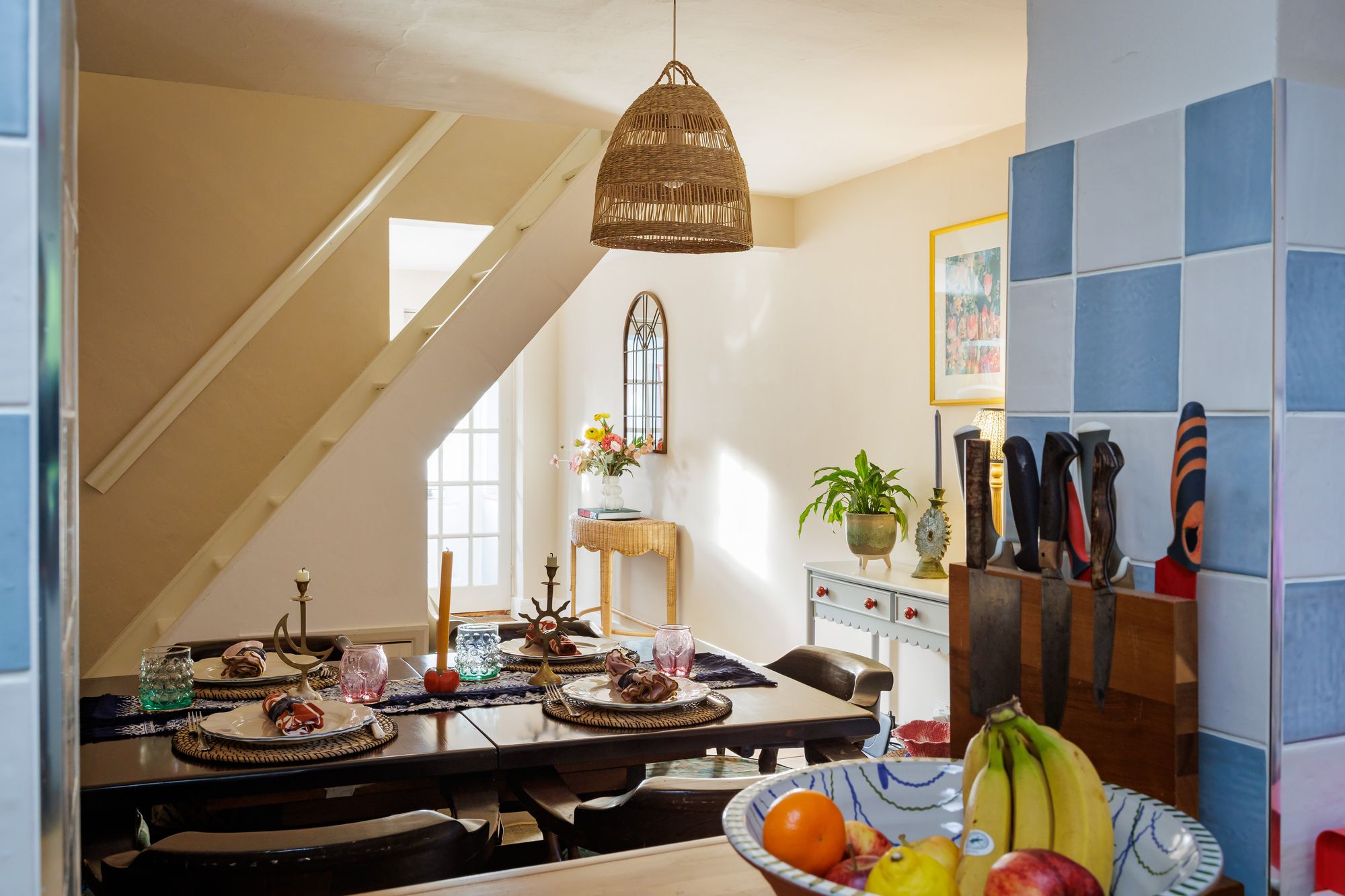 The Shaker-style kitchen, enhanced by a skylight, offers ample storage, wooden worktops, integrated oven and hob, and direct access to the garden. A cloakroom completes the ground floor.