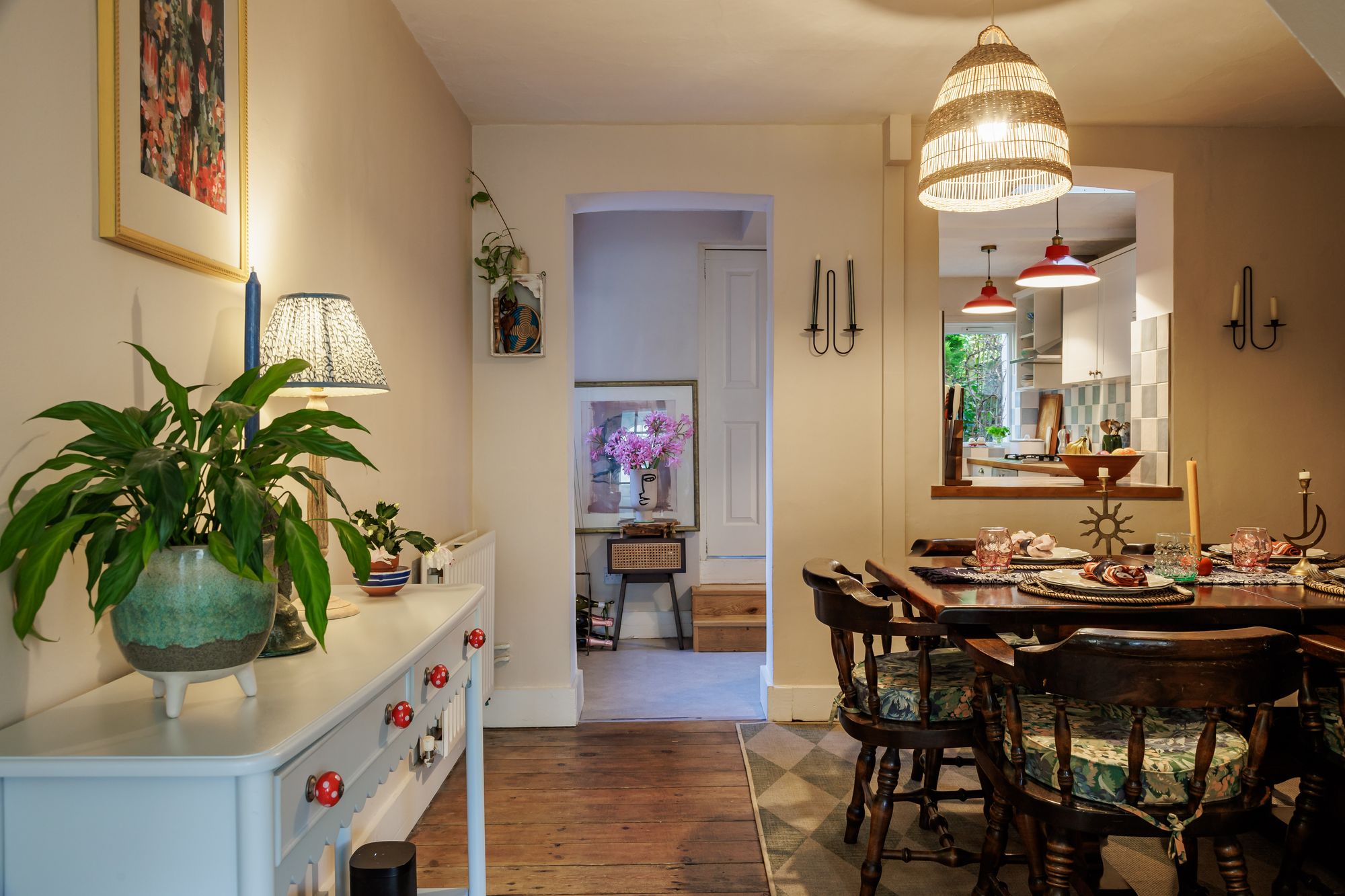 A pretty front garden with mature planting leads to the attractive red-brick façade and gabled porch. The ground floor features a front-aspect sitting room with an exposed brick chimney breast and log burner, flowing through to a spacious dining room with original wood flooring.