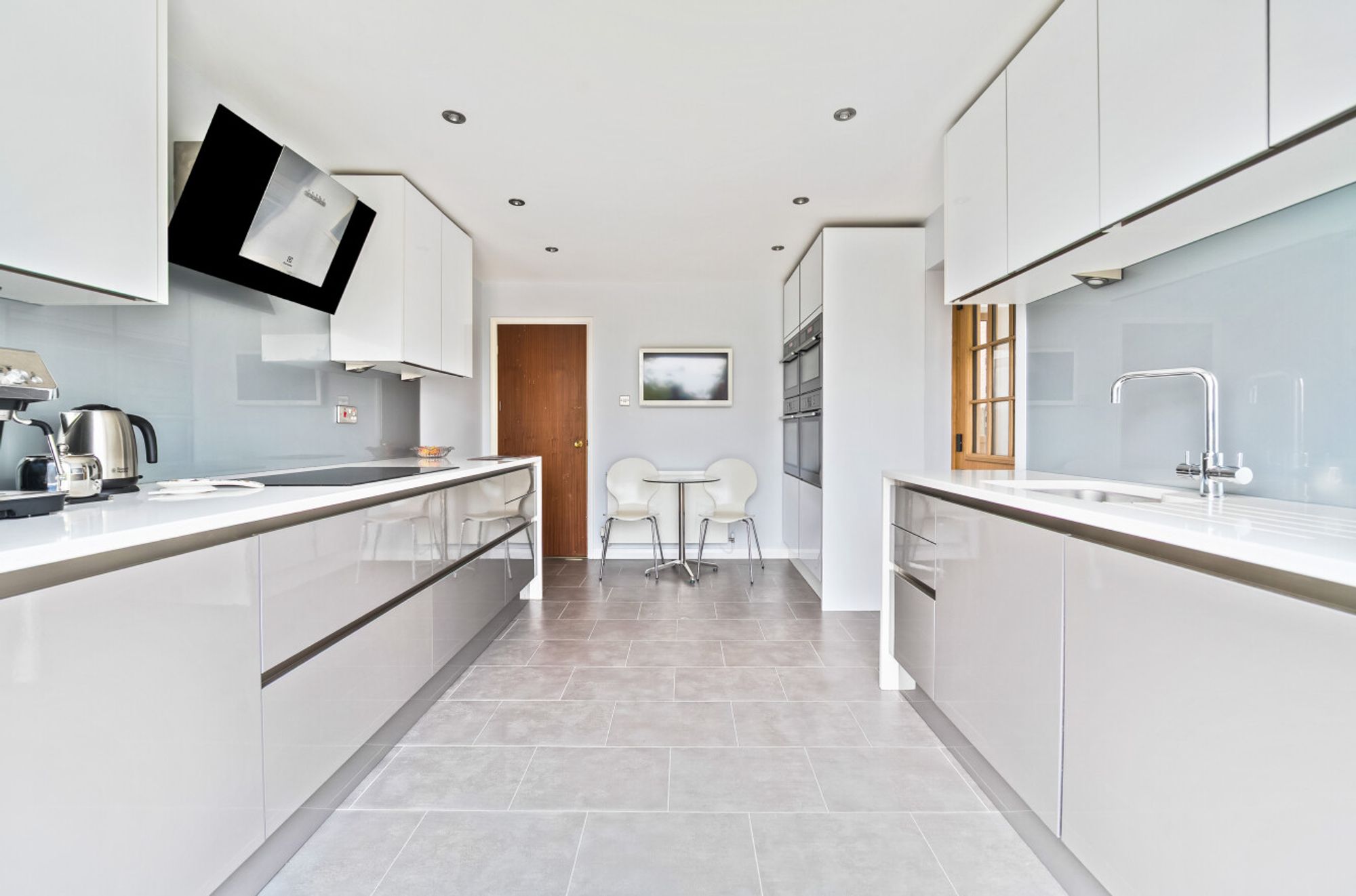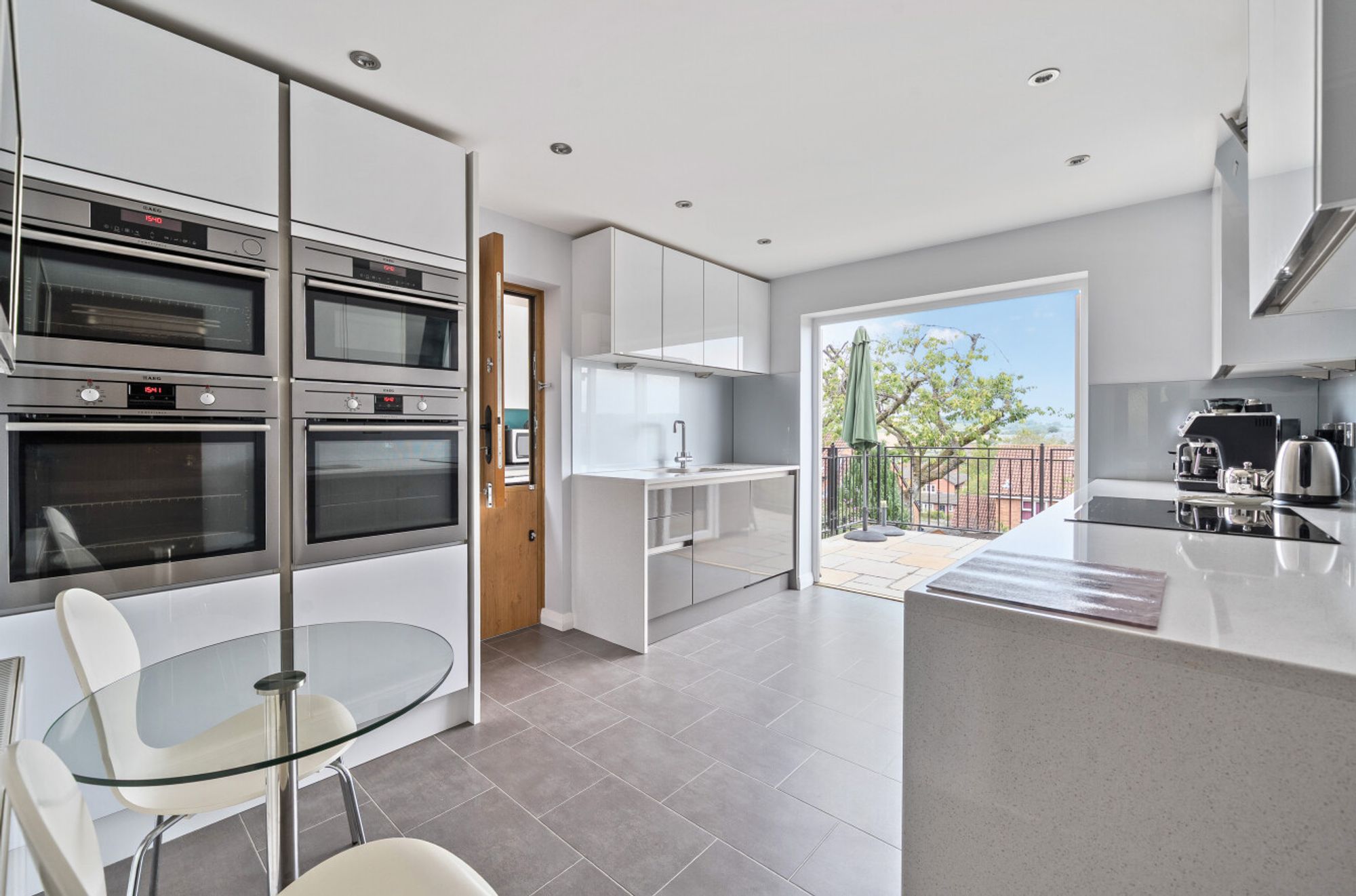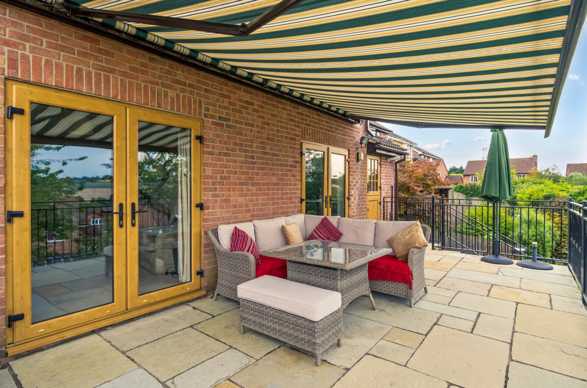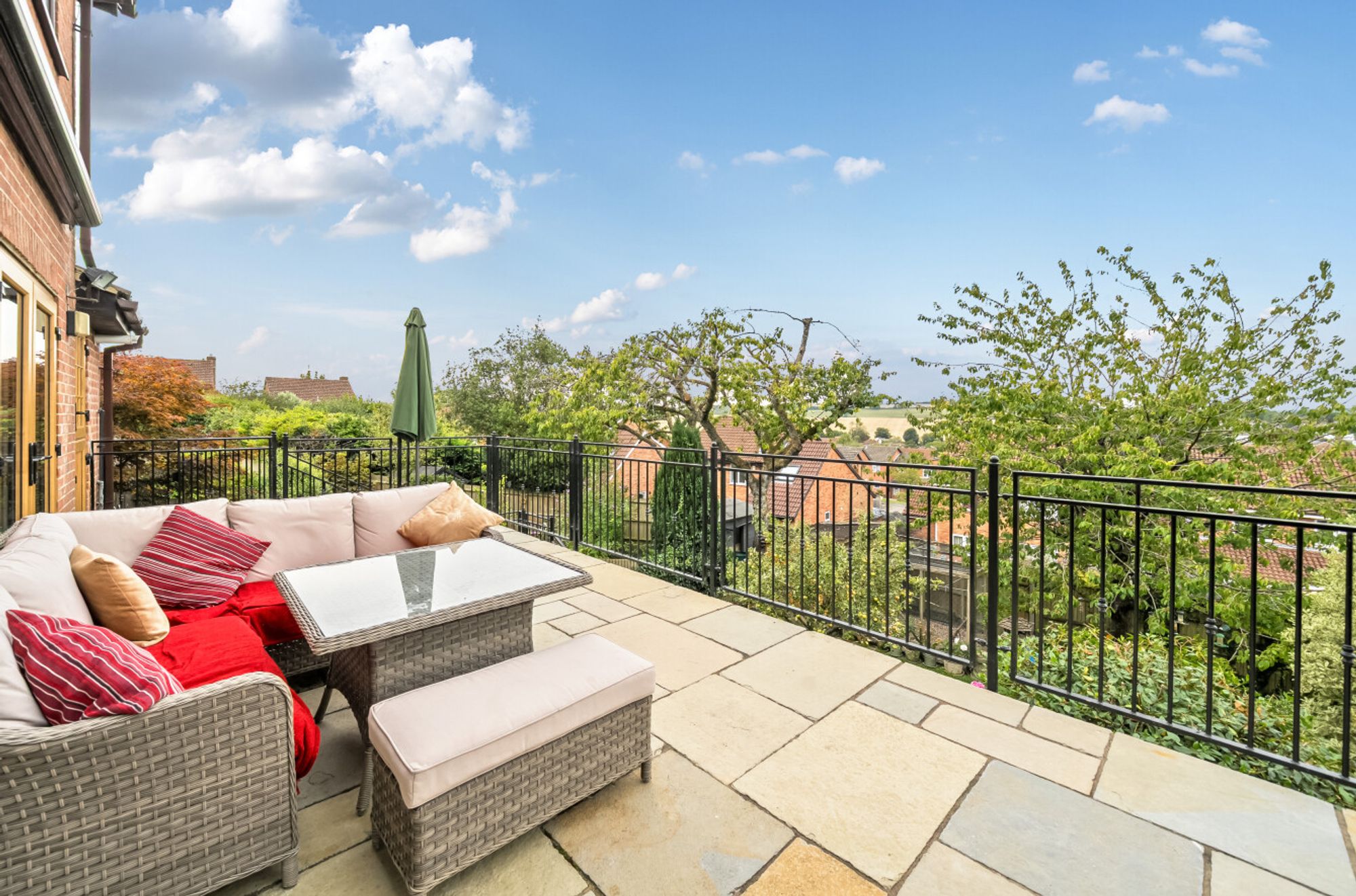 Both the kitchen and the living room feature French doors that open directly onto a spacious rear veranda – a standout feature of the home. This elevated outdoor space offers stunning views over the surrounding area and is ideal for relaxing or al fresco dining. From the veranda, steps lead down to a private, enclosed rear garden, providing a safe and peaceful environment for children to play or to enjoy summer evenings.