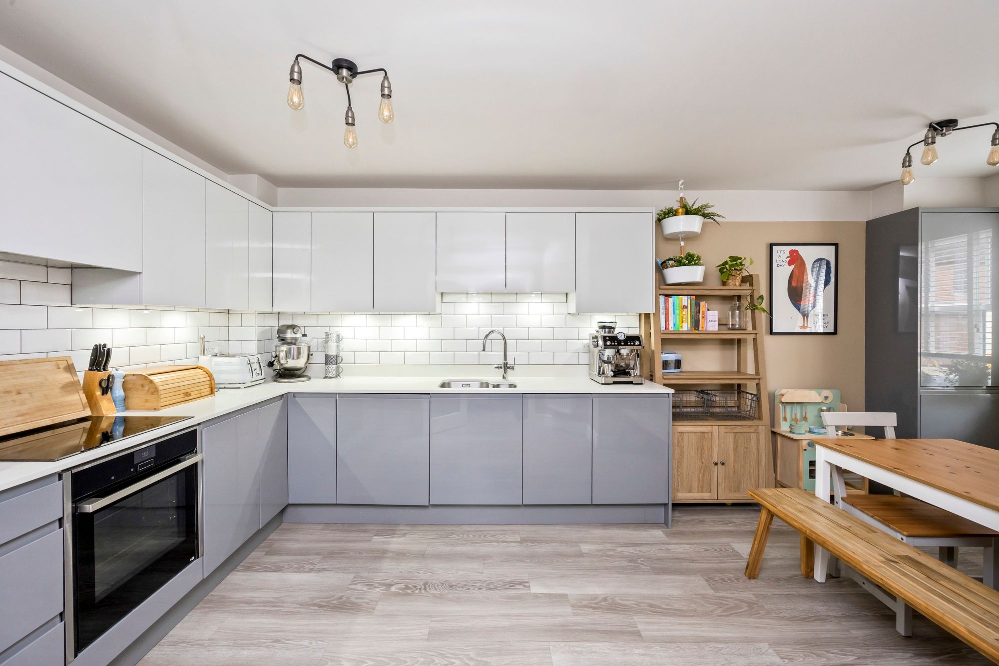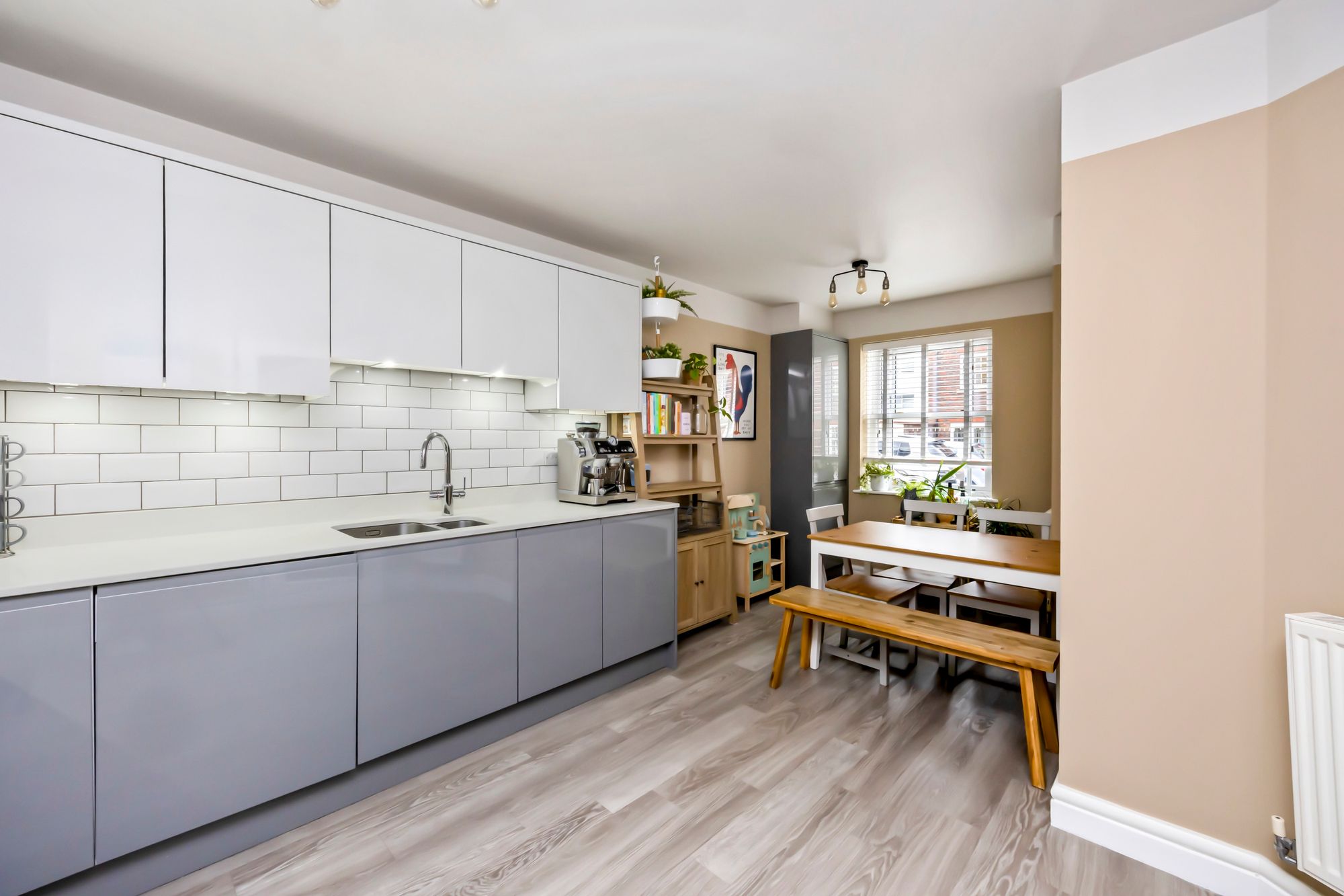 To the ground floor - the reception hallway welcomes you and leads into a stunning open plan kitchen/dining room. The kitchen has been finished with gloss grey cabinetry, quartz work surfaces running through and a selection of high-end integrated appliances. There is ample space for dining table and the aspect to the front of the property provides a light and airy feel.