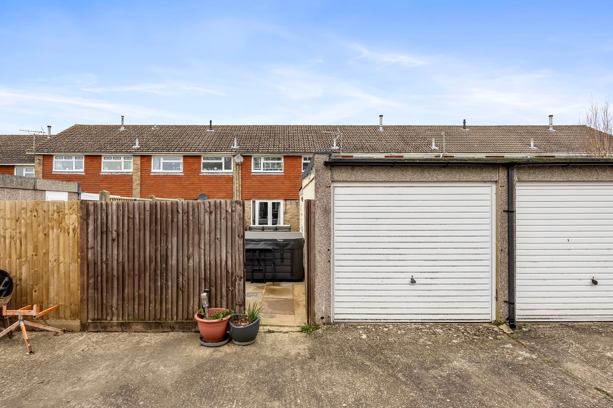 The garage can be accessed both from the garden and a rear service road, providing flexibility for various needs. To the front of the house, there is off road driveway parking, ensuring convenience for homeowners and visitors alike.