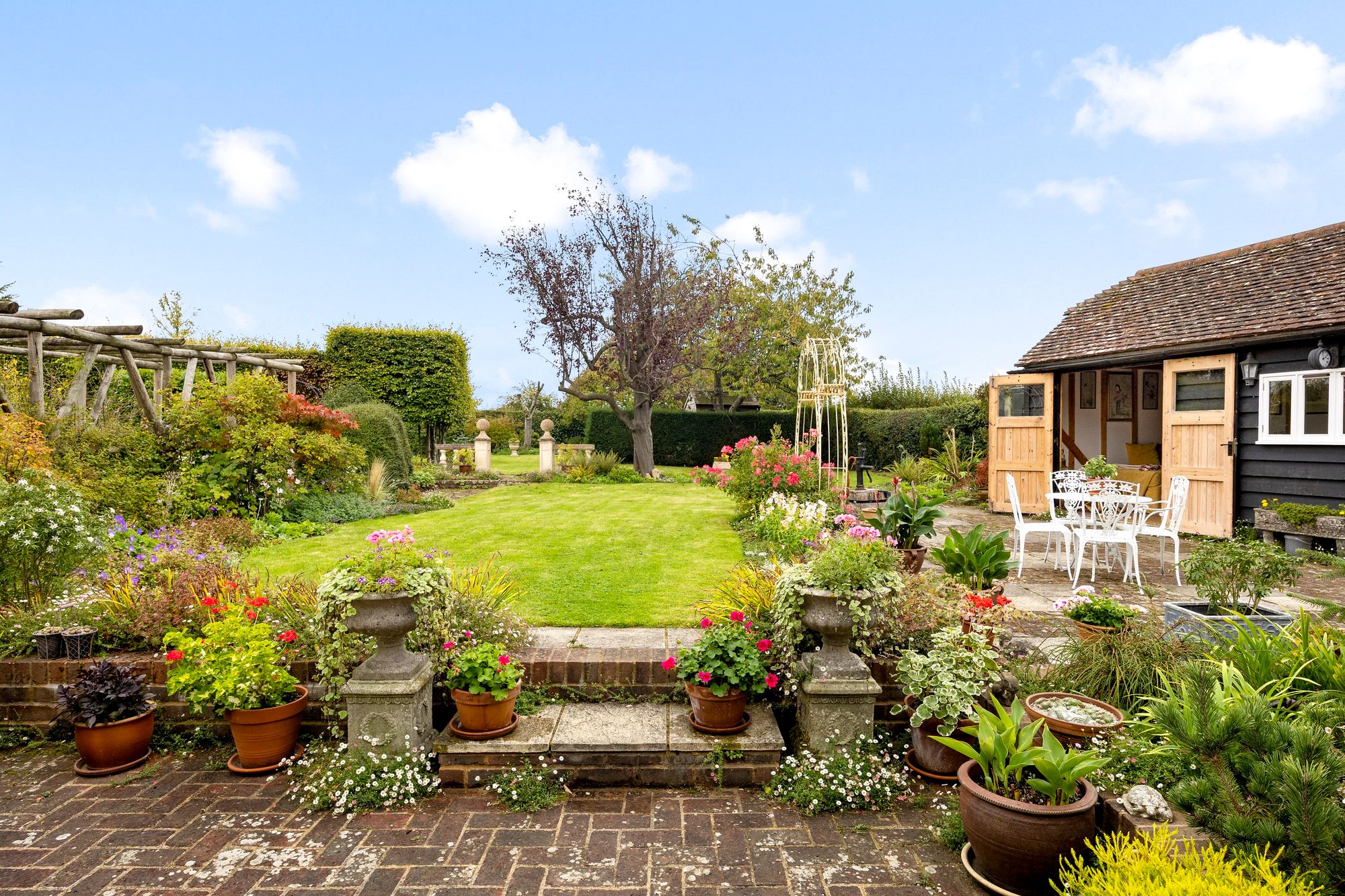 Multiple seating and dining terraces offer ideal spaces for outdoor entertaining during the warmer months. A substantial detached garden building provides a superb additional family room with vaulted, beamed ceilings and large doors opening onto the terrace—perfect for use as a studio, office, or guest accommodation.