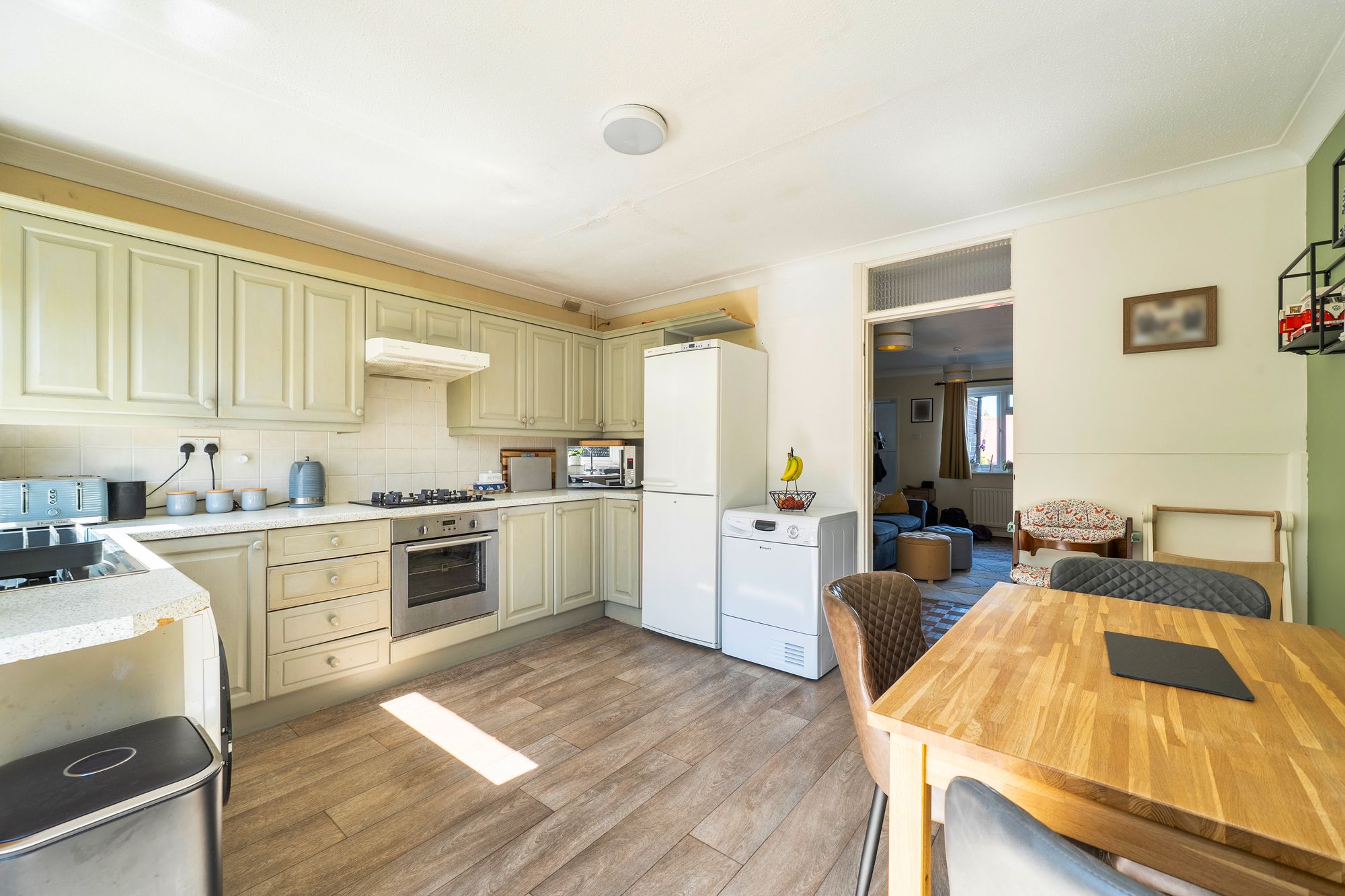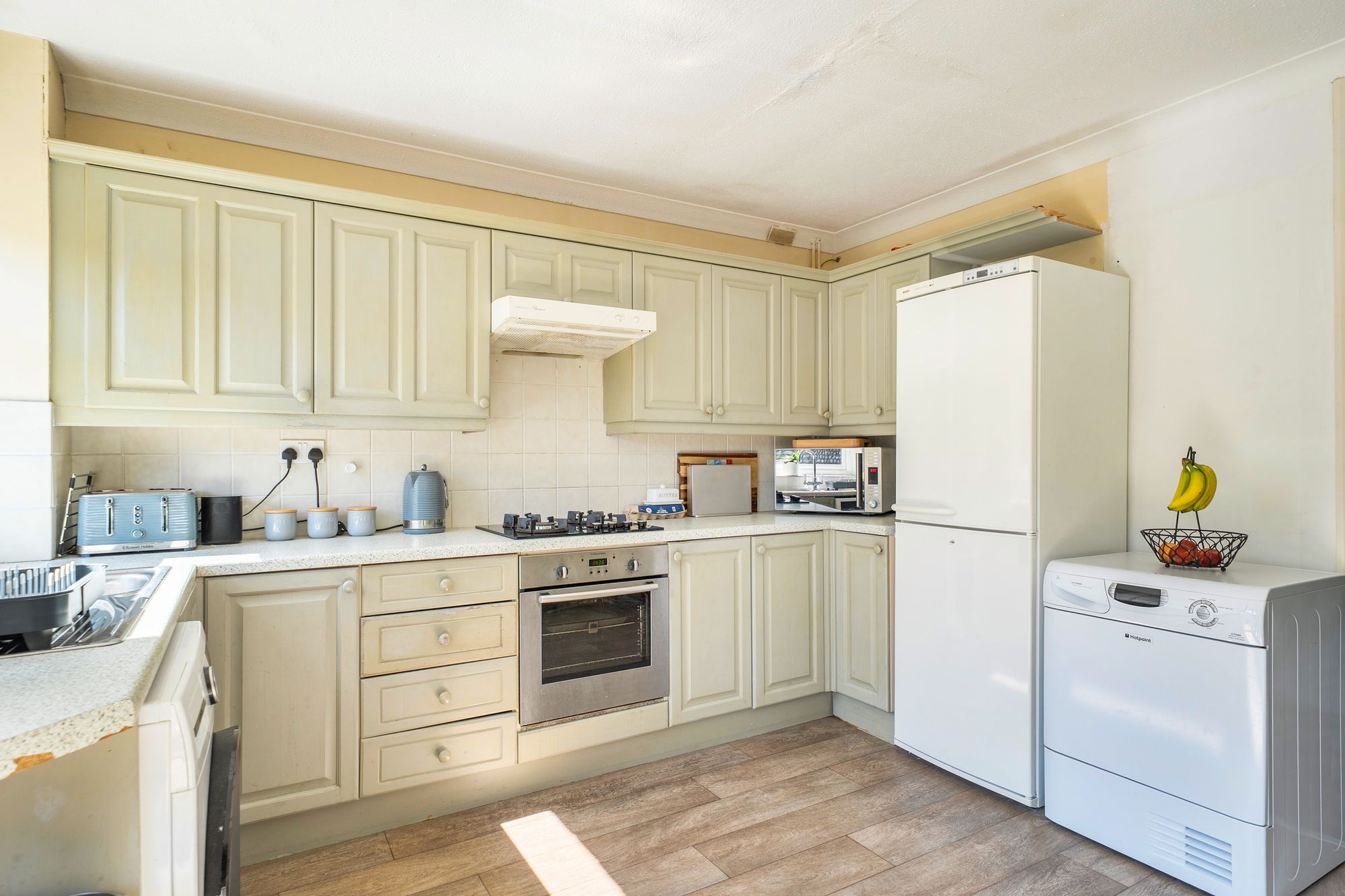 Upon entering, you are welcomed by an entrance hall that provides a generous storage cupboard, perfect for coats, shoes or household essentials. The sitting room is a bright and welcoming space, featuring a charming wood burner and attractive wood flooring that adds character and a touch of elegance. The kitchen is thoughtfully designed, offering a comprehensive range of cupboards, a gas hob, an electric oven, and ample space for additional appliances (such as a fridge freezer or dishwasher), while French doors invite natural light and provide a pleasant outlook.