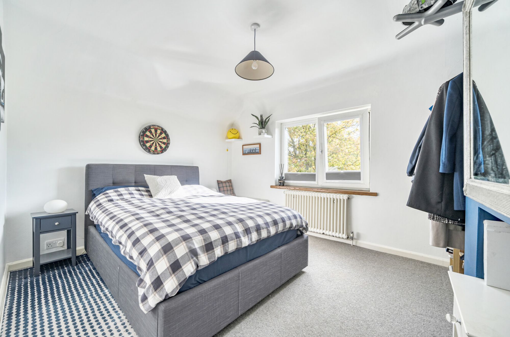 Inside, the entrance hall features a tiled floor with electric underfloor heating, space for coats and stairs rising to the first floor. To the front of the house are two charming reception rooms—originally one larger space—currently arranged as a sitting room with a double-glazed bay window (fitted blinds) and feature fireplace, and a double-aspect snug, currently used as a sewing room, also with double-glazed windows and fitted blinds.