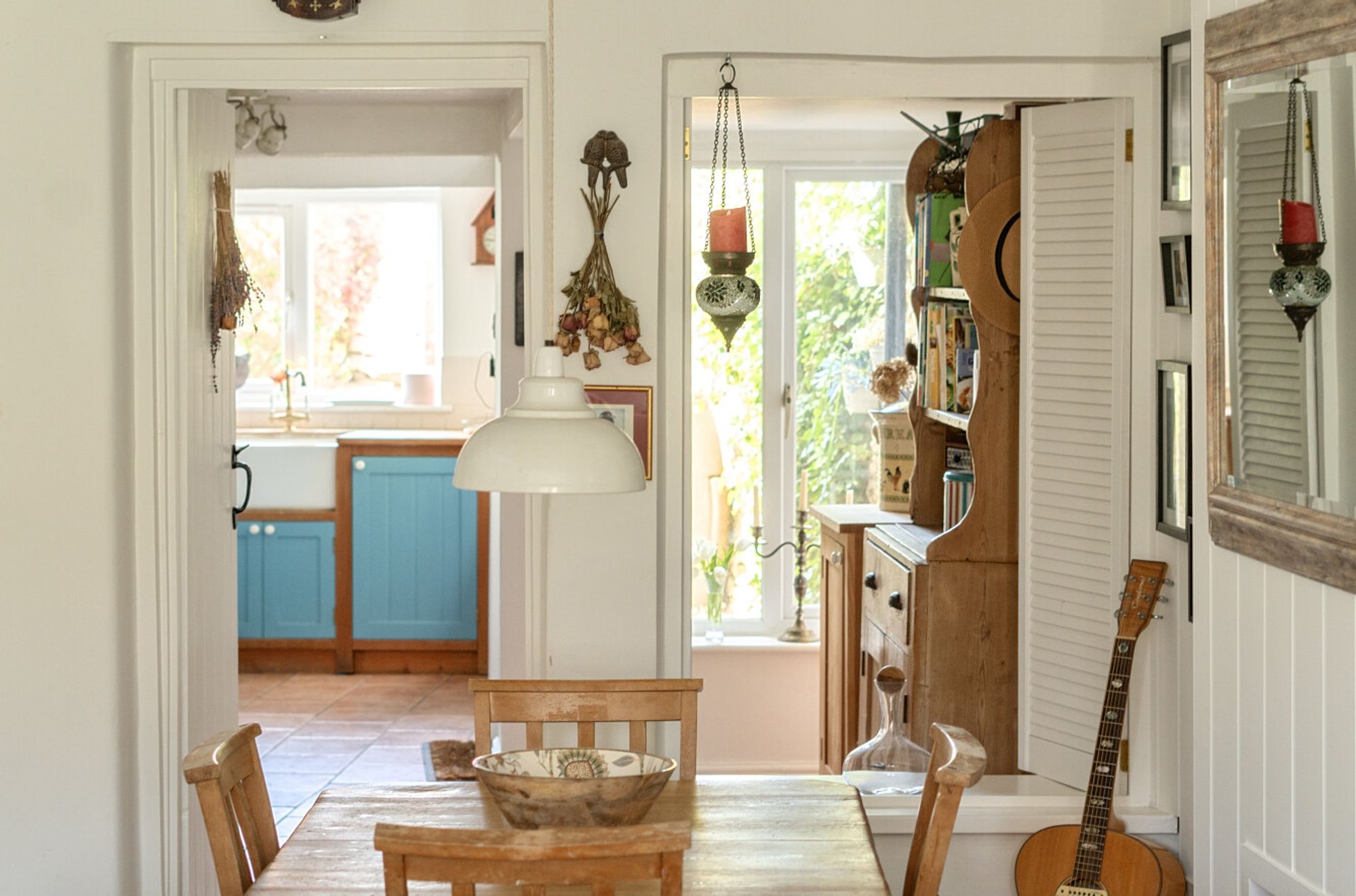 The classic Shaker-style kitchen is both stylish and practical, featuring a traditional butler sink and a recessed cooking area with an electric oven and gas hob. A half-glazed door provides direct access to the garden, seamlessly connecting indoor and outdoor living.