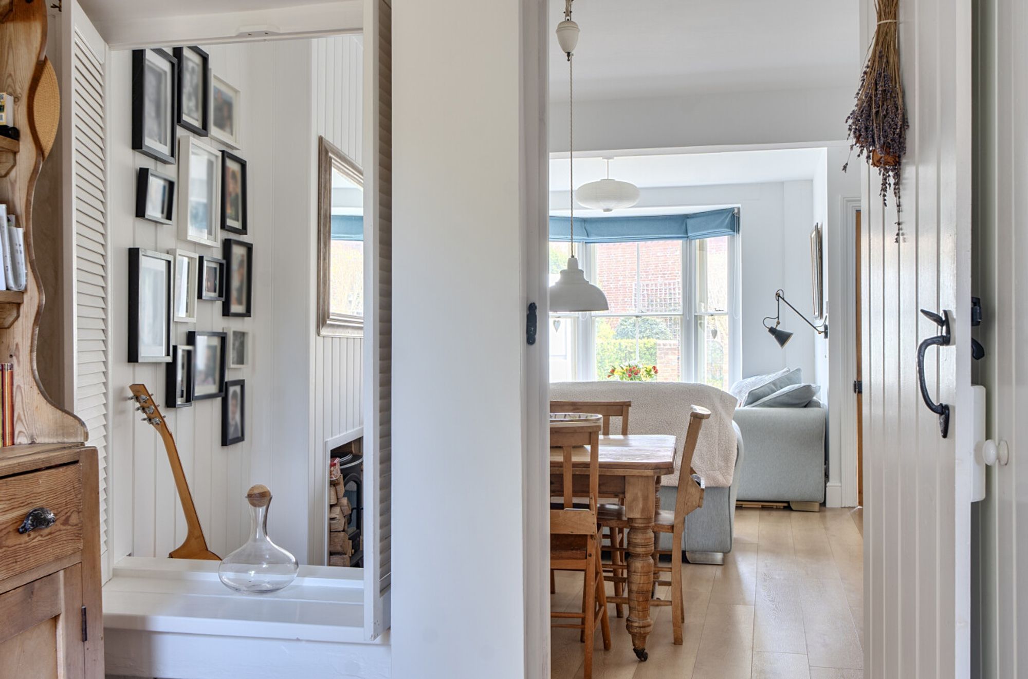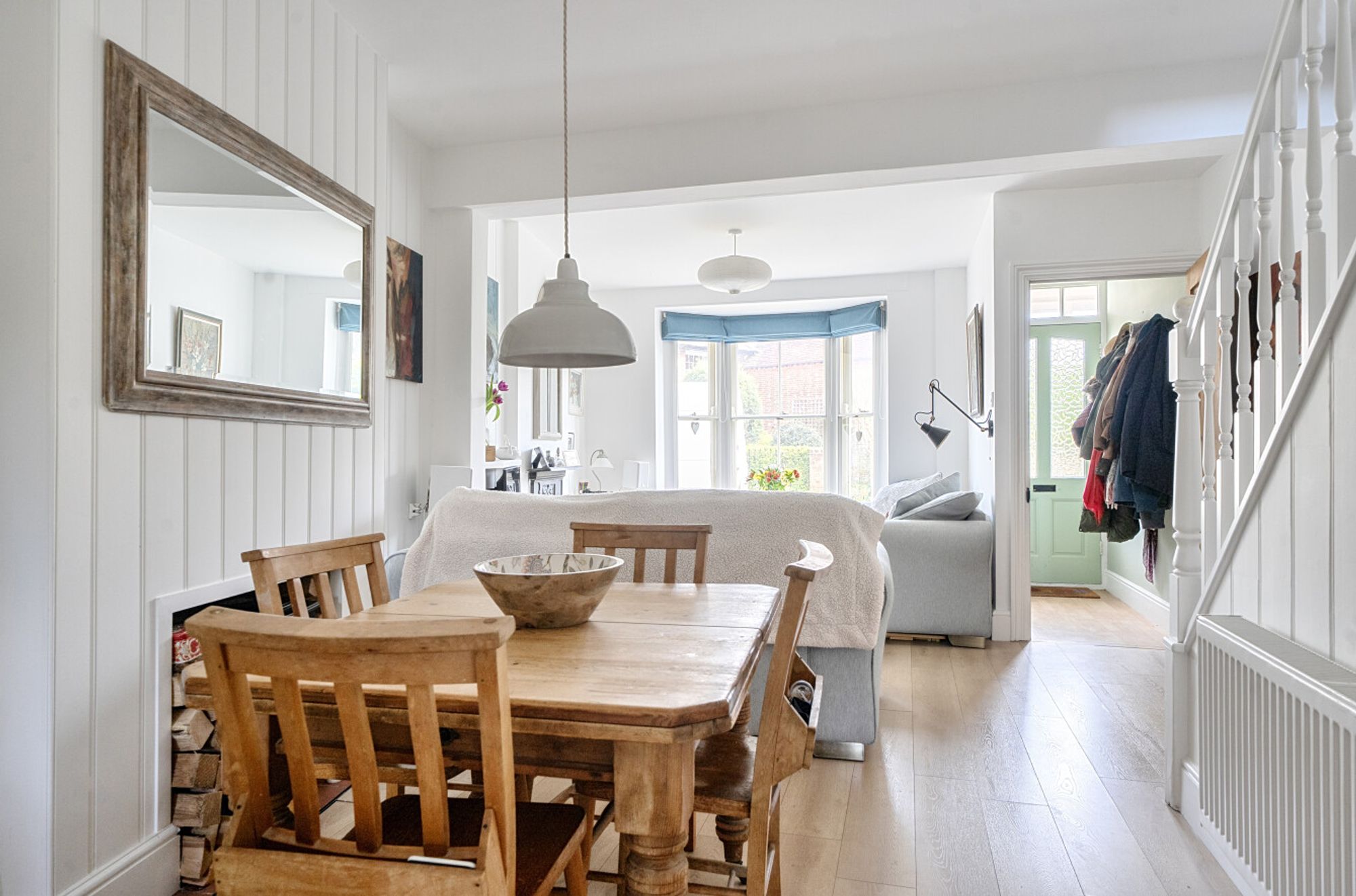 At the heart of the home is a bright and inviting dual-aspect open-plan sitting and dining room. This elegant living space is filled with natural light and features a charming bay window alongside a characterful open fireplace, creating a warm and sophisticated setting for both relaxation and entertaining.