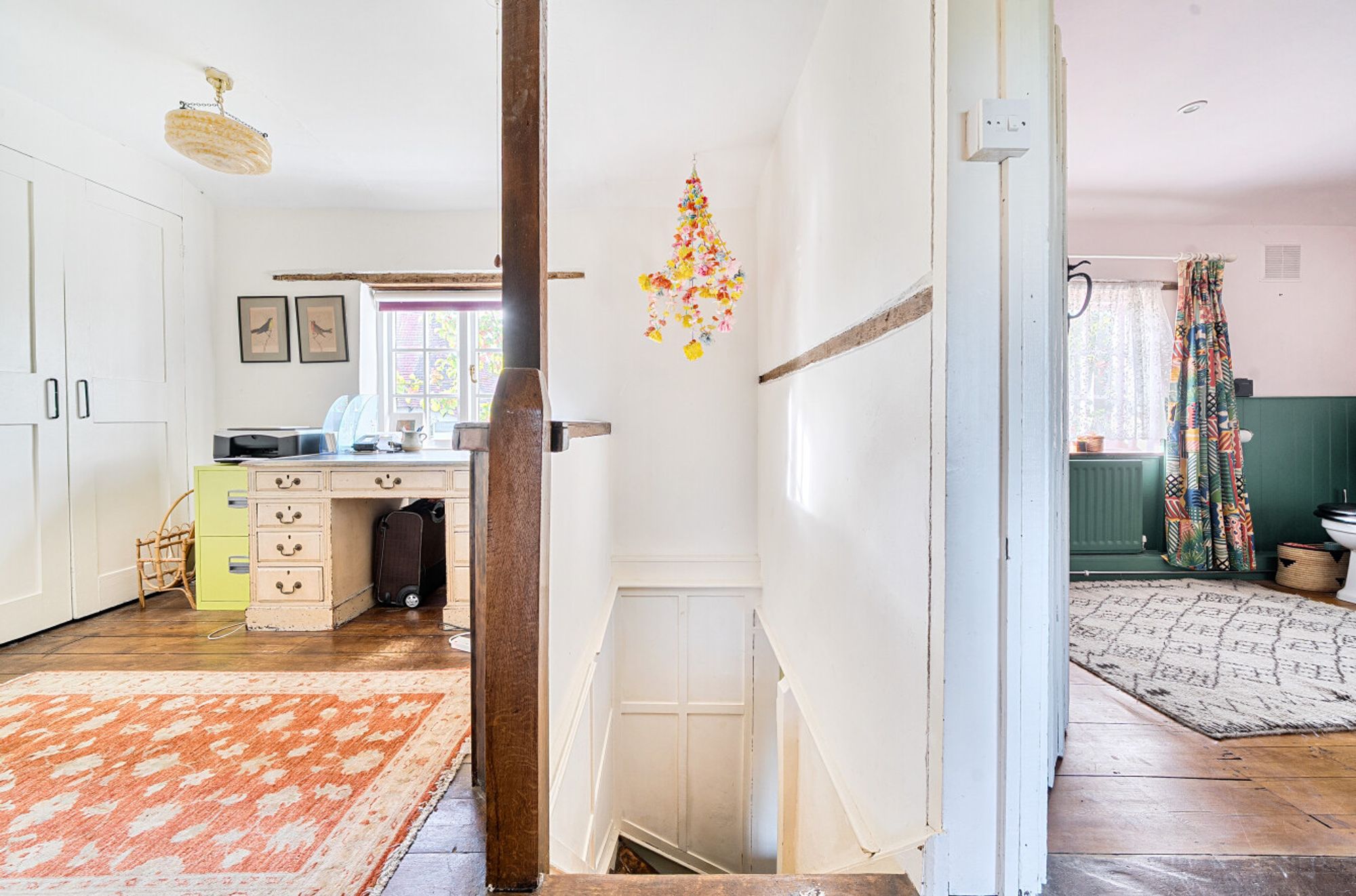 Upstairs, the landing includes a study area, two double bedrooms, and a generously sized bathroom with a walk-in shower.