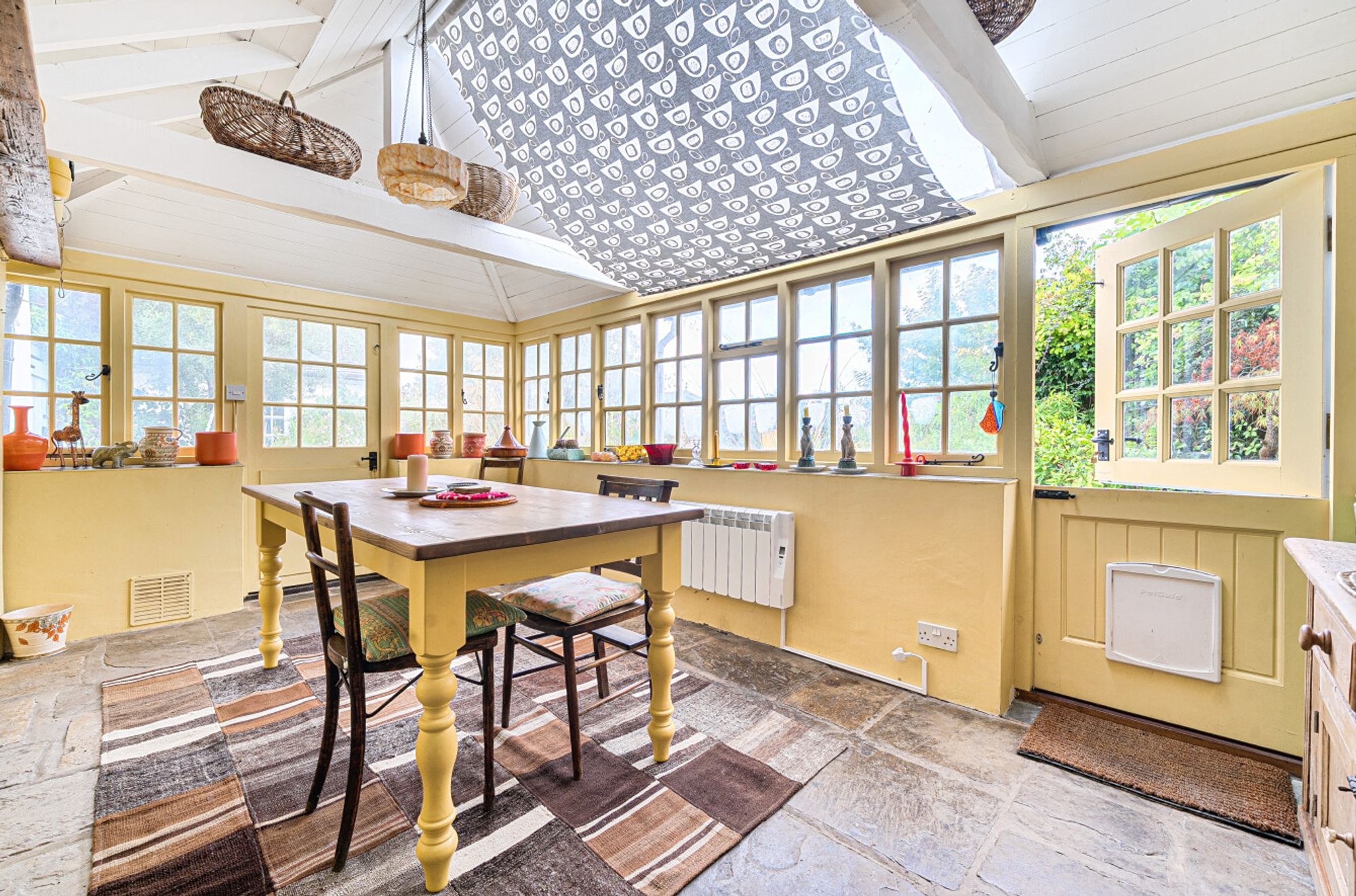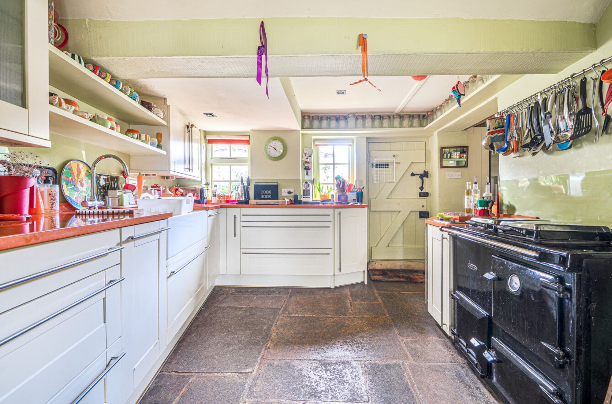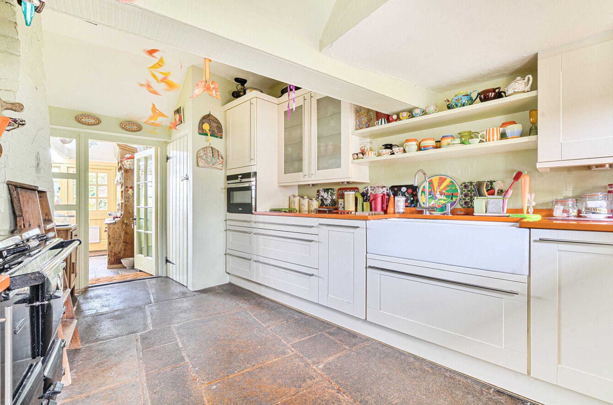 Inside, the entrance hall opens seamlessly into a cosy sitting room with a multi-fuel burning stove, low beamed ceiling (5’6”) and French doors leading to the south-facing garden. The L-shaped kitchen/utility room features classic shaker-style cabinetry, a Siemens eye-level oven, Neff ceramic hob, flagstone flooring, a gas-fired Rayburn and a door to the conservatory/dining room beyond.