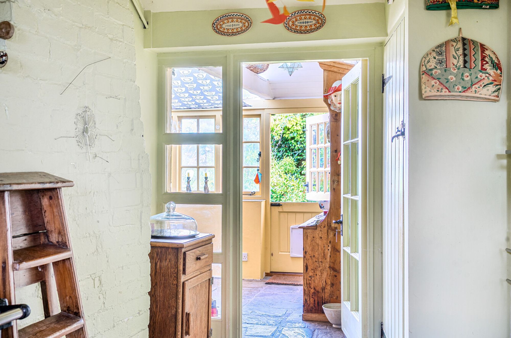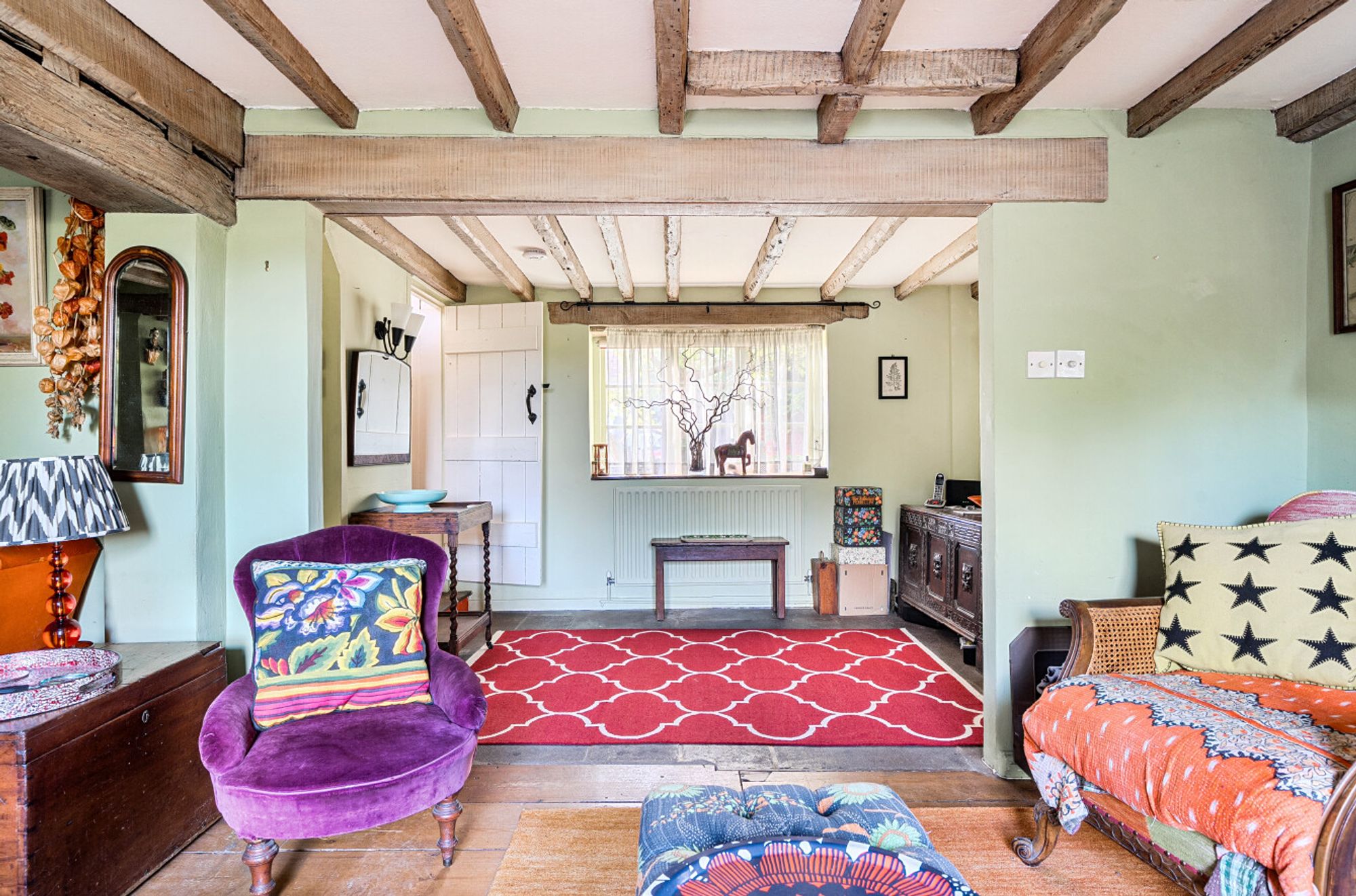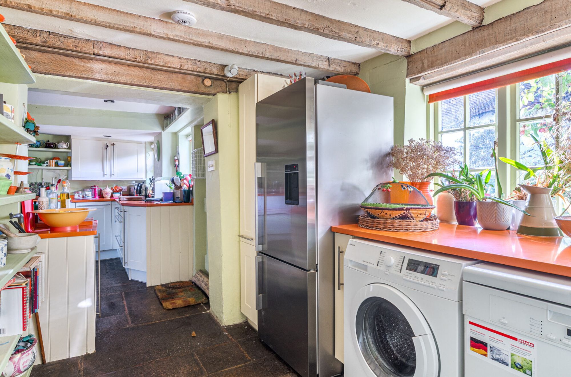 Inside, the entrance hall opens seamlessly into a cosy sitting room with a multi-fuel burning stove, low beamed ceiling (5’6”) and French doors leading to the south-facing garden. The L-shaped kitchen/utility room features classic shaker-style cabinetry, a Siemens eye-level oven, Neff ceramic hob, flagstone flooring, a gas-fired Rayburn and a door to the conservatory/dining room beyond.