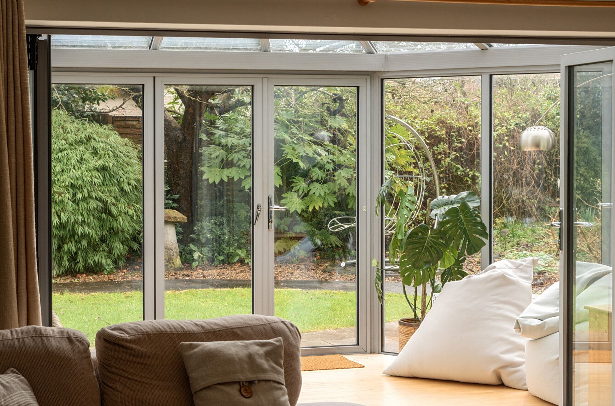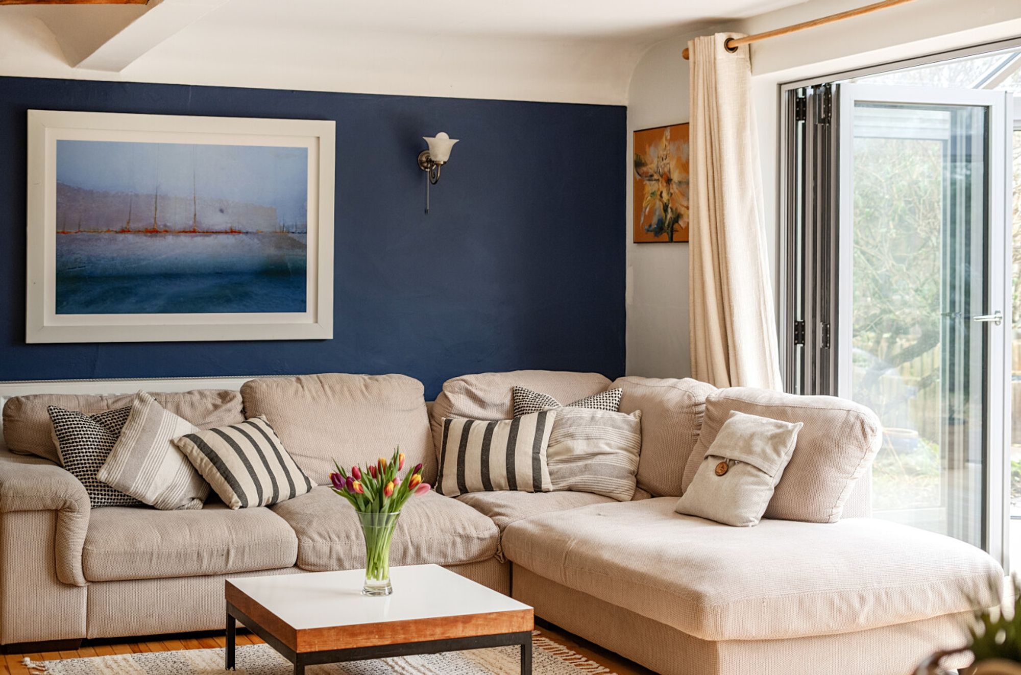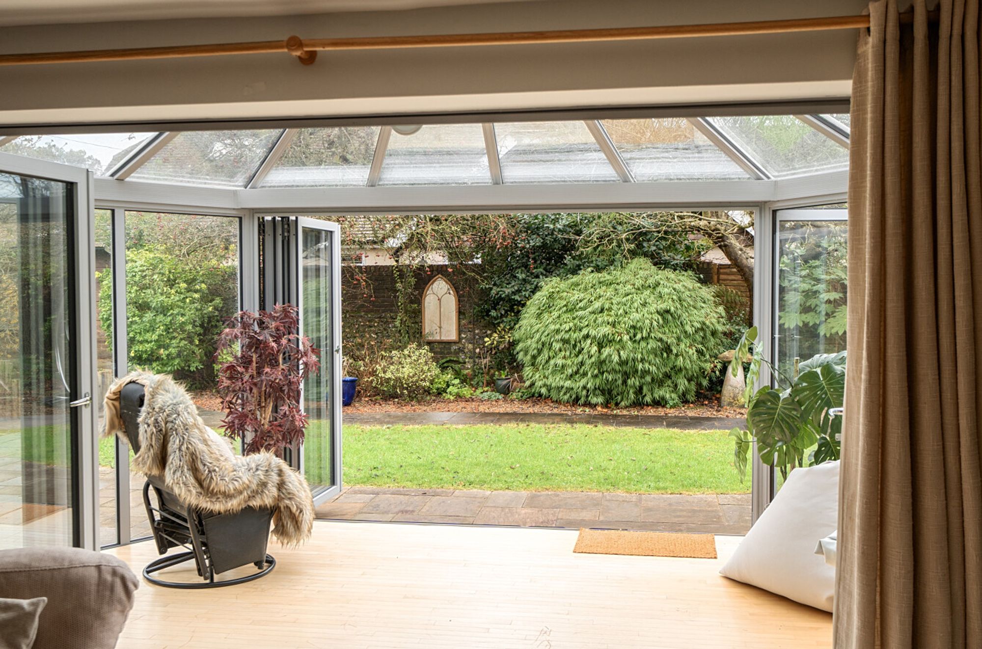 An attractive open porch leads into a welcoming entrance hall that extends along the northern side of the property. From here, glazed double doors open into a peaceful, sun-filled sitting room featuring a wood-burning stove and bi-folding doors that flow seamlessly into a distinctive five-sided conservatory, creating a superb connection between the living space and garden.