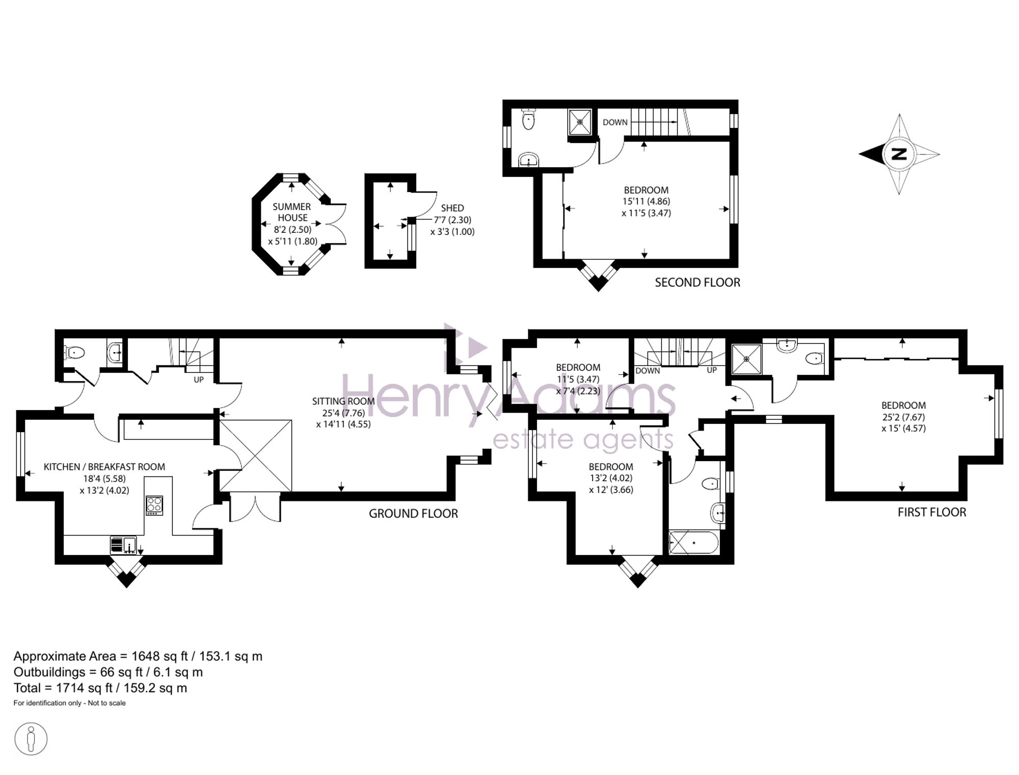 On the first floor, the principal bedroom boasts an attractive vaulted ceiling, fitted wardrobes, and an en-suite shower room. Two further bedrooms and a family bathroom complete this level. The top floor provides an additional double bedroom with its own en-suite facilities, offering ideal guest or family accommodation.