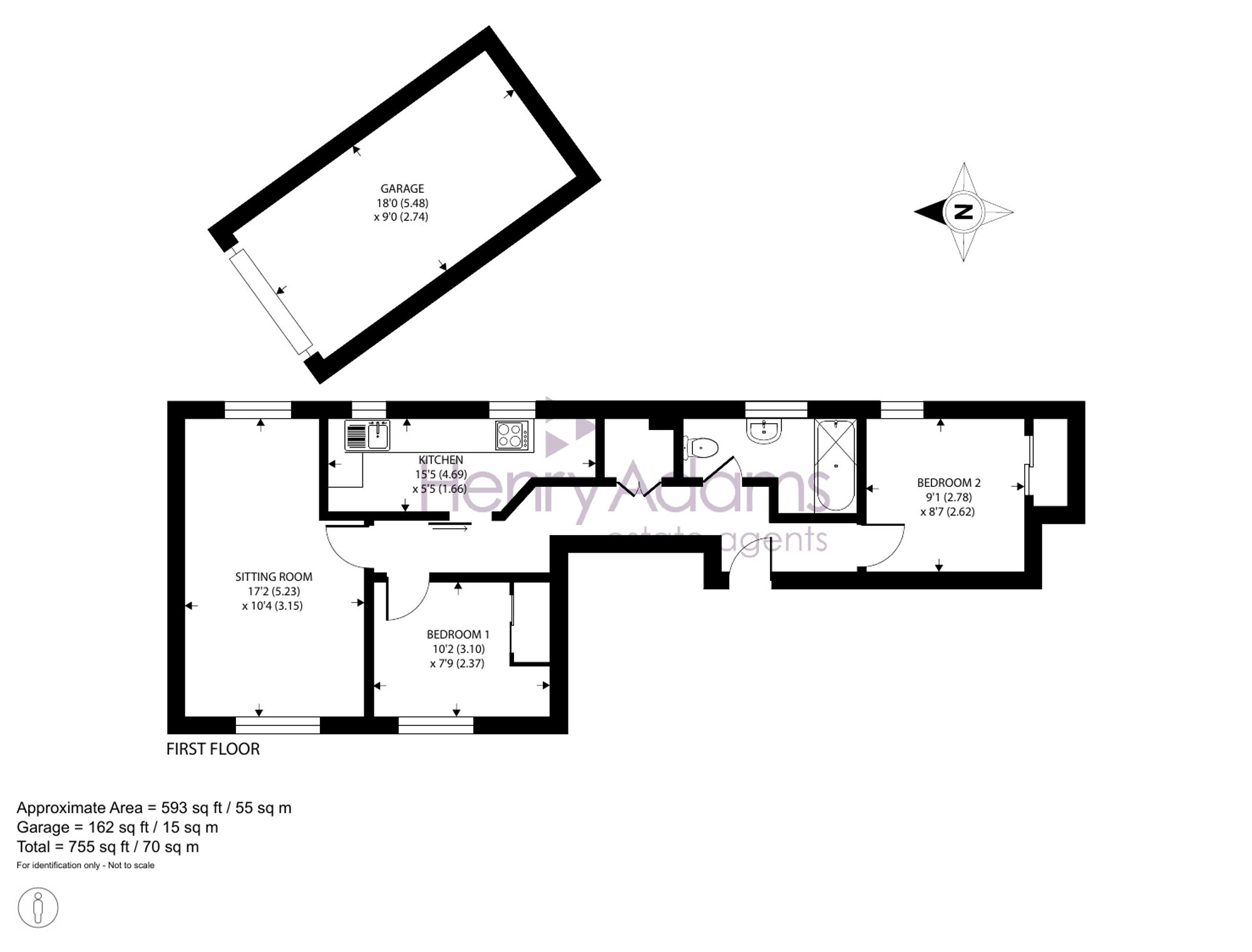 The accommodation comprises an entrance hallway, a sunny dual-aspect sitting room with east and west facing windows, a fitted kitchen, two well-proportioned bedrooms, and a bathroom with an electric shower over the bath. The apartment is heated by gas central heating via radiators.