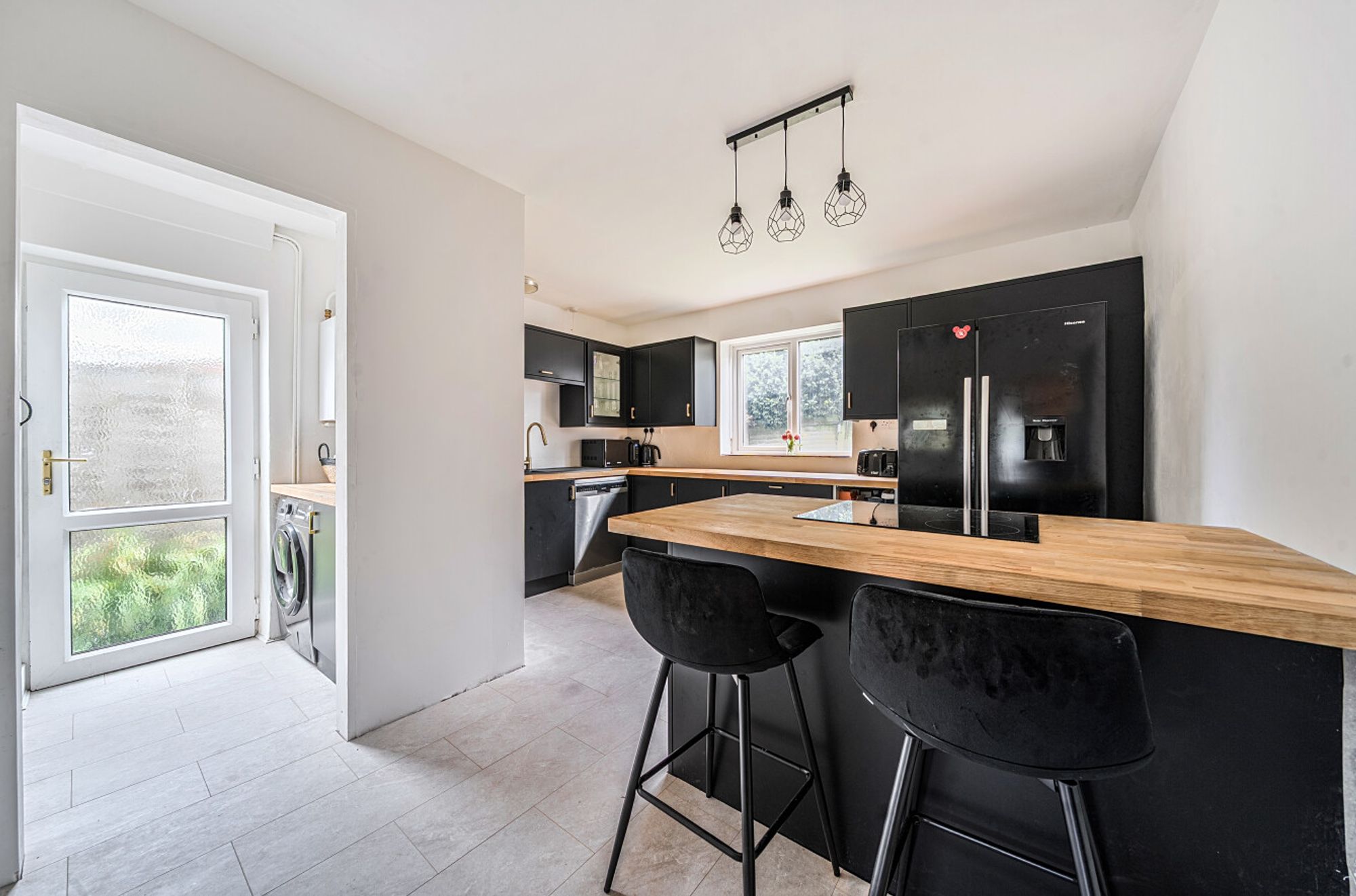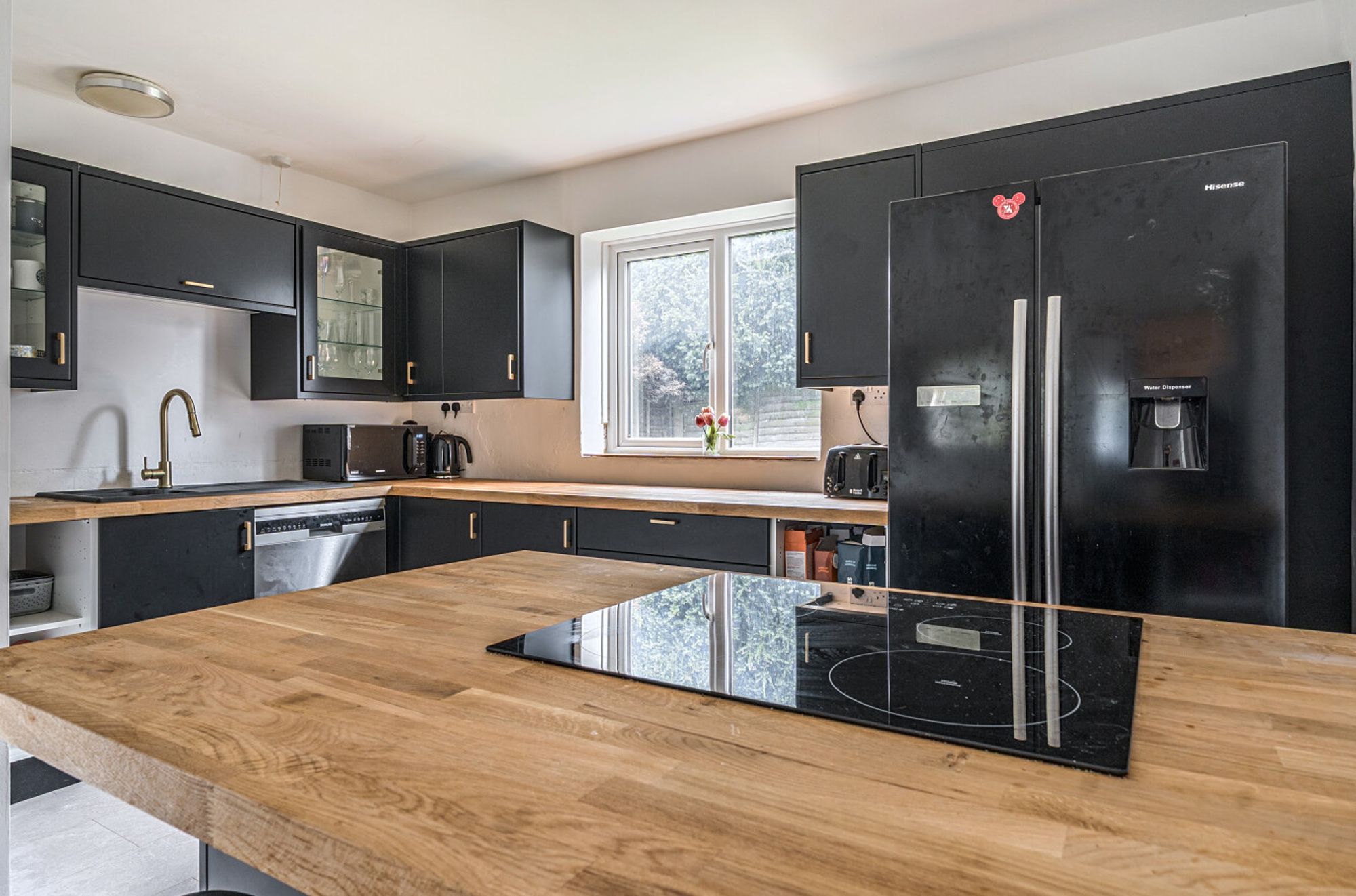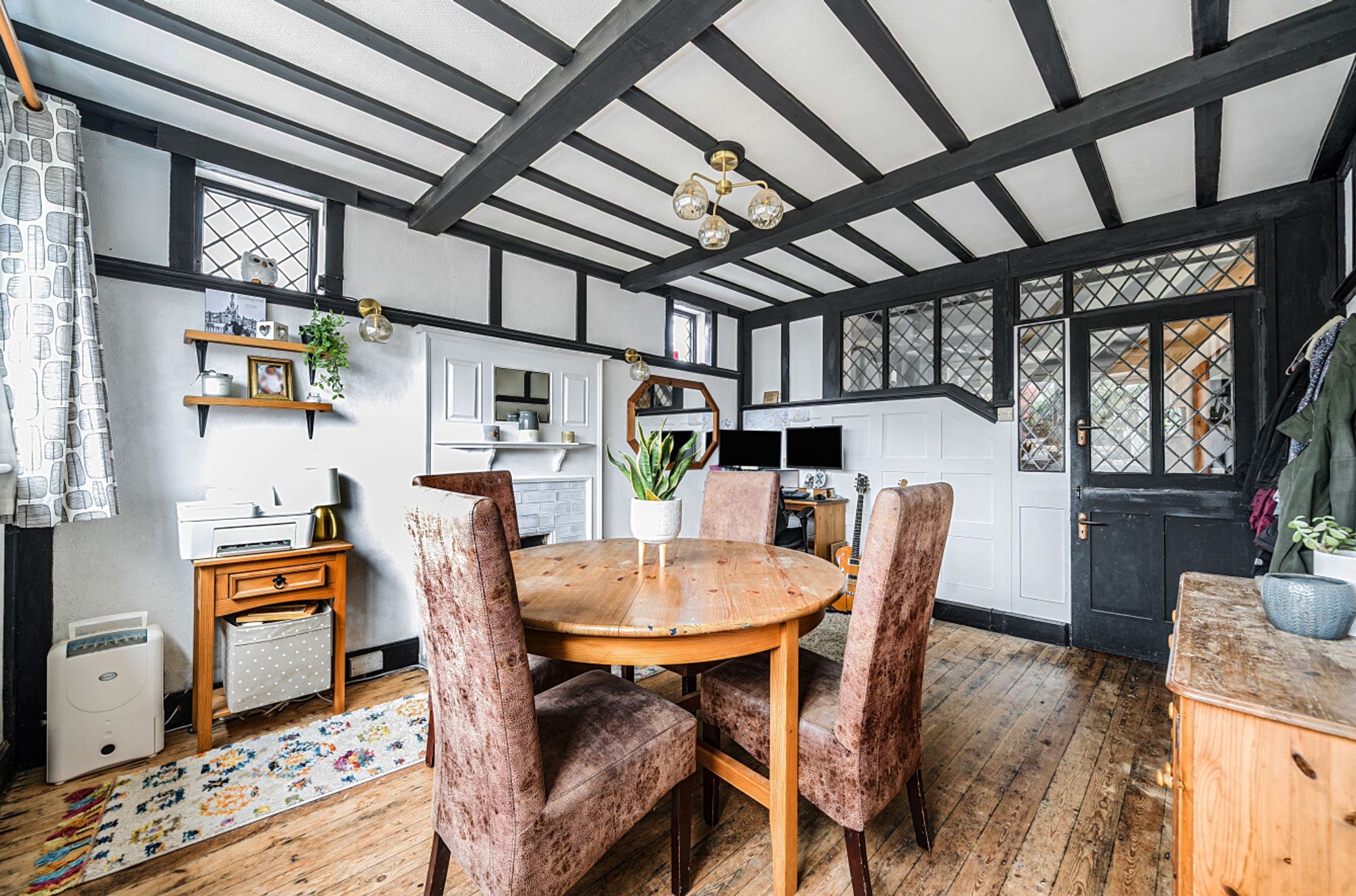 The front door opens onto a lovely entrance hall which opens to one of the highlights of this home, a gorgeous reception room featuring a biofuel log burner, wooden floors and French door opening to the garden. There is also a lovely dining room with wooden floors and attractive, exposed wooden beams and leaded light windows. There is also a stunning contemporary kitchen/breakfast room with comprehensive storage units, wooden work tops and a central island.