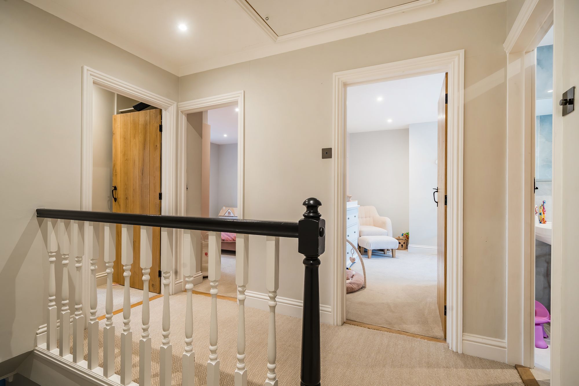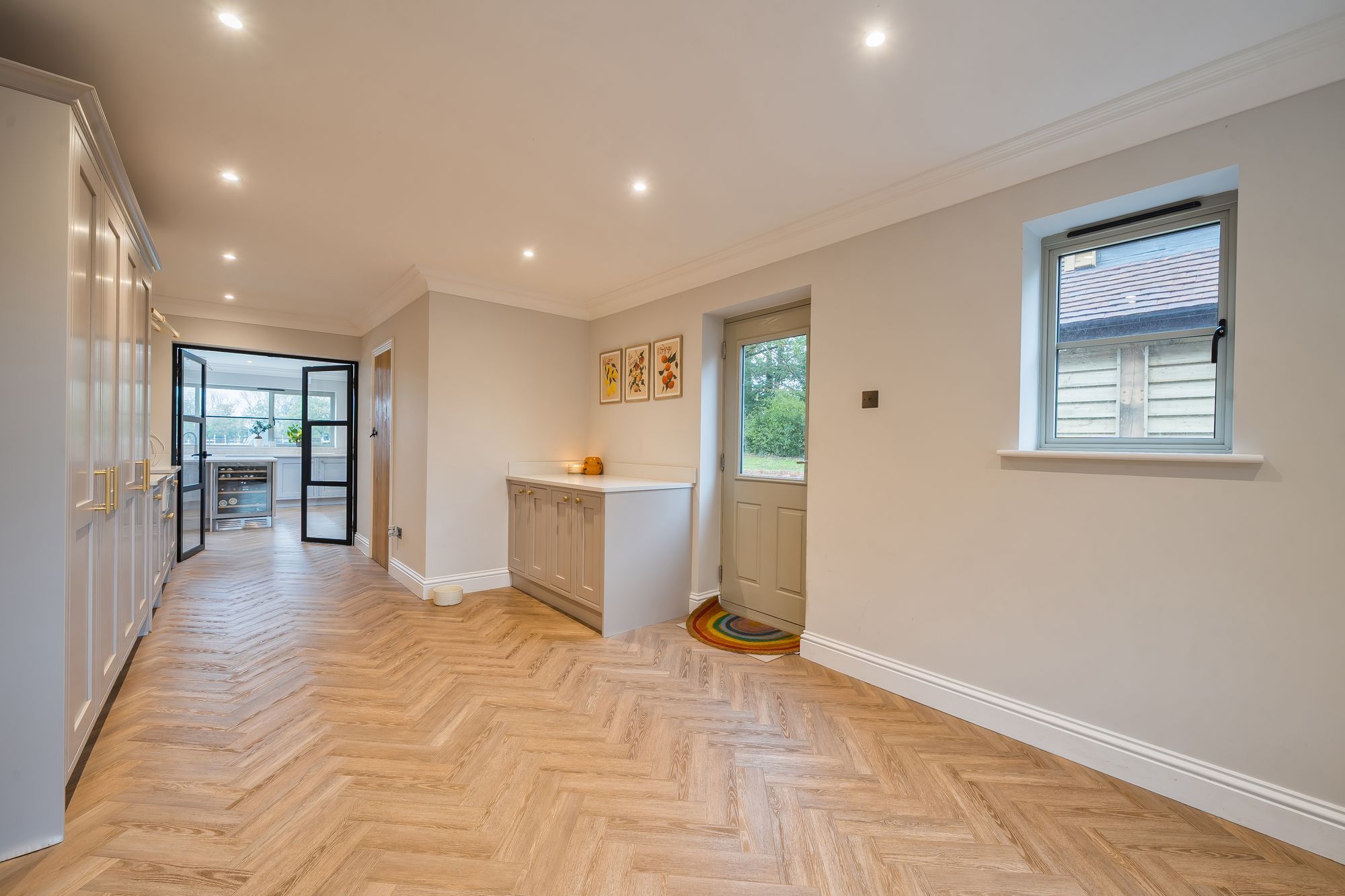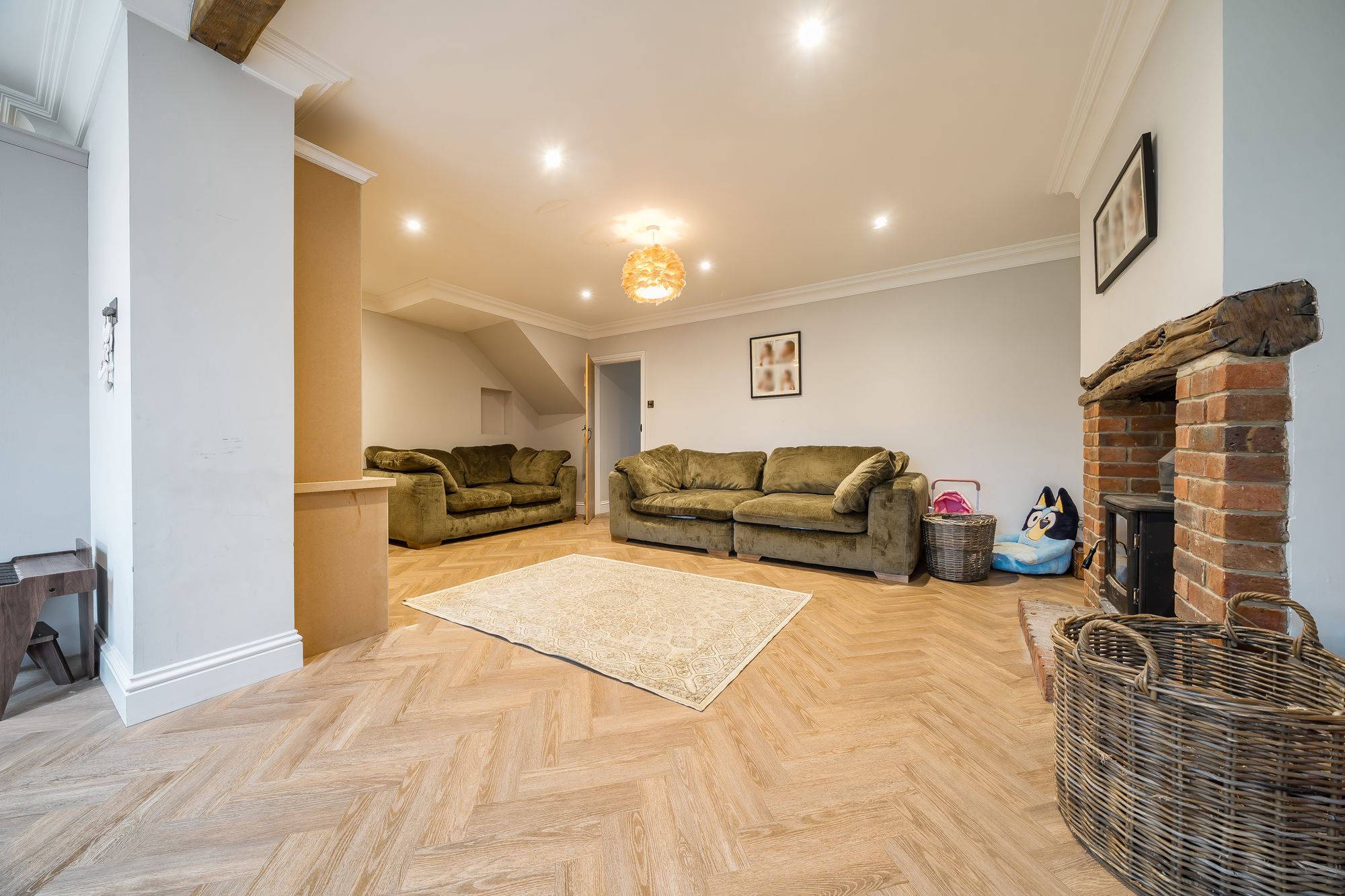 Internally the heart of the home, the Hamilton Stone Design bespoke kitchen, is equipped with a Rangemaster, ample storage cupboards and drawers, space for an American fridge freezer, a quartz worksurface, and a Quooker tap providing boiling, sparkling, and filtered water. The open plan kitchen and reception space flows effortlessly into a dining area with French doors to the garden, snug with a woodburner and bespoke media wall, and another reception room ideal for a formal sitting room or playroom. Additional highlights of this property include a large utility room with storage, a ground floor shower room, three double bedrooms on the first floor, a fourth single bedroom or dressing room, a refitted family bathroom, an en-suite shower room to the principal bedroom, underfloor heating on the ground floor, Sonos surround sound in the kitchen and reception space, and two lantern roofs in the kitchen.