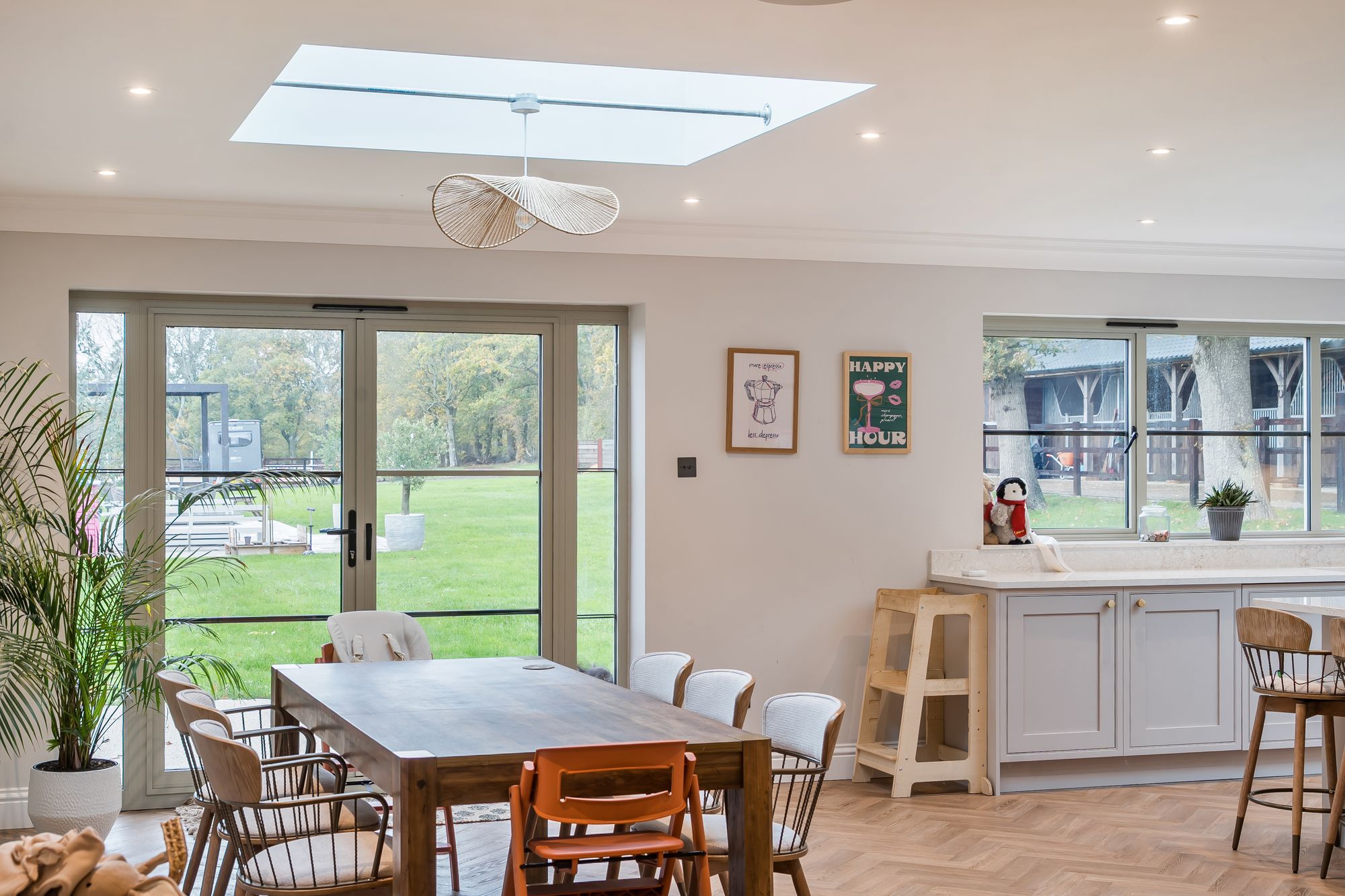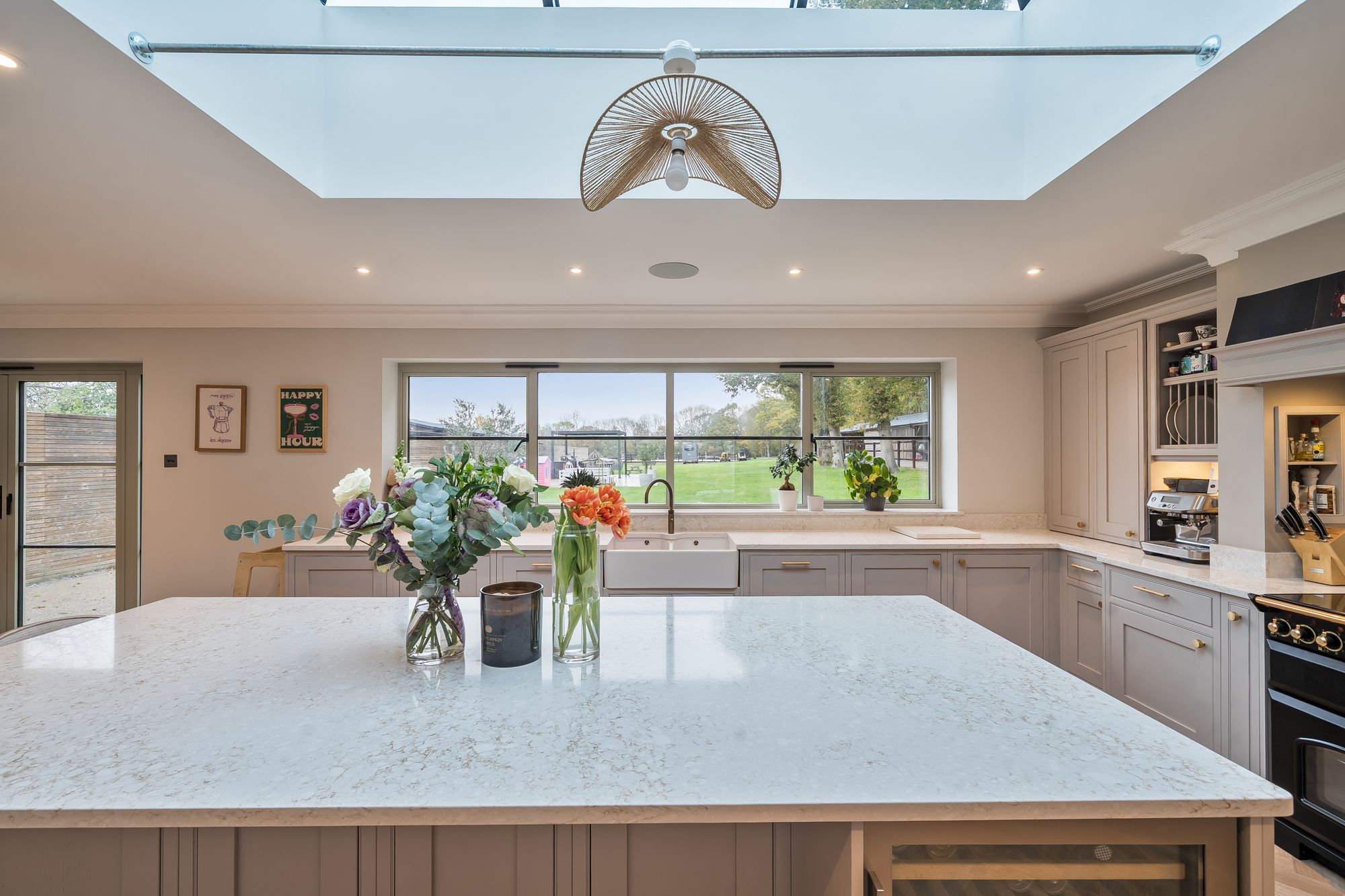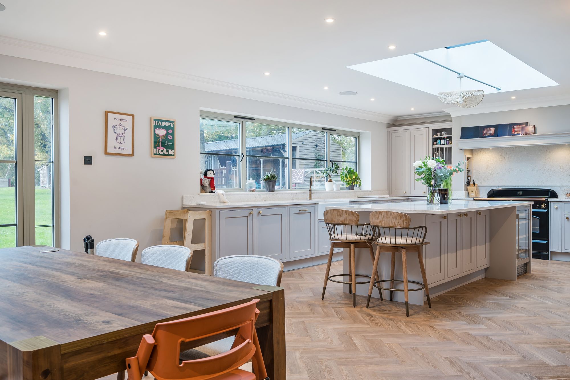 Internally the heart of the home, the Hamilton Stone Design bespoke kitchen, is equipped with a Rangemaster, ample storage cupboards and drawers, space for an American fridge freezer, a quartz worksurface, and a Quooker tap providing boiling, sparkling, and filtered water. The open plan kitchen and reception space flows effortlessly into a dining area with French doors to the garden, snug with a woodburner and bespoke media wall, and another reception room ideal for a formal sitting room or playroom. Additional highlights of this property include a large utility room with storage, a ground floor shower room, three double bedrooms on the first floor, a fourth single bedroom or dressing room, a refitted family bathroom, an en-suite shower room to the principal bedroom, underfloor heating on the ground floor, Sonos surround sound in the kitchen and reception space, and two lantern roofs in the kitchen.